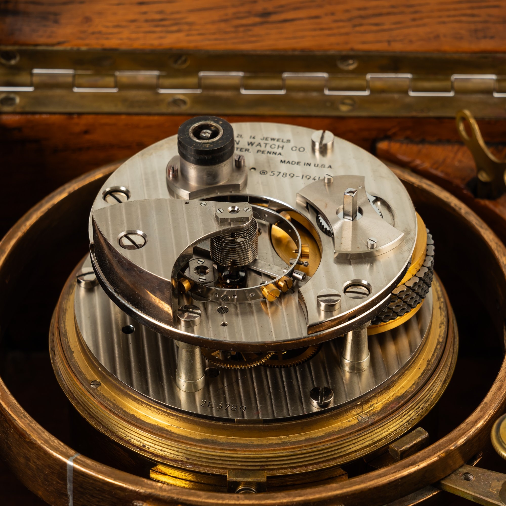 The two-tier case with hinged glazed cover, brass bowl and gimbals, with screwed bezel and bevelled glass, 4 1/4in circular silvered dial, signed, numbered and dated, with blued steel hands and subsidiaries for state of wind and seconds, the nickel-plated signed movement numbered 5789-1941 with chain fusée, maintaining power, compensated freesprung balance with Earnshaw type detent escapement