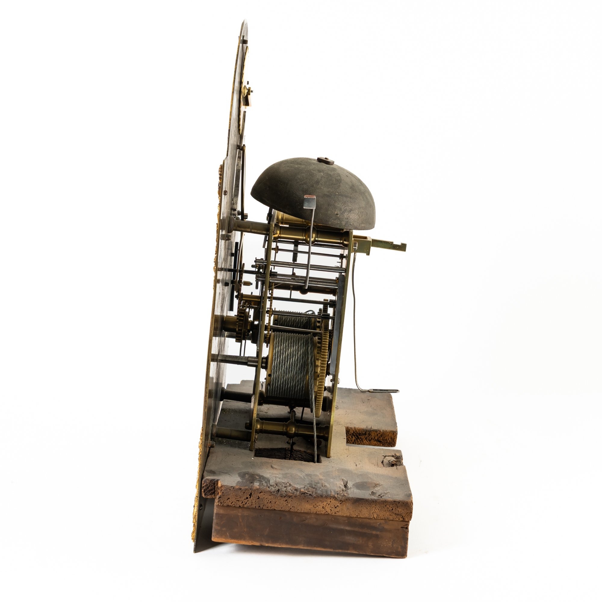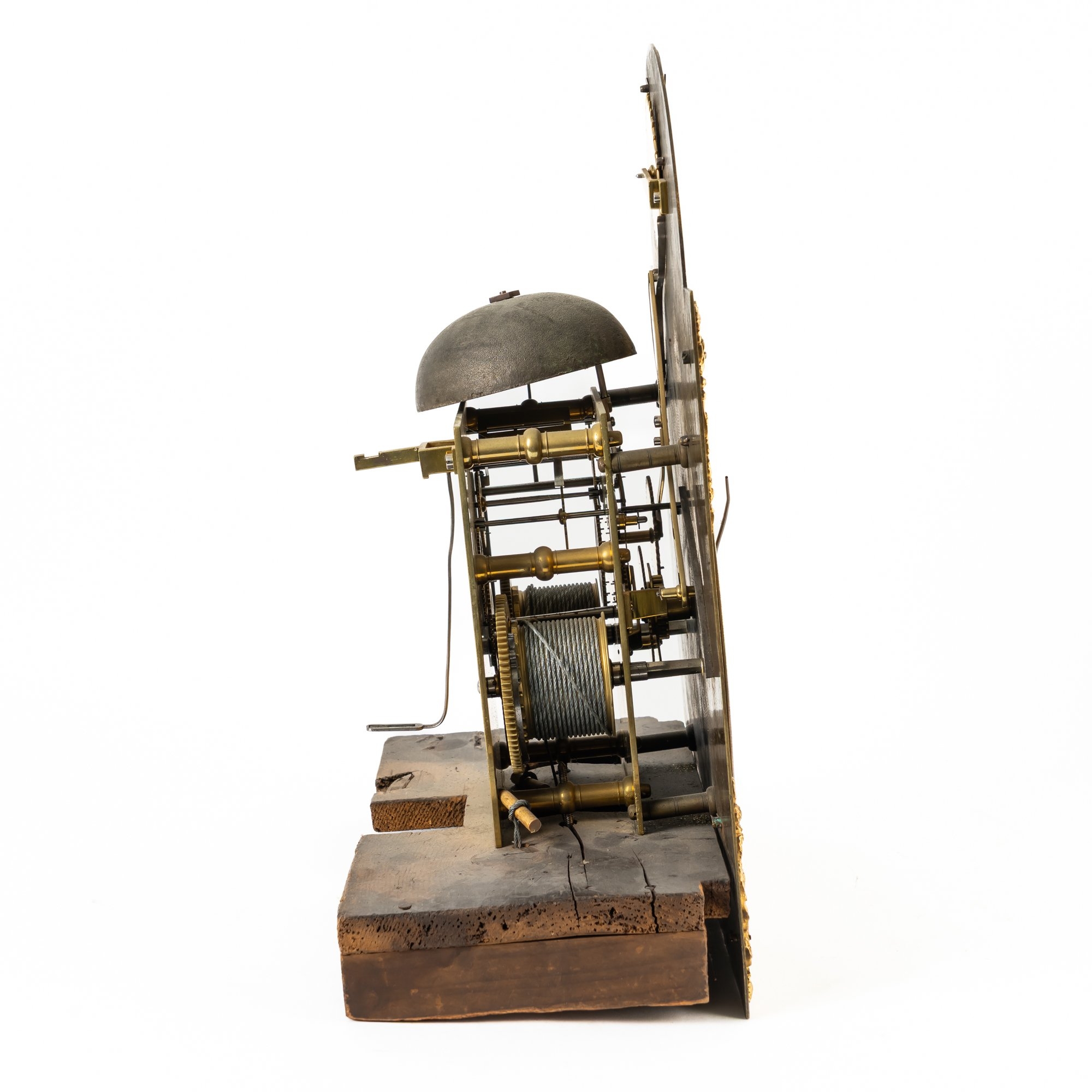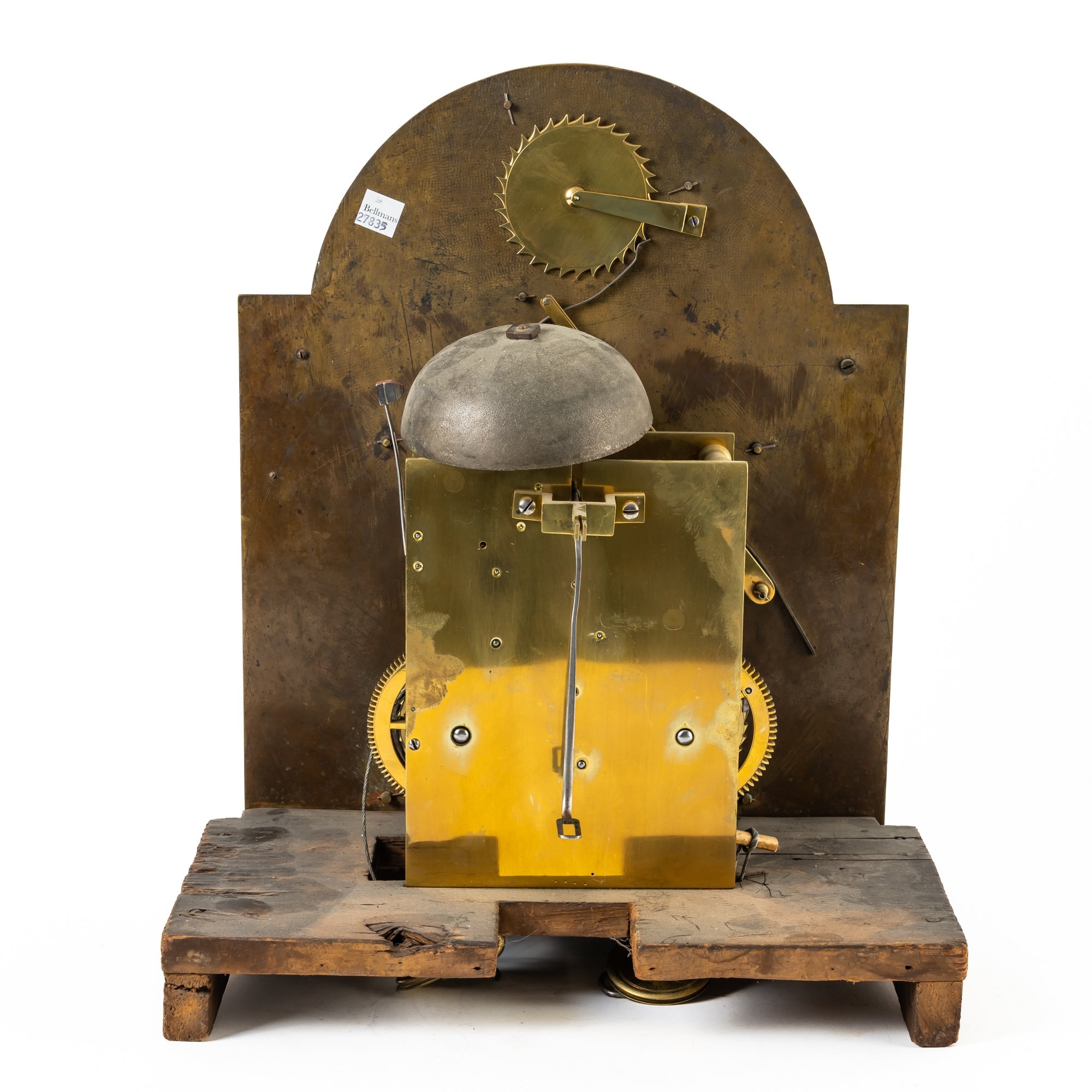 With winding crank key, flat brass rod and brass bob pendulum and a pair of heavy month-going brass-cased weights. Two case keys.