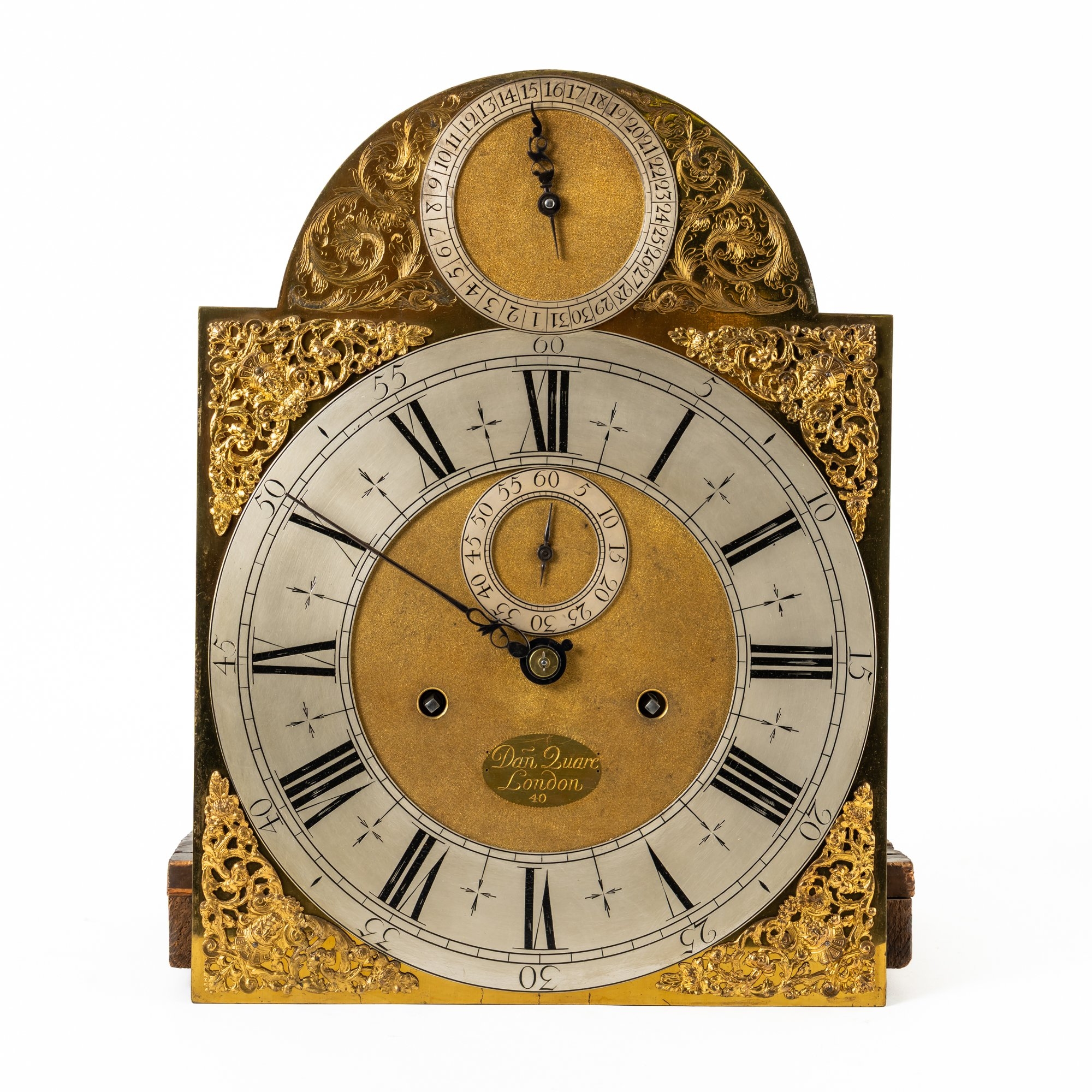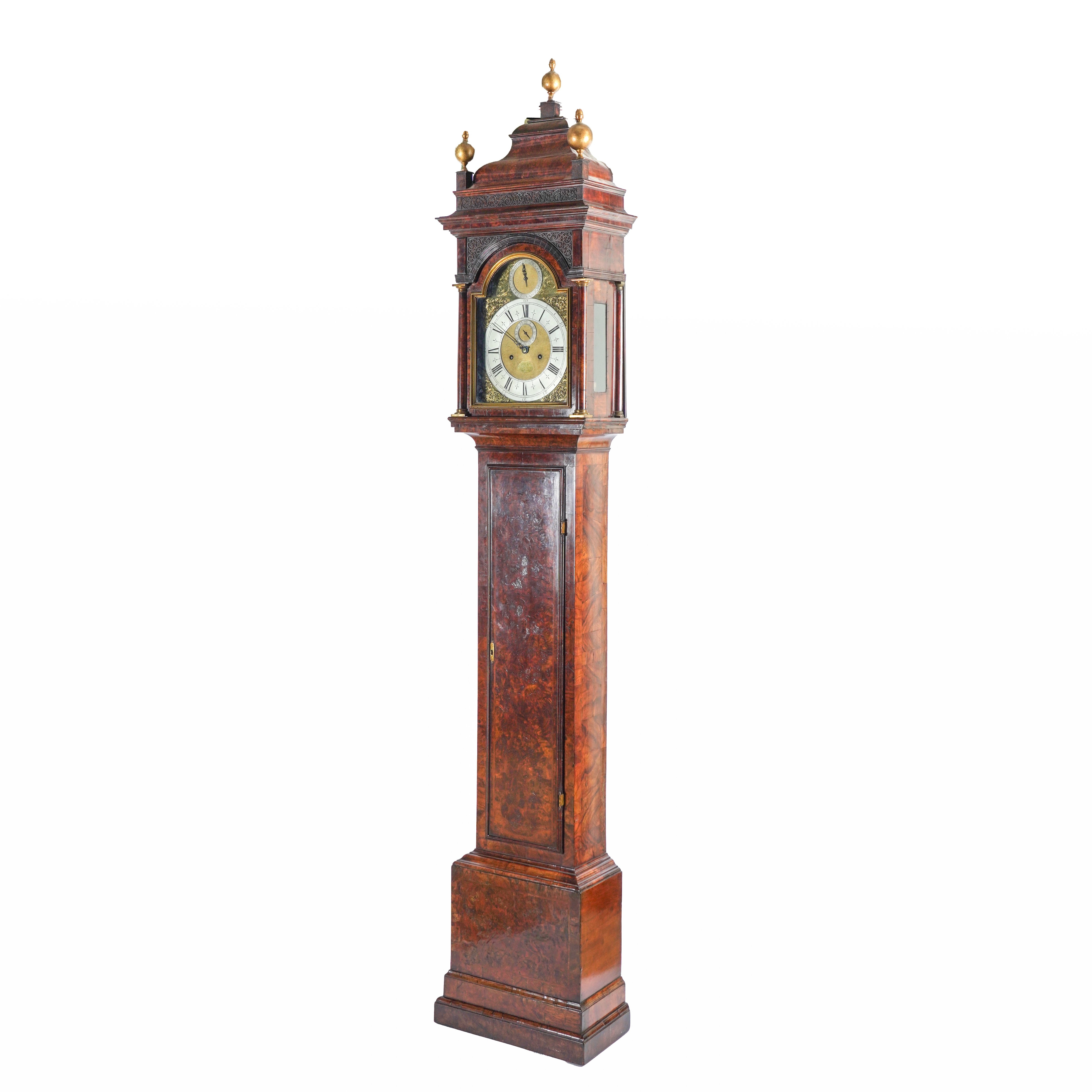 The case with three later giltwood finials surmounting the elaborate hood above fretwork rectangular panel, moulded projecting cornice with arched glazed door with finely-cast gilt-brass framing surround, flanked to each side by a gilt-capped three-quarter column, the sides each with a glazed panel and rear-quarter column, the trunk inset with a rectangular panel door outlined with a herringbone inlay, a brass engraved plaque to the inner back surface 'Restored by / J. Barnsdale & Son / 18, Brunswick Place, / Ely Road, London. / MDCCCXCIV.' on herringbone-outlined base and double stepped plinth; the 12in arched brass dial, with typical Quare style calendar ring to the arch, flanked by finely engraved foliate panels, the polished plate with Indian mask pierced spandrels, silvered chapter ring enclosing a matted centre with seconds subsidiary ring, finely cut blued steel hands and oval engraved signature panel Dan Quare / London 40 (with evidence of a later signature panel over), the twin train month-going movement with five finely turned columns, anchor escapement and hour rack strike on a bell
