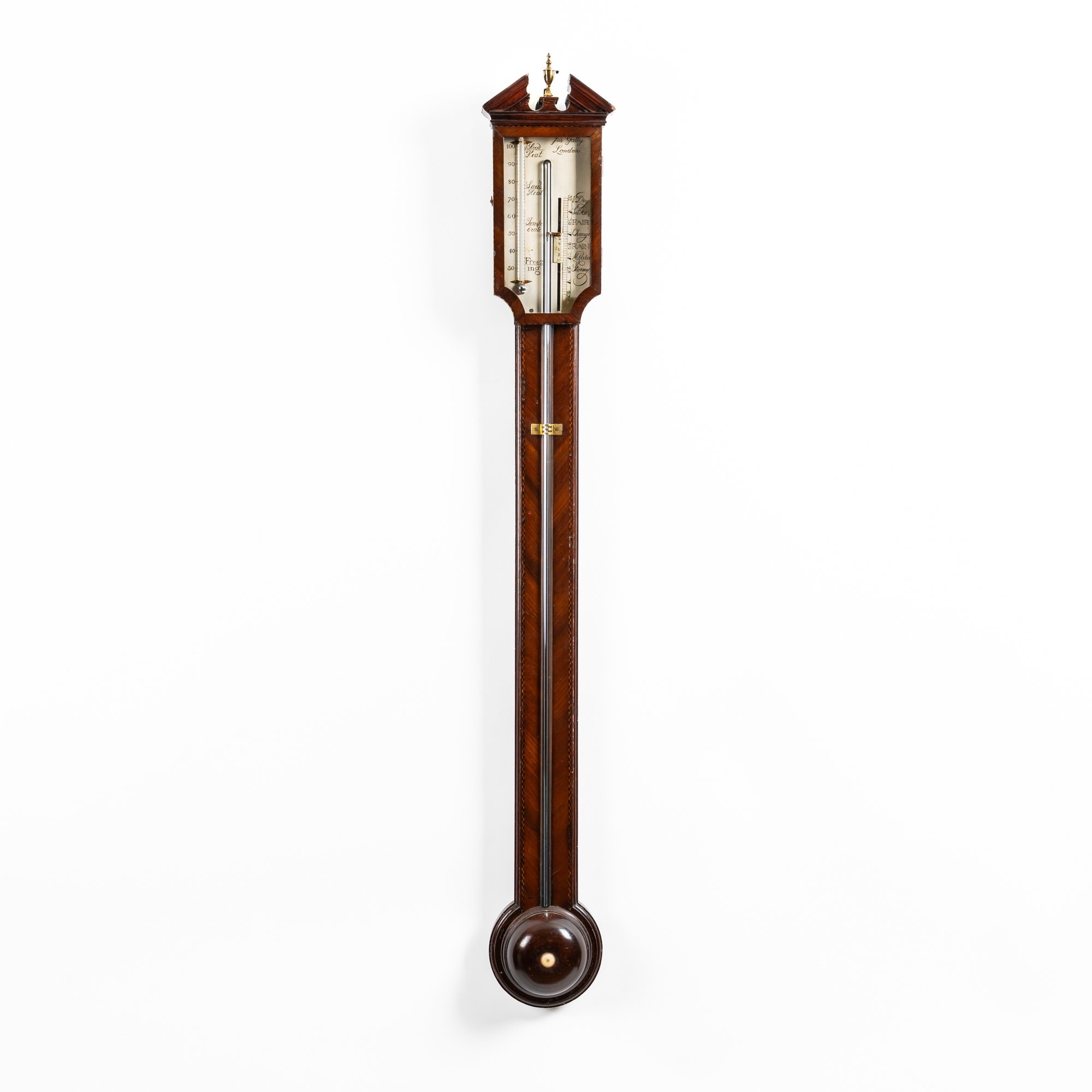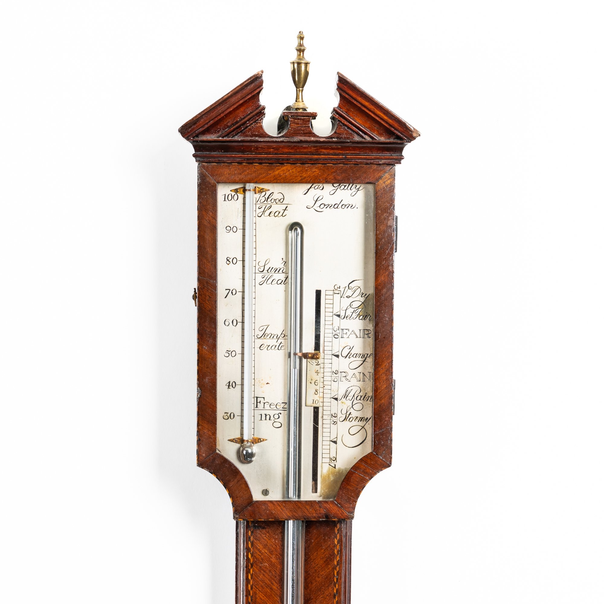 With an arched pediment above a silvered scale with vernier, the trunk with visible tube above a rounded reservoir