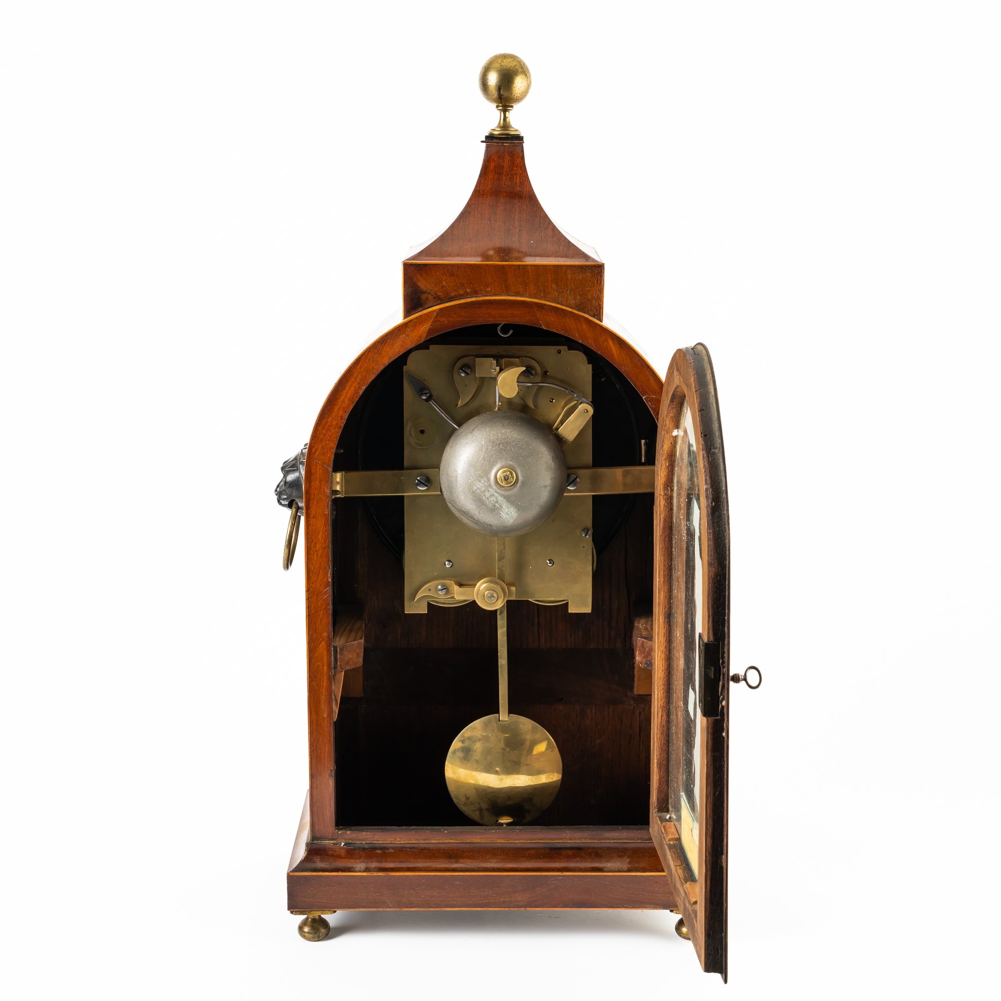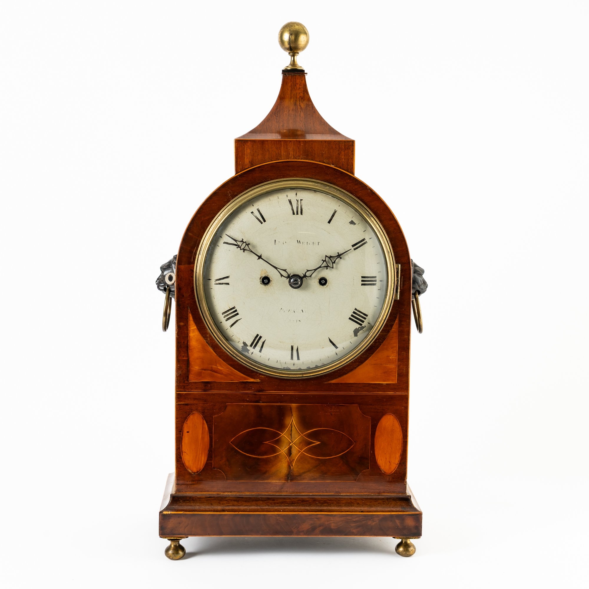 Surmounted by a brass finial above a spreading pediment, with arched case above glazed convex 8in white-painted dial with faintly inscribed Tho Wright / Dorking / 1818, pierced blued steel hands, the sides each with a lion mask above silk-lined arched fishscale grille panels, on a stepped base and four brass ball feet, the twin train gut fusée movement with anchor escapement and strike on a bell