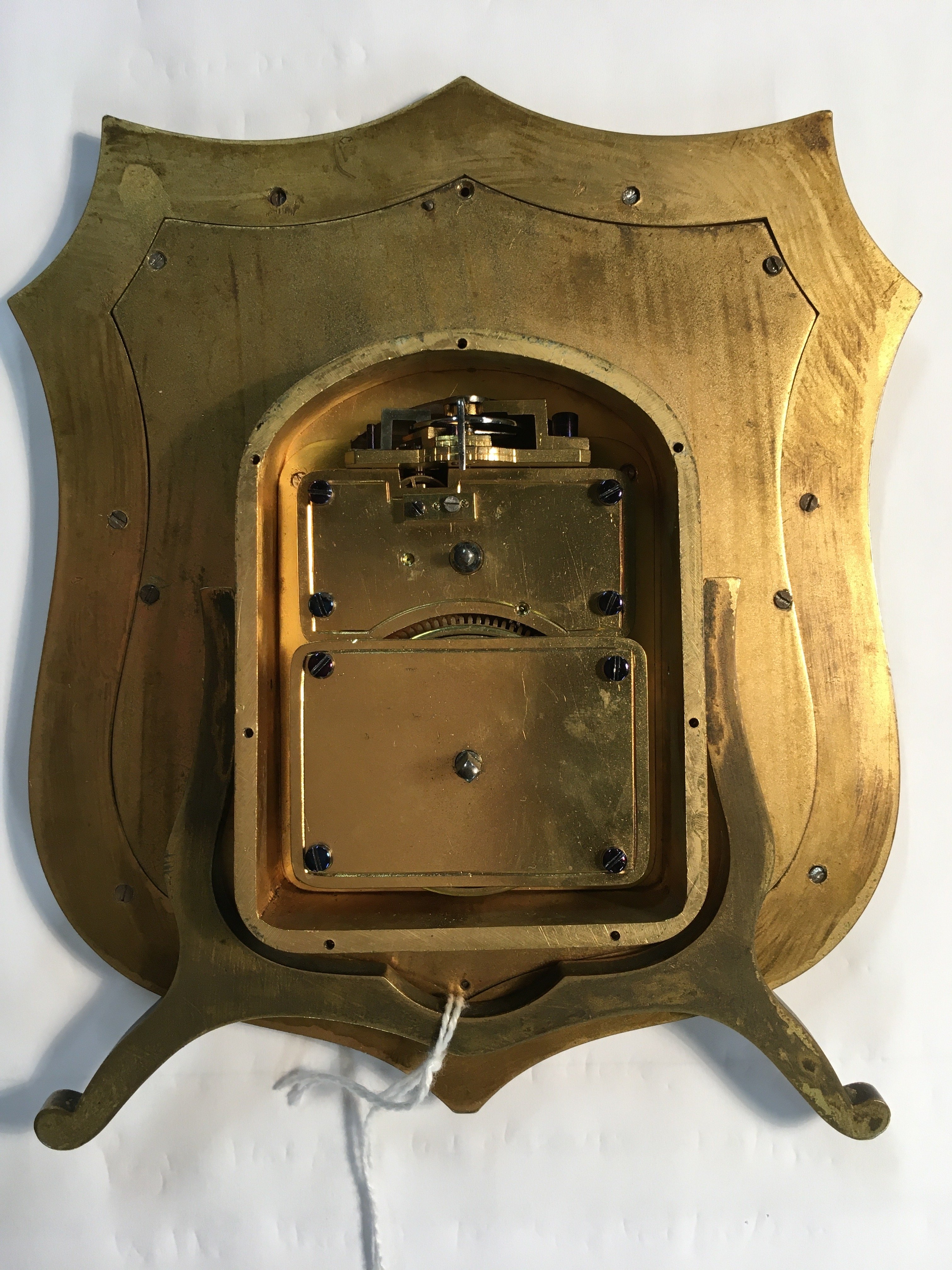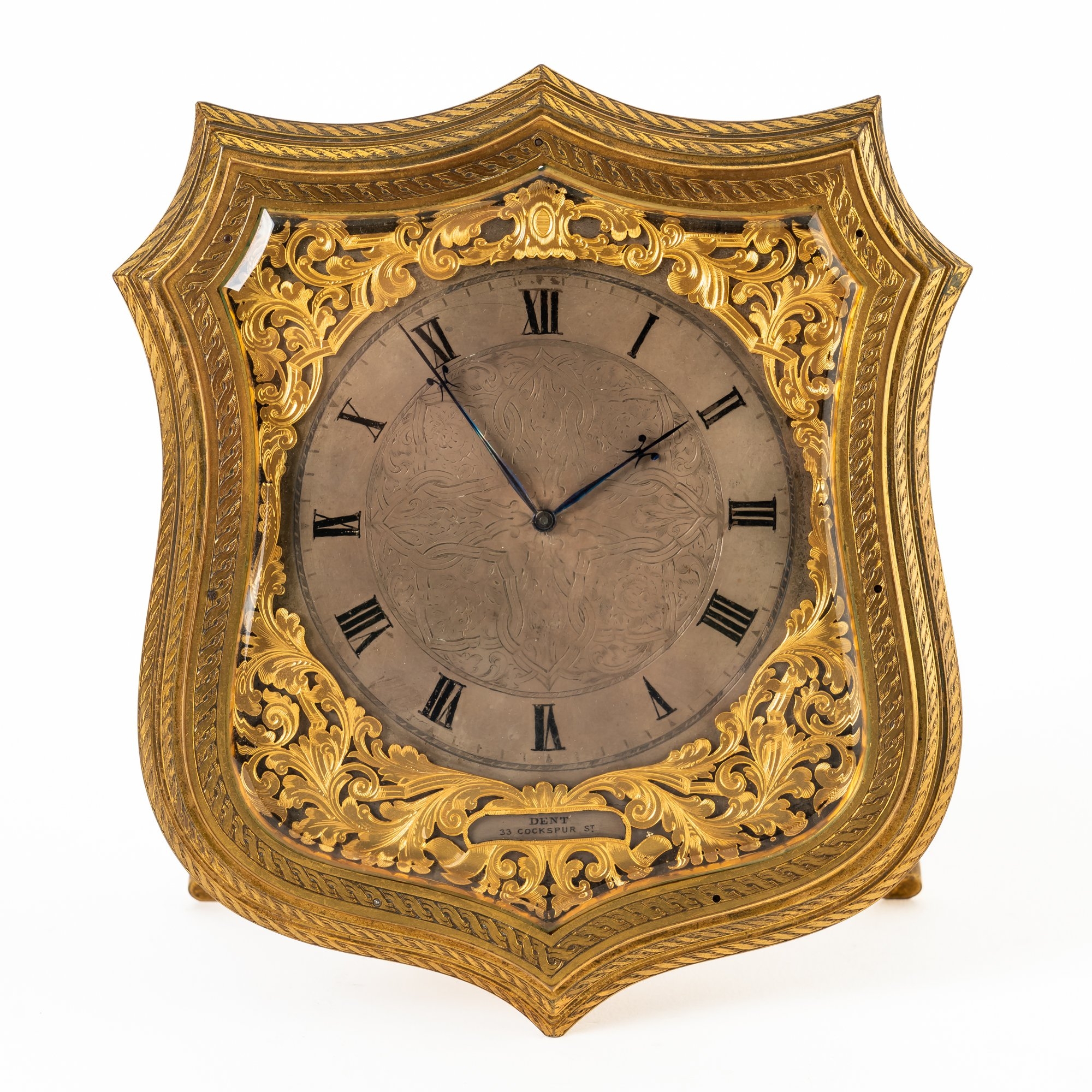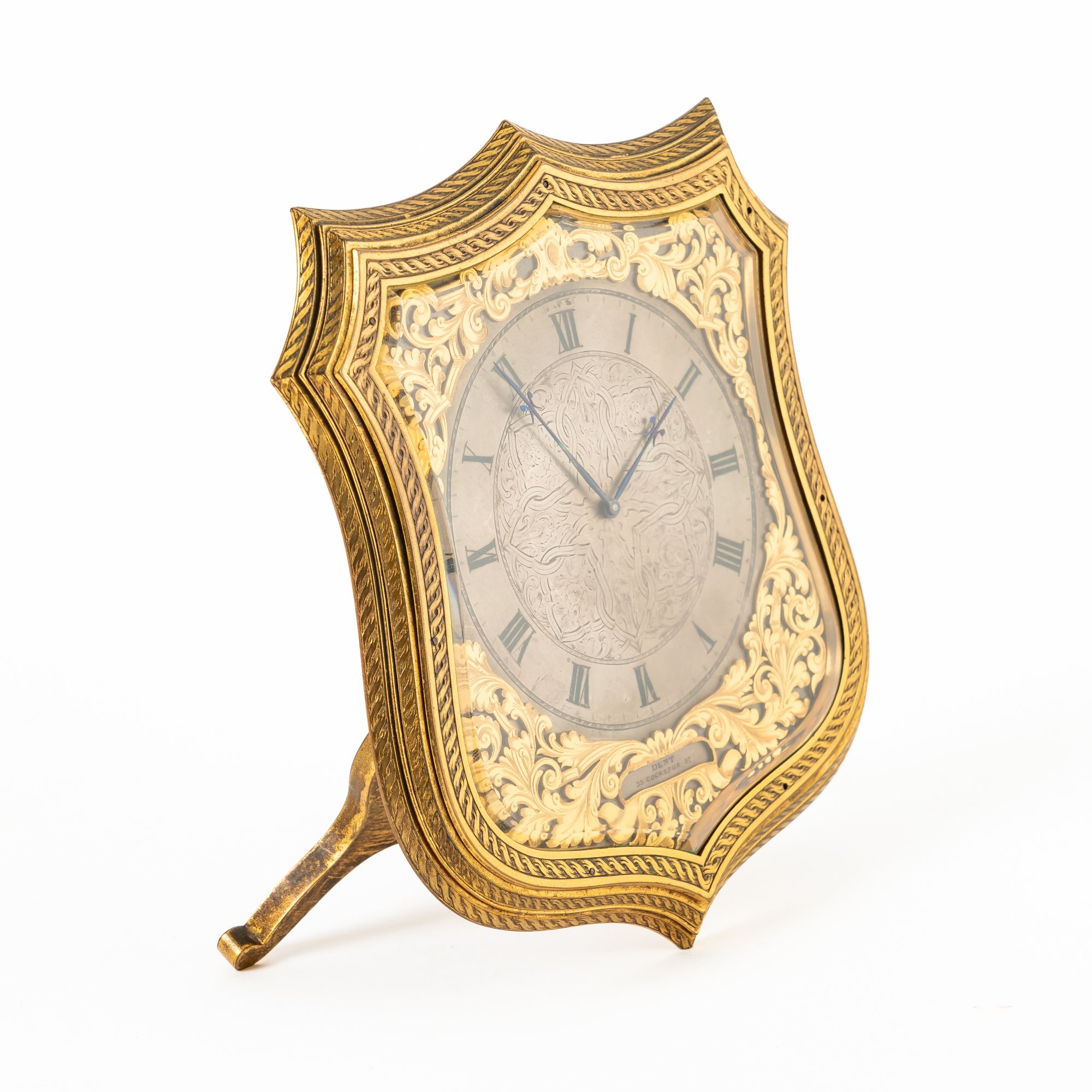 A GOOD VICTORIAN GILT-BRASS AND ENGRAVED SHIELD-SHAPED STRUT TIMEPIECE