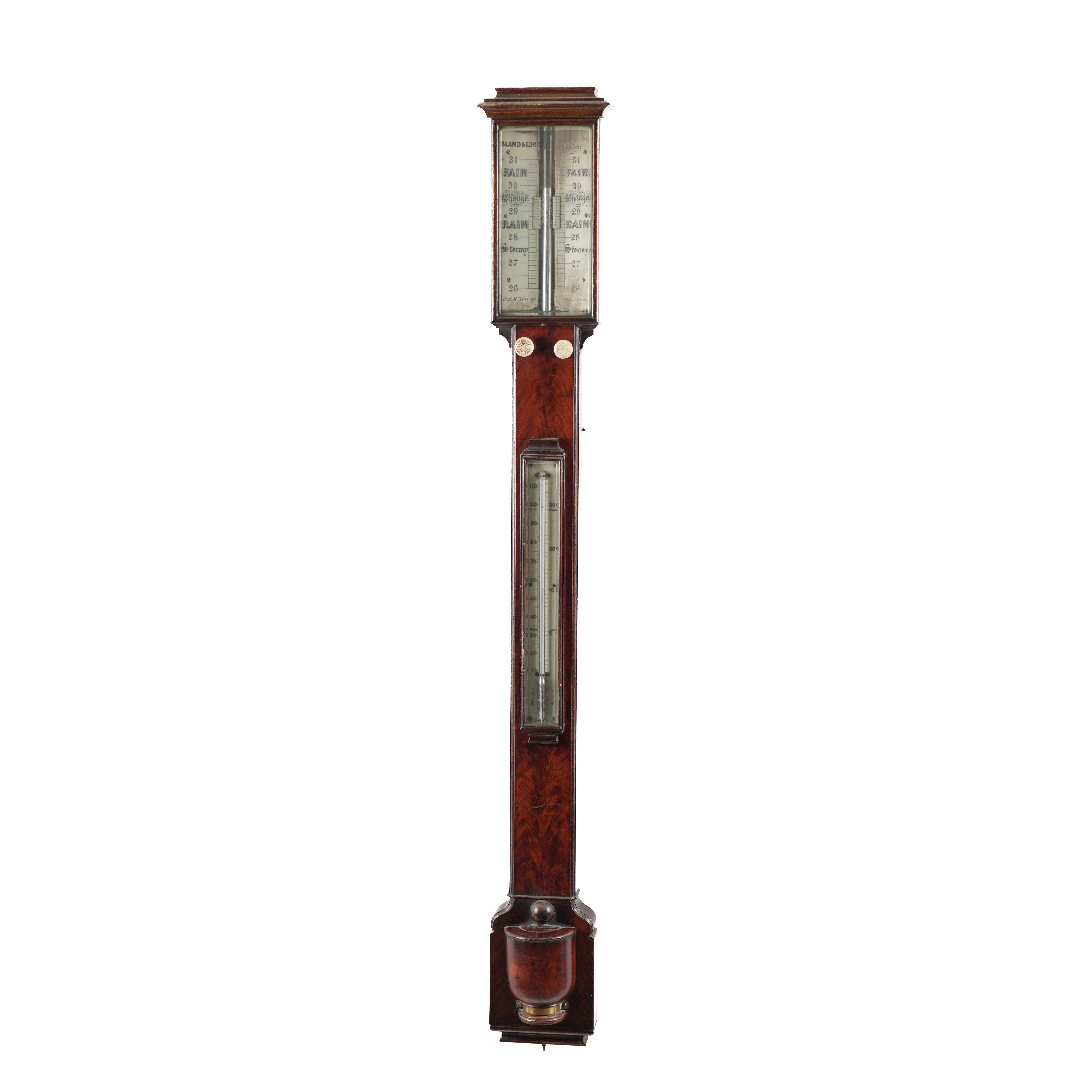 With stepped moulded pediment, bevelled glazed panel and engraved ivory scales, original thick glass Mercury-filled tube, above a well figured trunk, later fitted with a removable ivory scale glazed thermometer, held by a pair of polished brass screw heads, above a half turned cistern