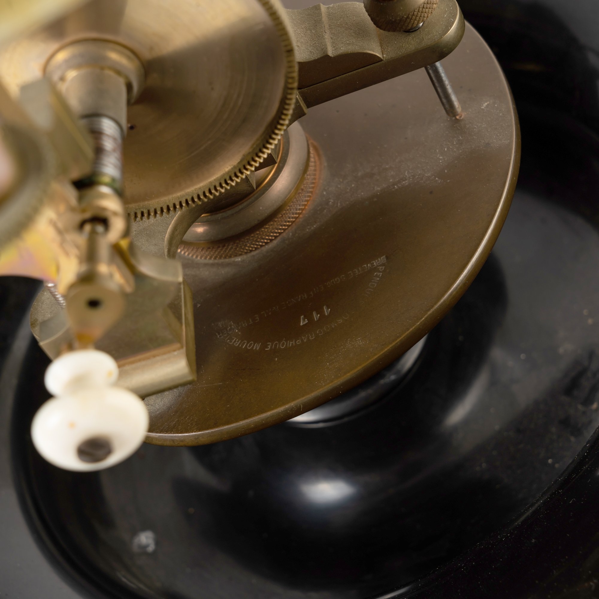 Surmounted by the globe, with printed inscription ‘GLOBE/ADOPTÉ/PAR LE CONSEIL DE L’UNIVERSITÉ/ Maison/DELAMARCHE/rue Serpente 25/Paris, with arrow hand above a painted ring showing the months and calibrated with a line for each day of each month, above a white enamel 5 1/2in dial with blued steel moon hands, the drum-shaped movement no 2433 with single train and Brocot deadbeat escapement, driving the world time mechanism, mounted on a plate stamped CH. HENARD & CIE / PARIS, also stamped in an arc PENDULE COSMOGRAPHIQUE MOURET / BREVETEE SGDG EN FRANCE & ETRANGER and numbered 117 to the centre, on a turned black marble dished base with stepped foot