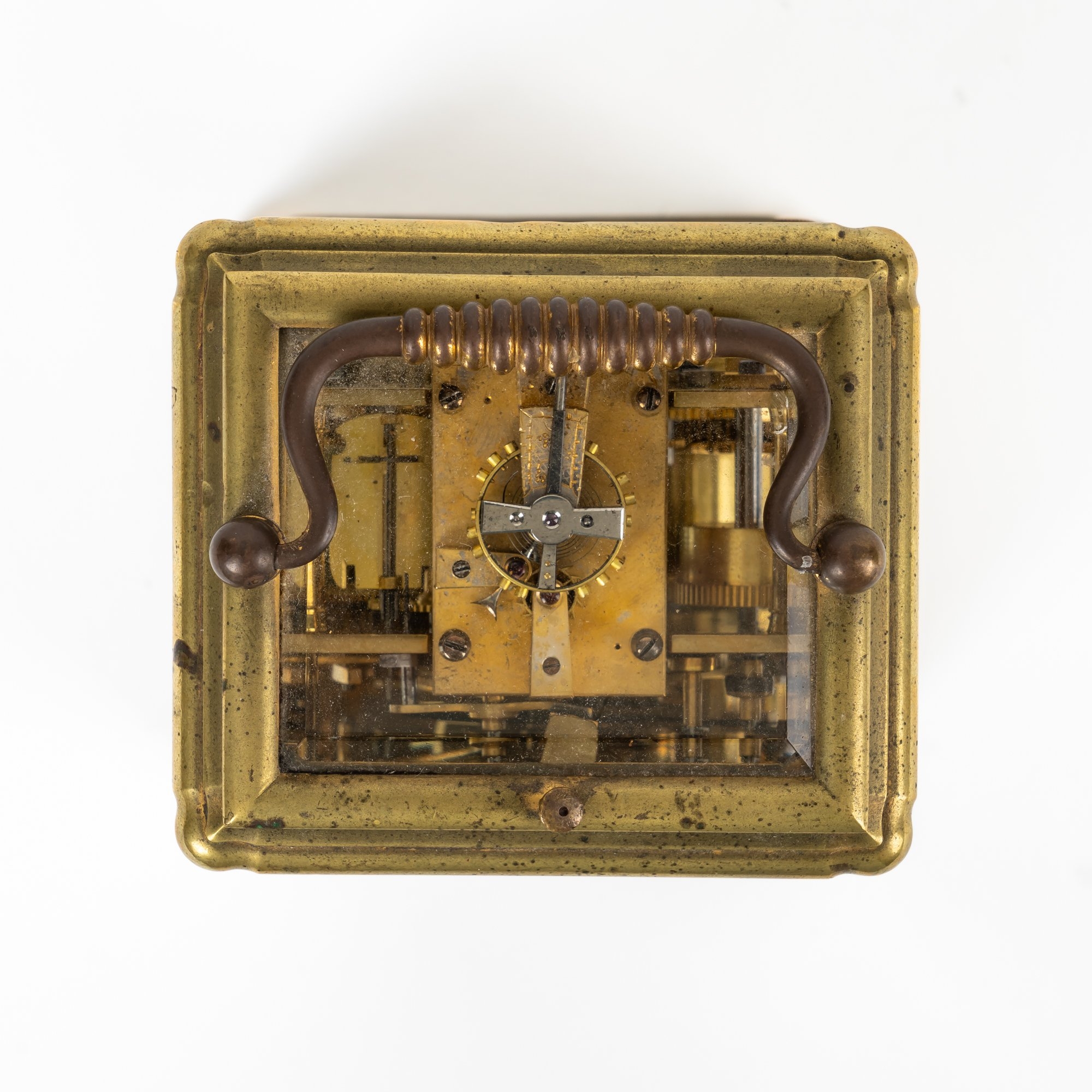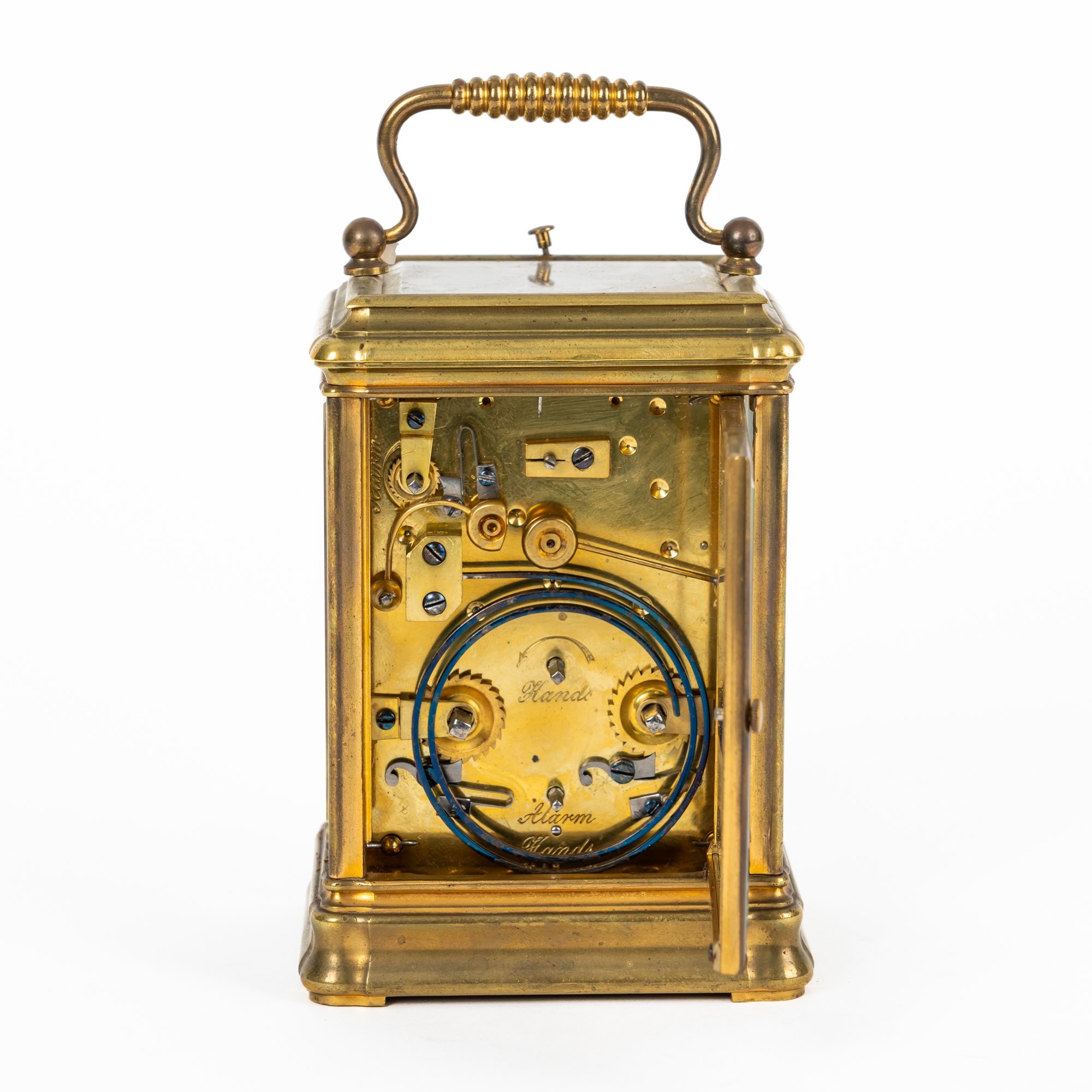With replaced handle above large rectangular top glass, white enamel dial with blued steel moon hands and alarm subsidiary, the twin train movement with silvered platform lever escapement, striking and repeating on a blued steel coiled gong