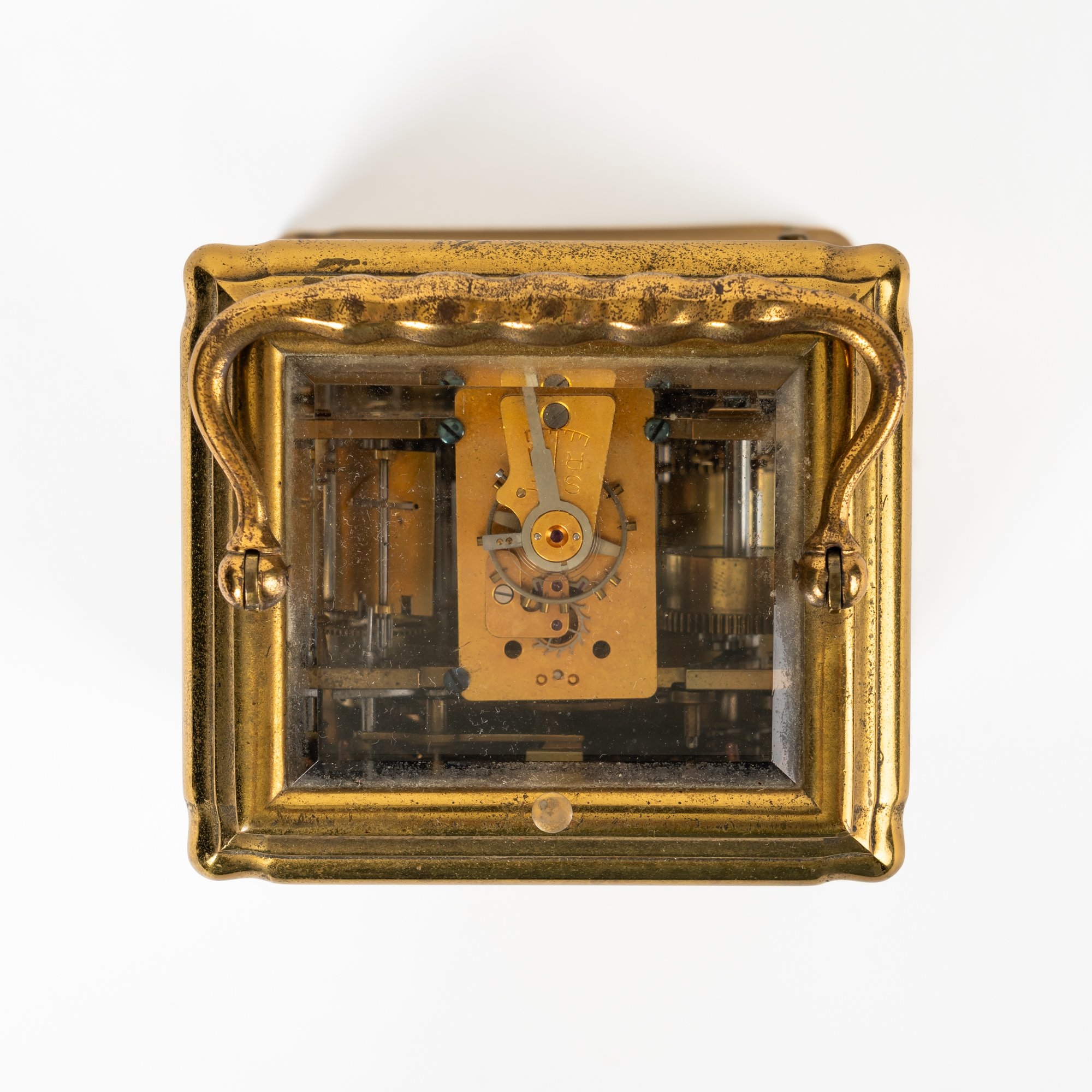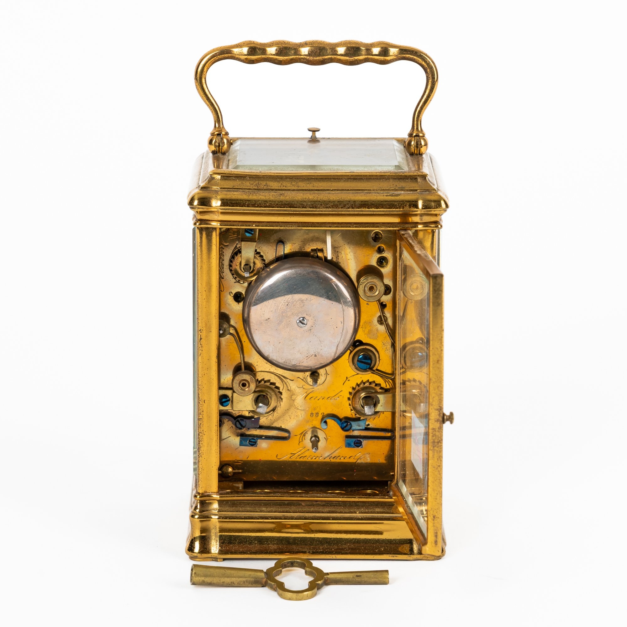 With a moulded pivotted handle above large bevelled glass top panel, the front, back and sides each with a bevelled glass panel, the white enamel dial (restored) with blued steel moon hands above an alarm subsidiary, within a foliate engraved mask, the twin train movement, no. 882, with push/repeat button, modern replaced platform, striking the hour and half on a bell