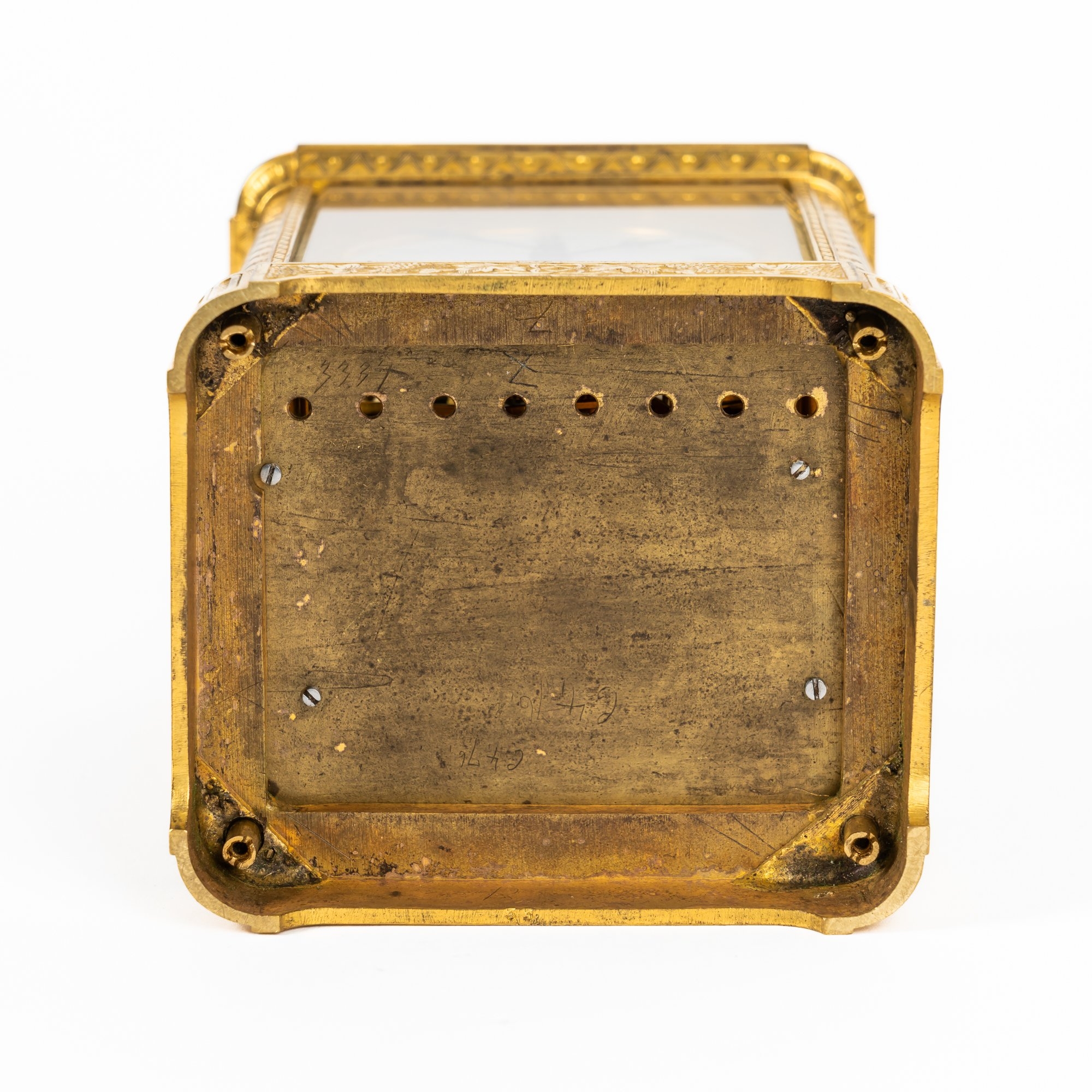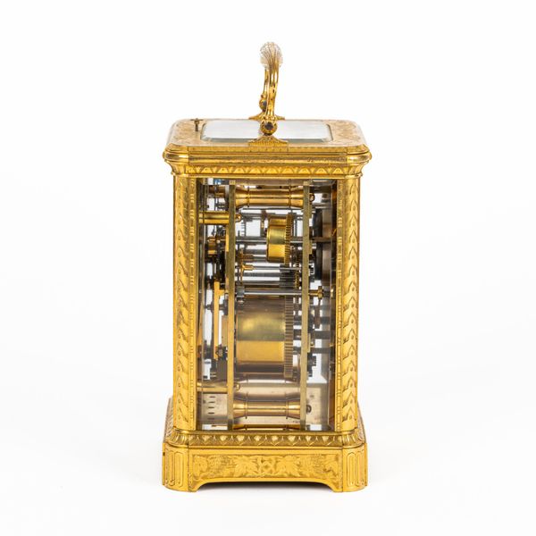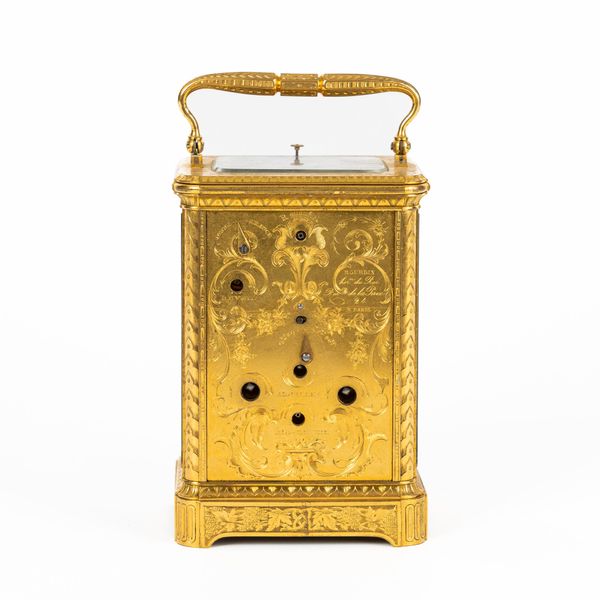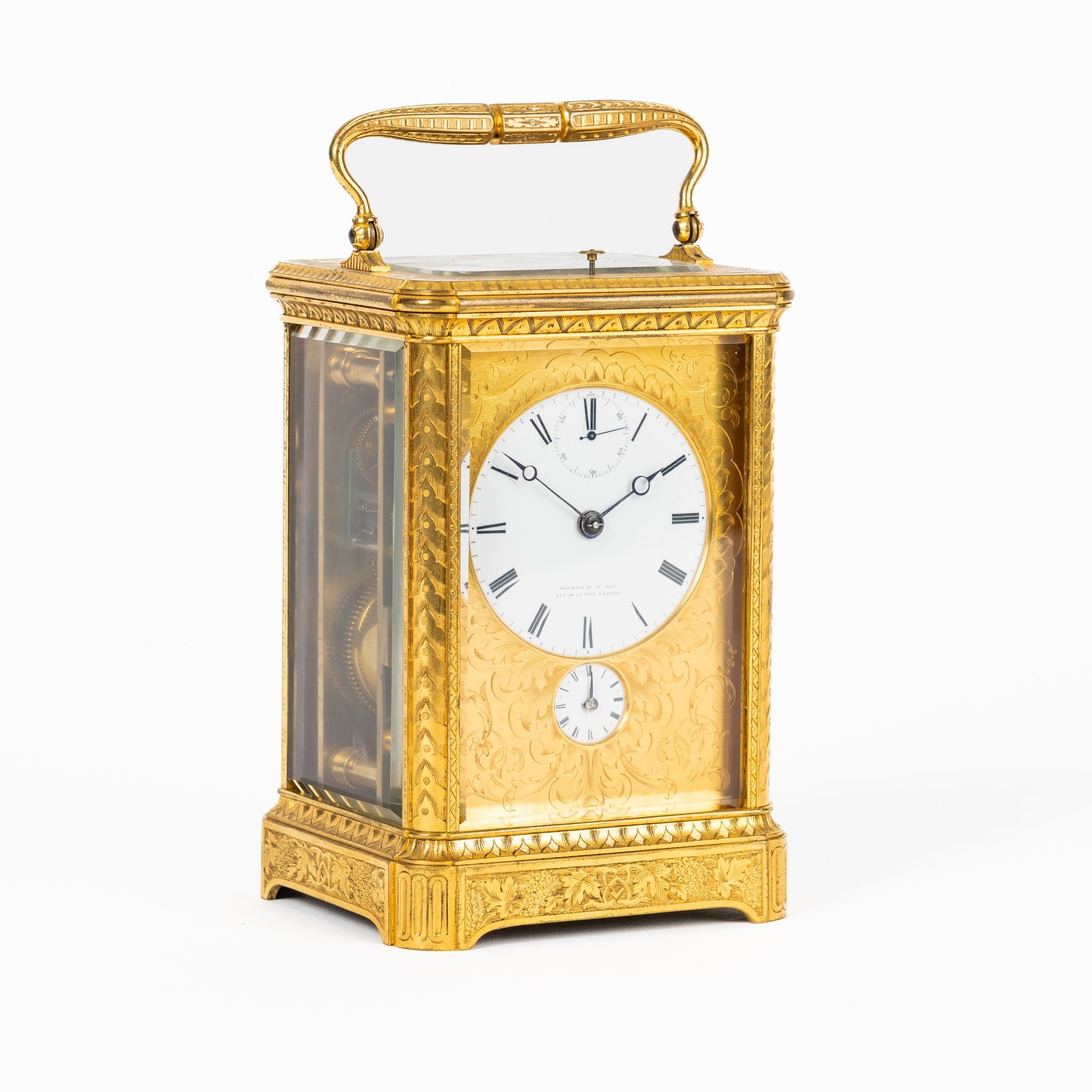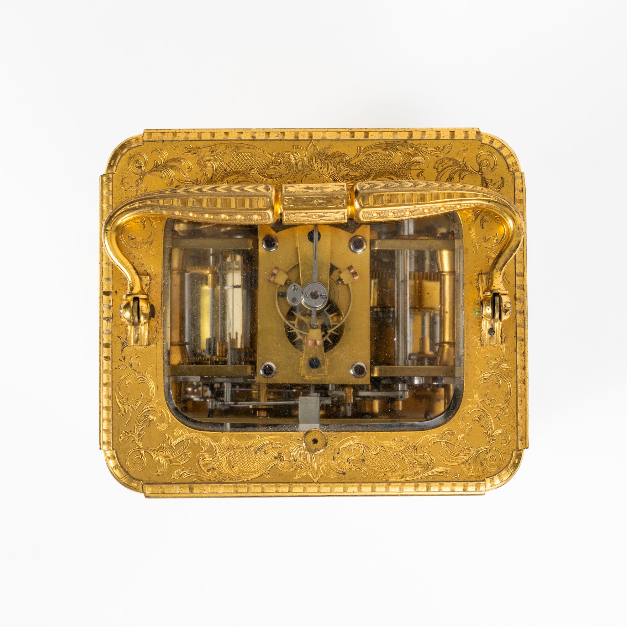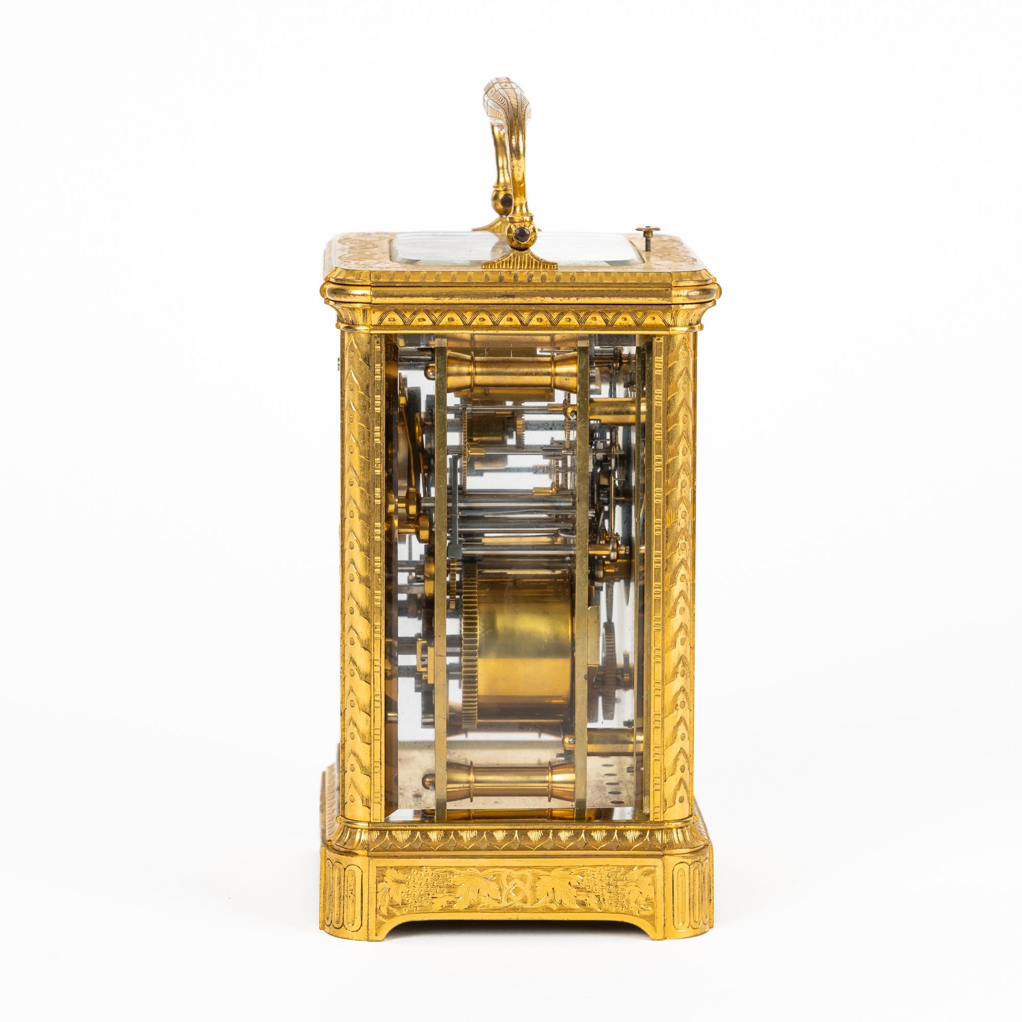The case finely engraved all over with foliage, with original gilding, drop handle above large bevelled glass panel showing the escapement below, the front and sides each with a bevelled glass panel, the dial with finely engraved gilt mask enclosing signed white enamel dial BOURDIN Hr DU ROI / RUE DE LA PAIX 24, PARIS with seconds dial at the XII and alarm subsidiary below the VI, with signed shuttered back panel, and selectors for SONNE/ SILENCe and Gde SONie and Pte SONie, winding and hand-setting apertures and with alarm setting and winding apertures, the twin train movement with original gilt platform, bi-metallic balance with three weights, duplex escapement, striking and repeating the hours and quarters on two bells