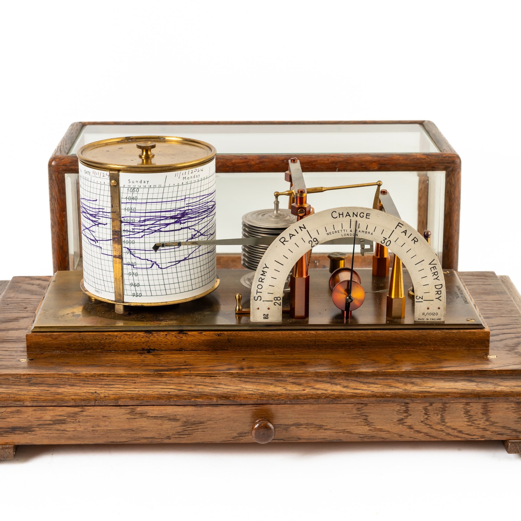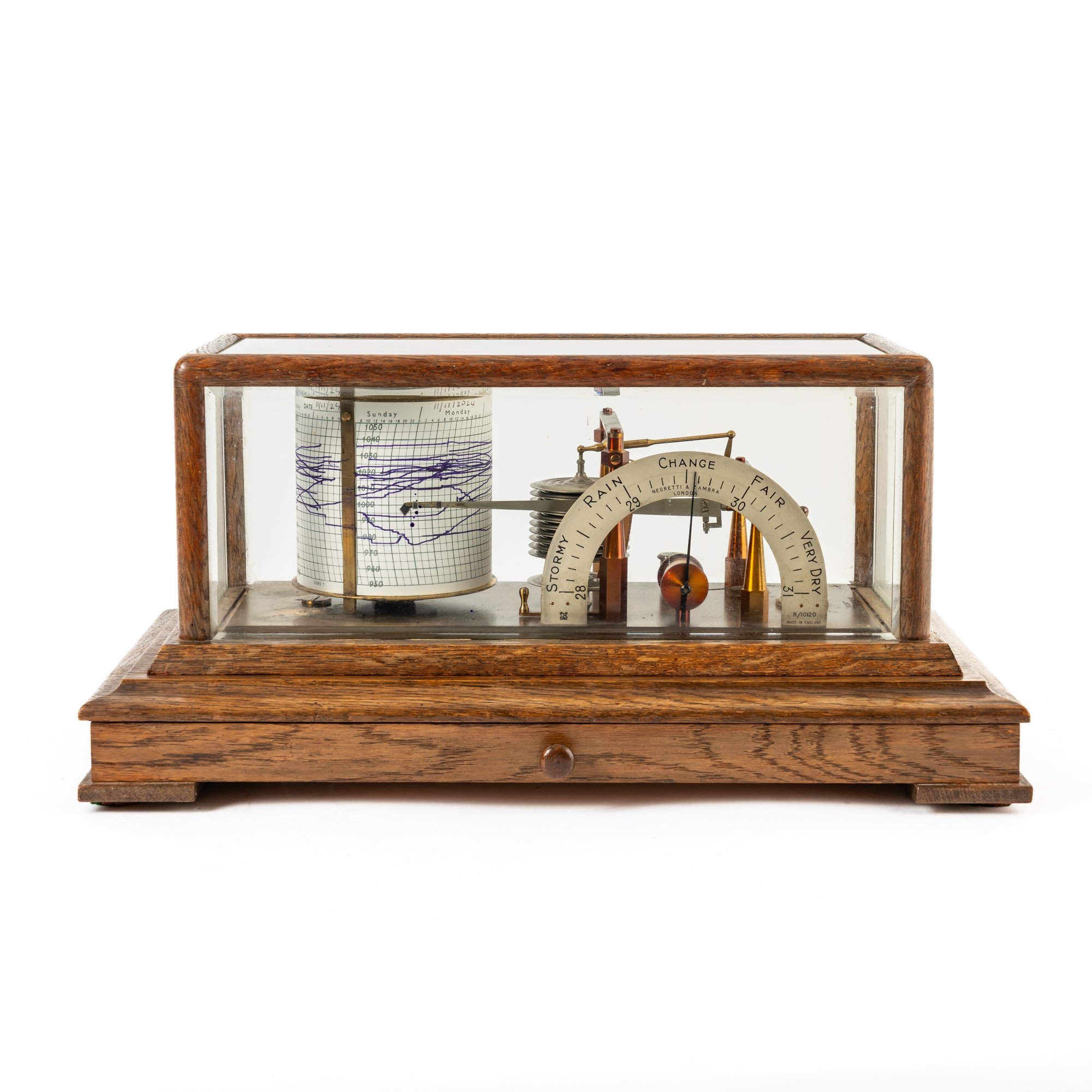 With bevelled glass plates, the mechanism with a silvered scale showing the barometric pressure in inches, drum for recording paper and pivoted ink pen, a drawer to the base for spare papers, on block feet