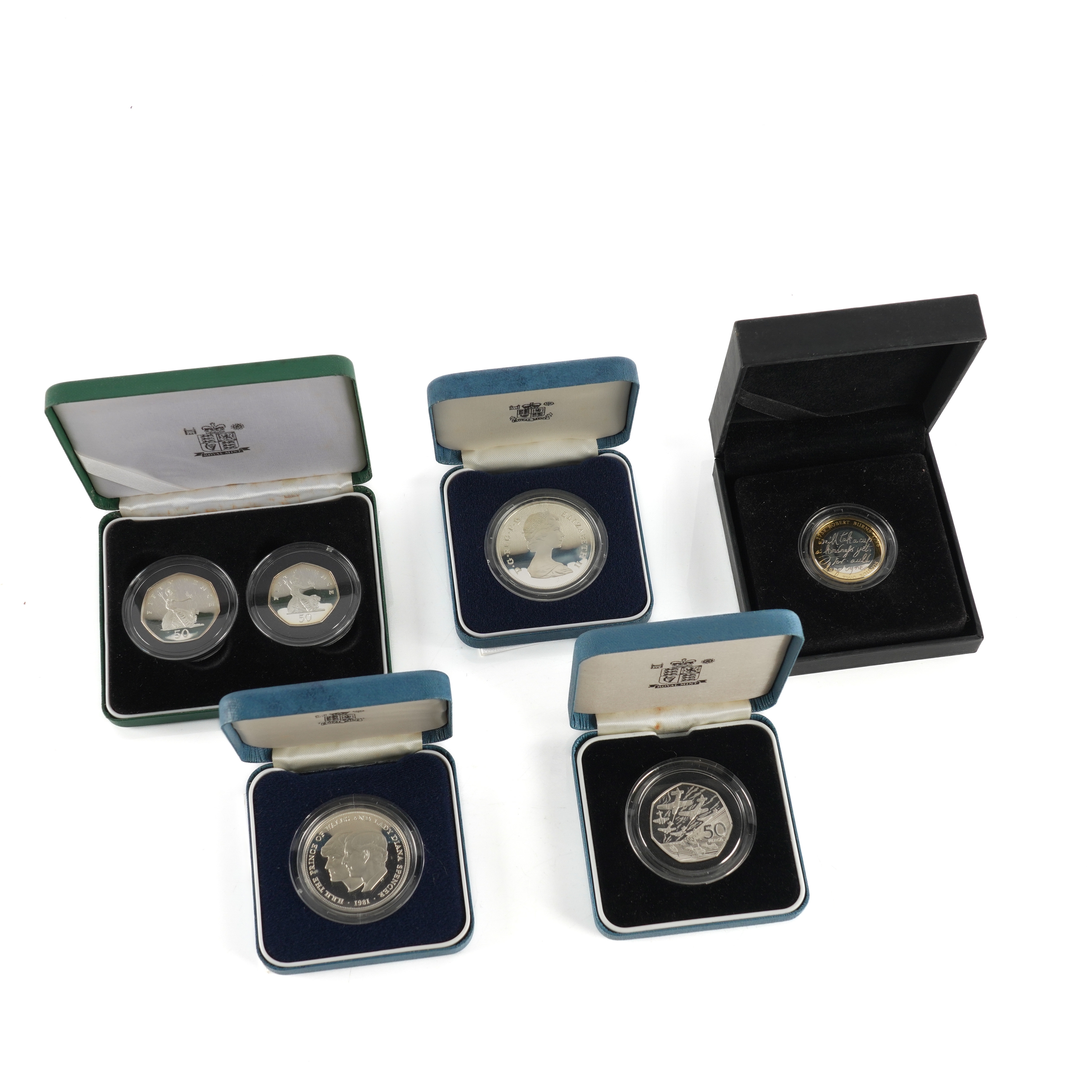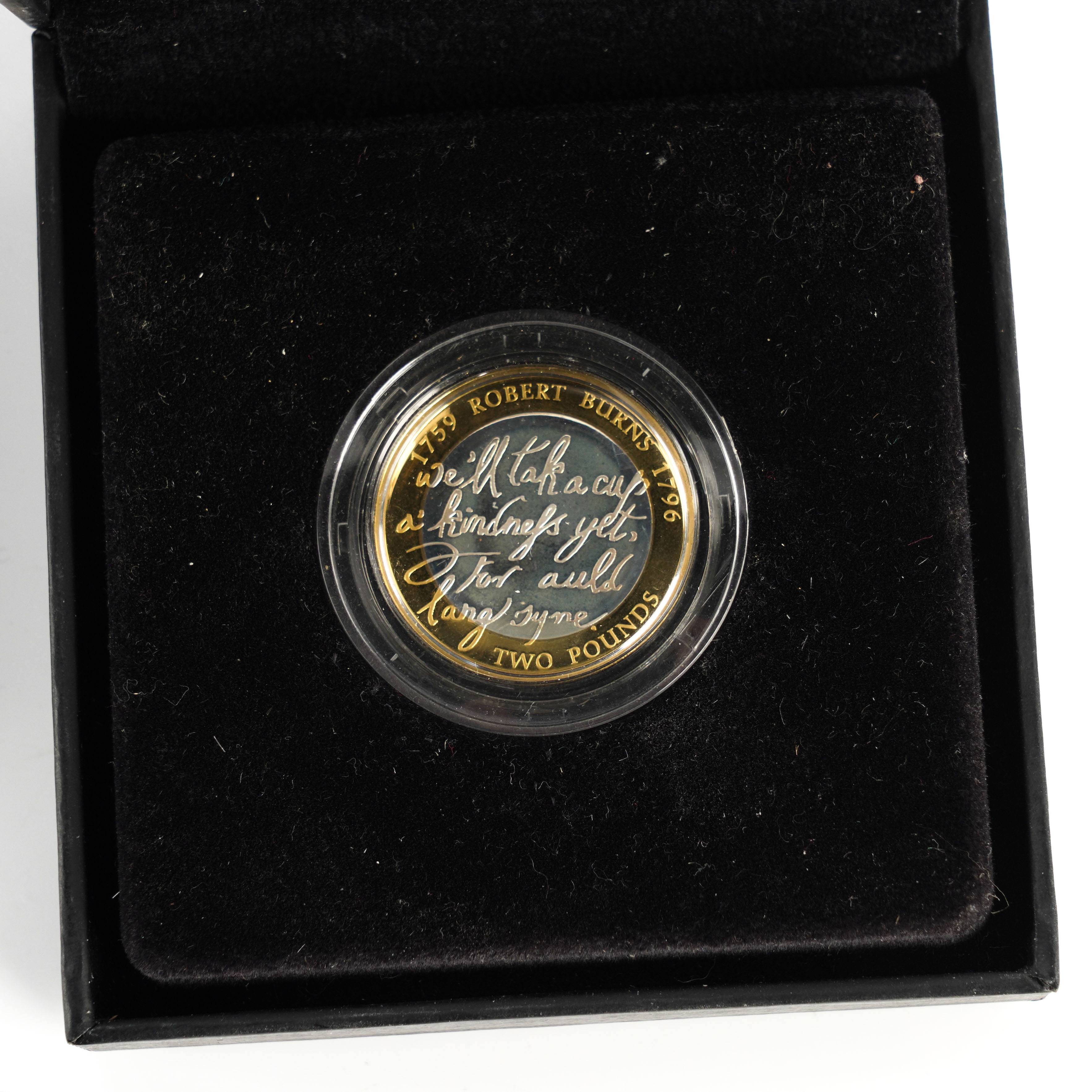 Comprising; a Robert Burns two pound coin 2009, two Charles and Diana crowns 1981, a Battle of Britain piedfort fifty pence 1994 and a large and small two coin fifty pence set 1997