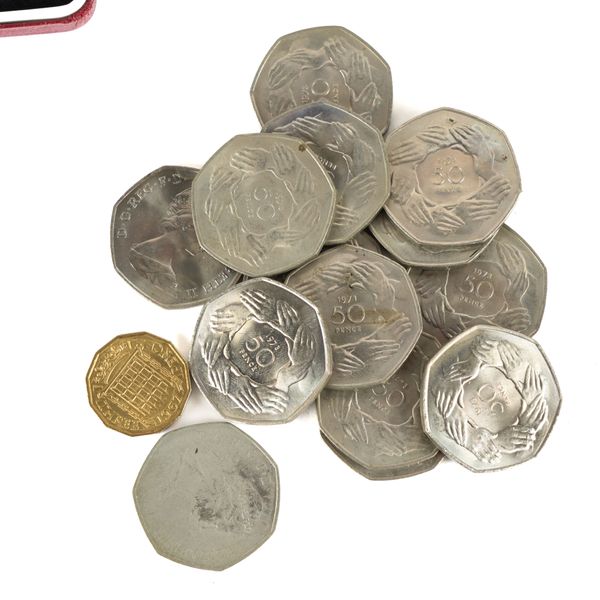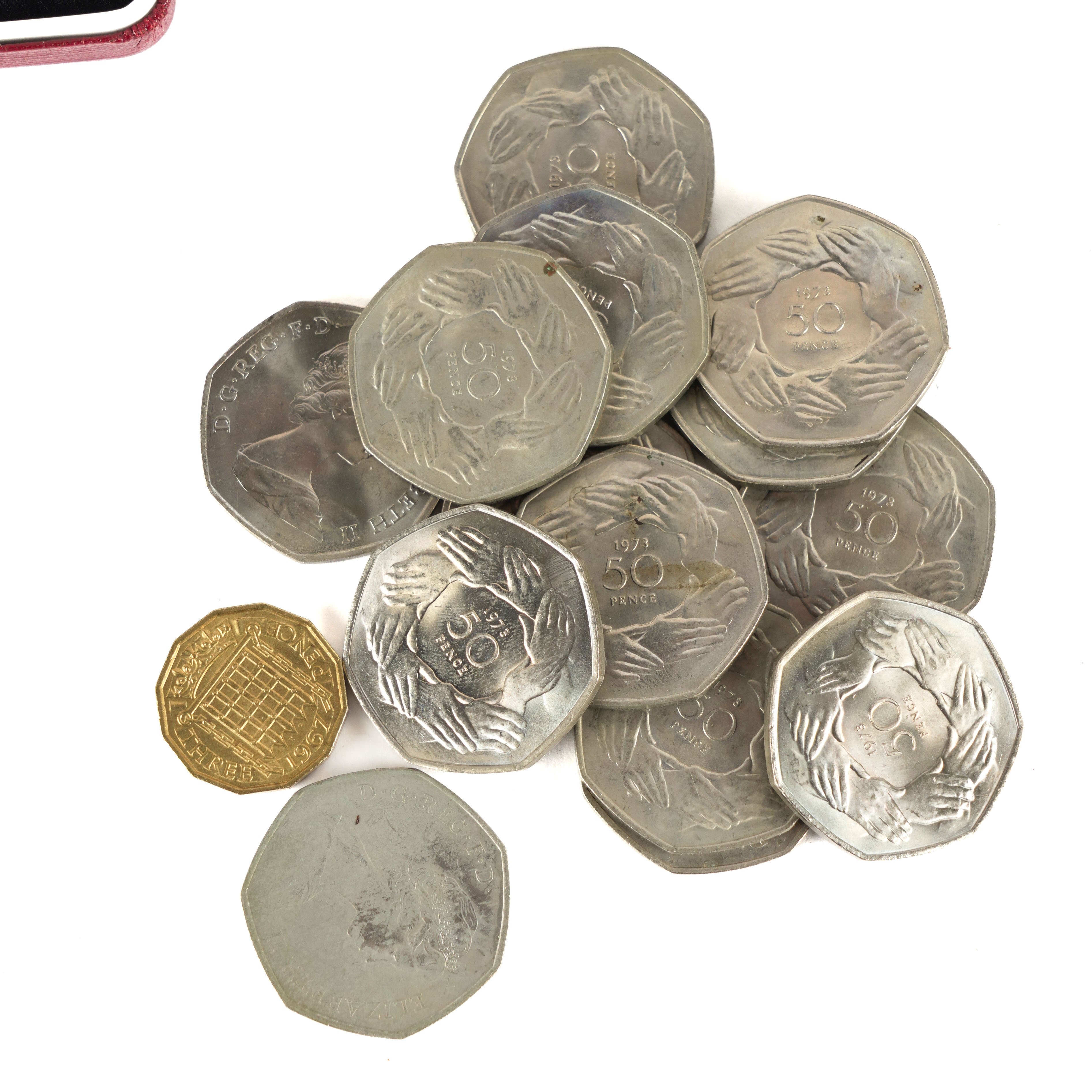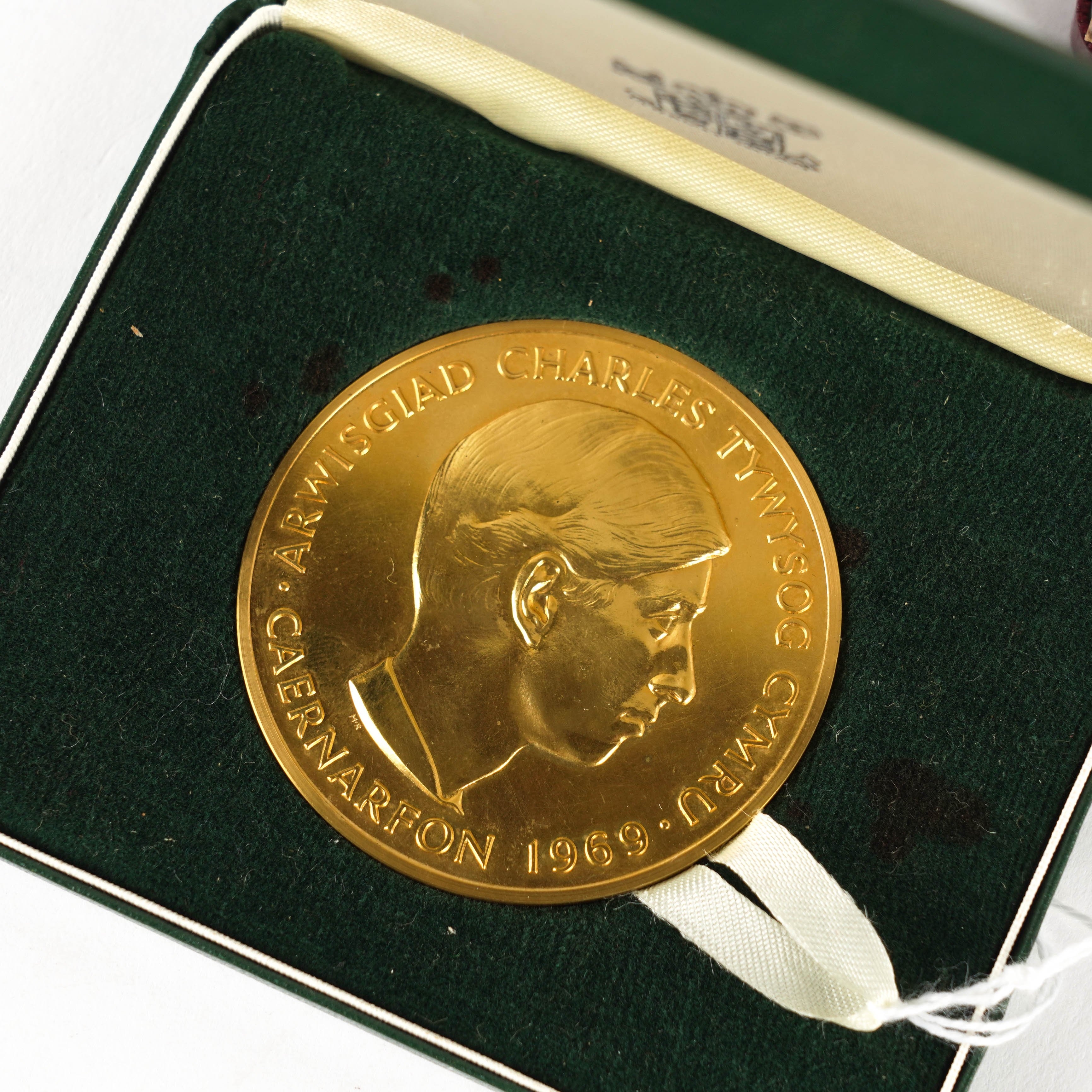 To include a silver medallion, commemorating The Installation of Charles as The Prince of Wales 1969, another gilt base metal example, a 1972 proof crown, various proof and currency fifty pence coins, a 1968 first and second issue coin set, also a Guernsey four coins proof set, a Lundy Island four coin proof set, two Jersey 1966 differing sets, an Isle of Man proof crown 1970 and further items