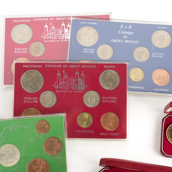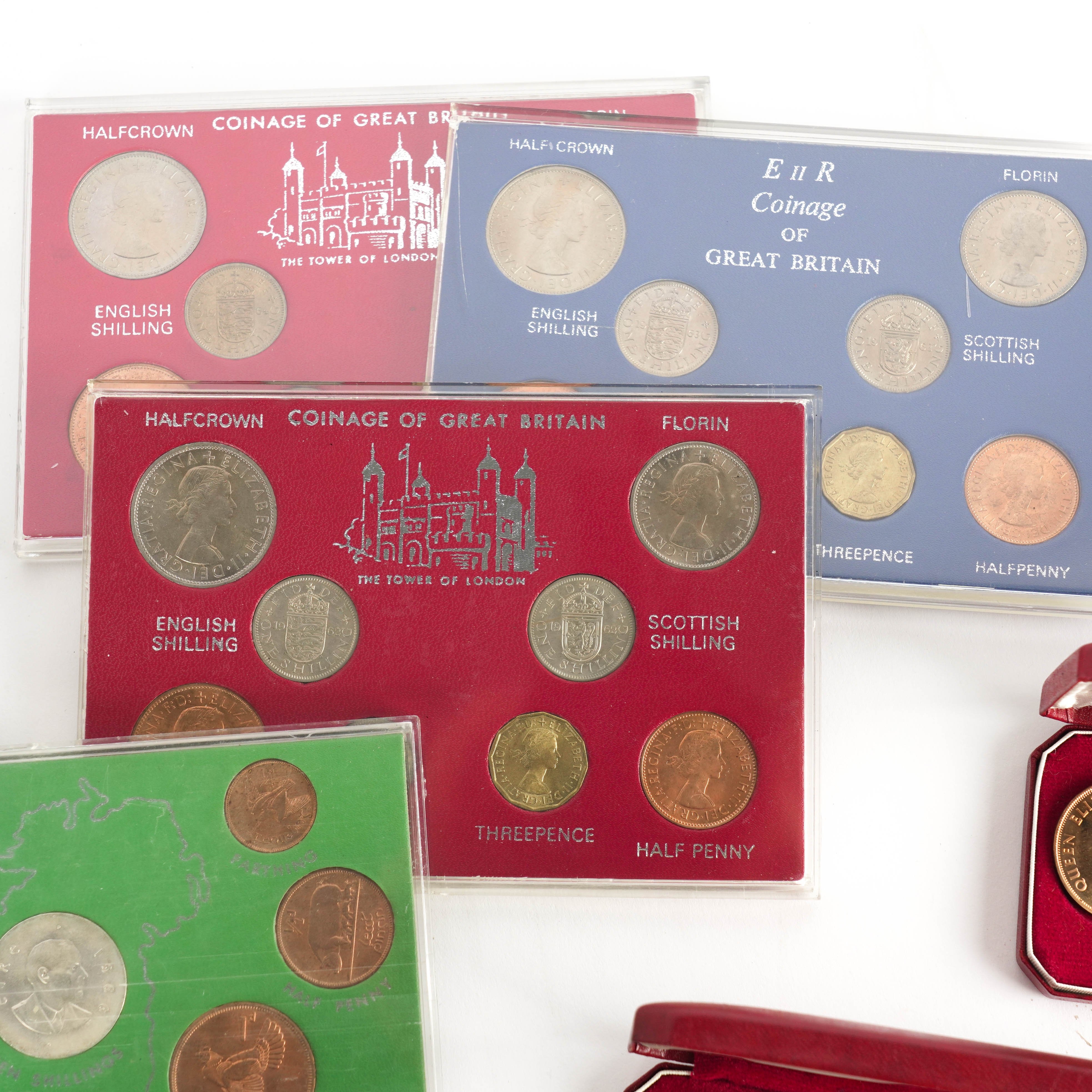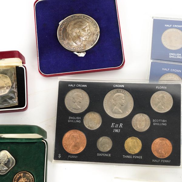 A GROUP OF MOSTLY BRITISH SPECIMEN COINS AND MEDALLIONS AND FURTHER ITEMS (QTY)