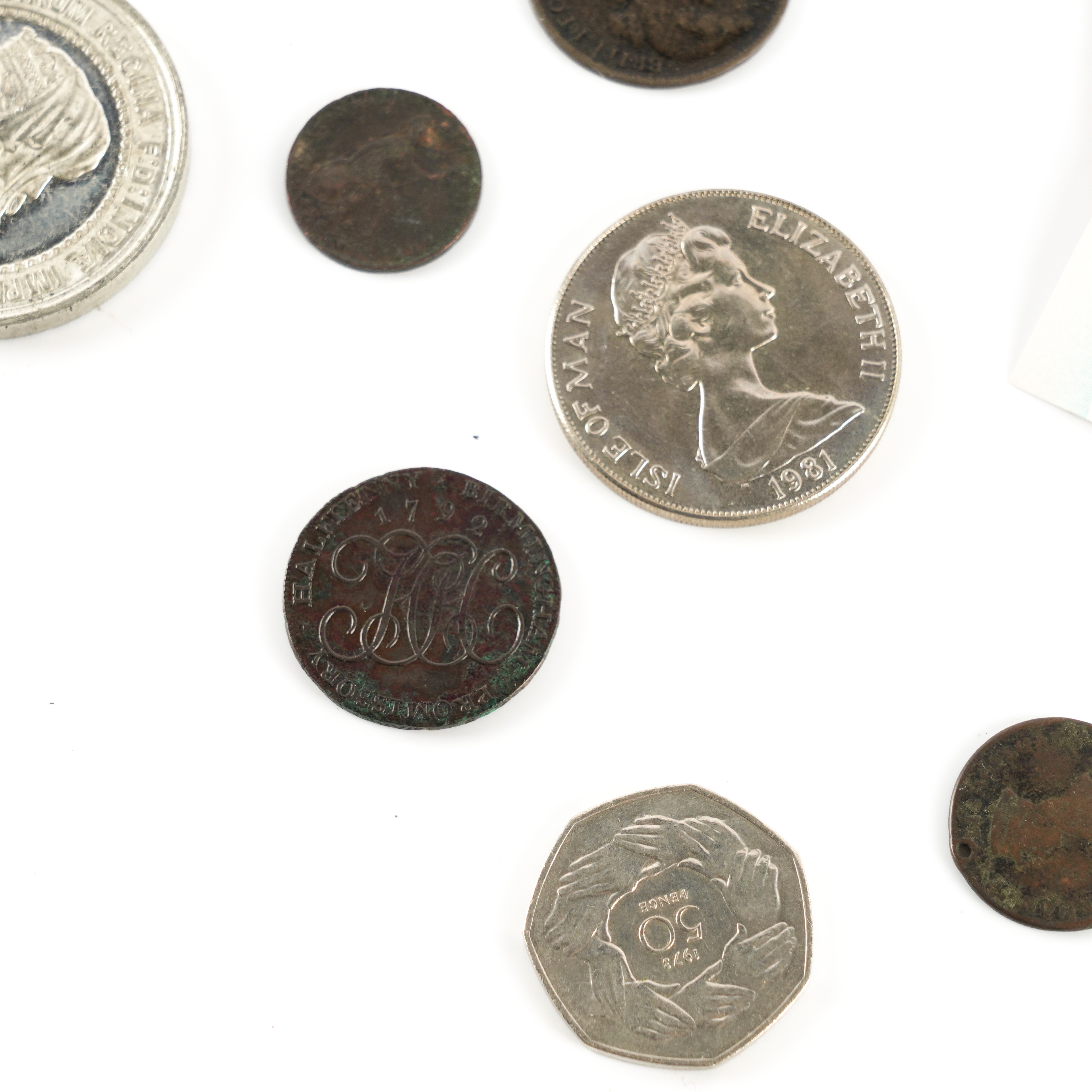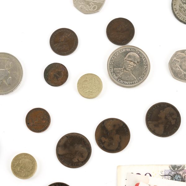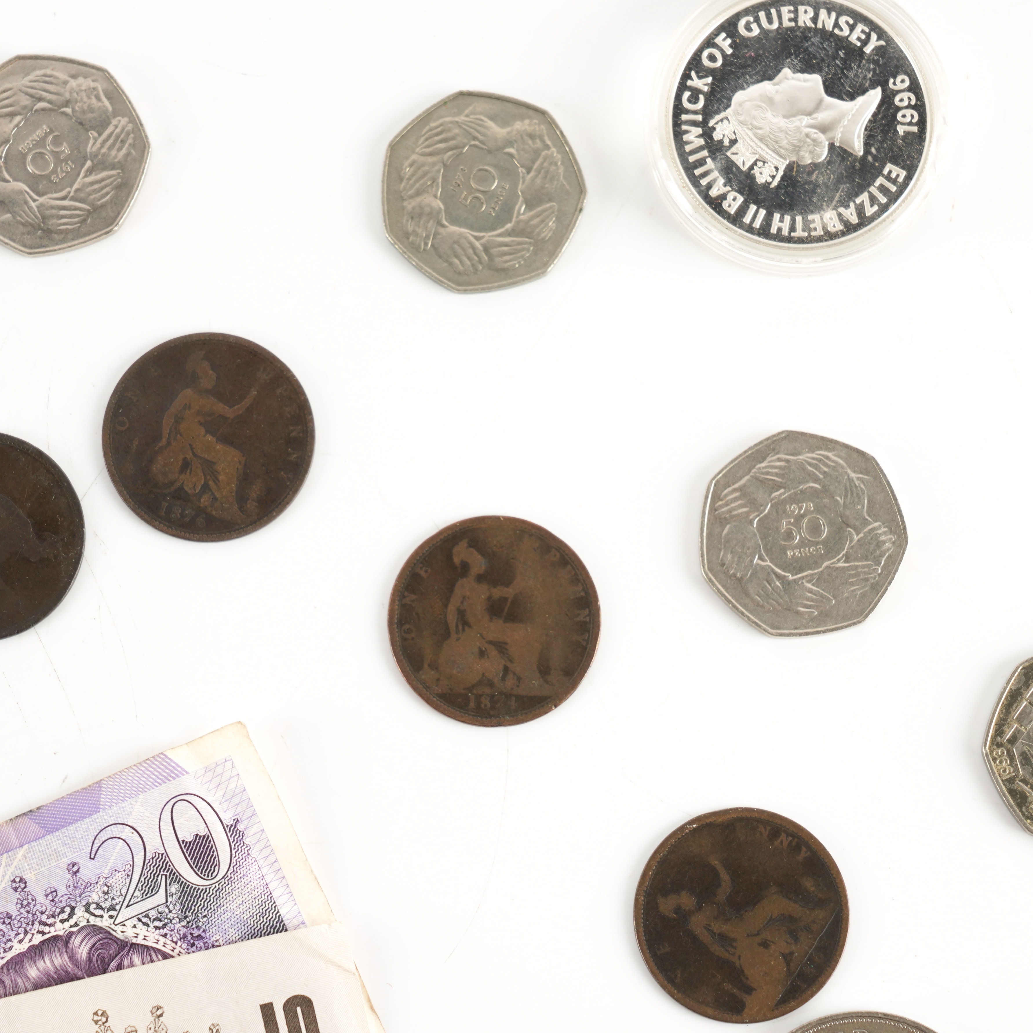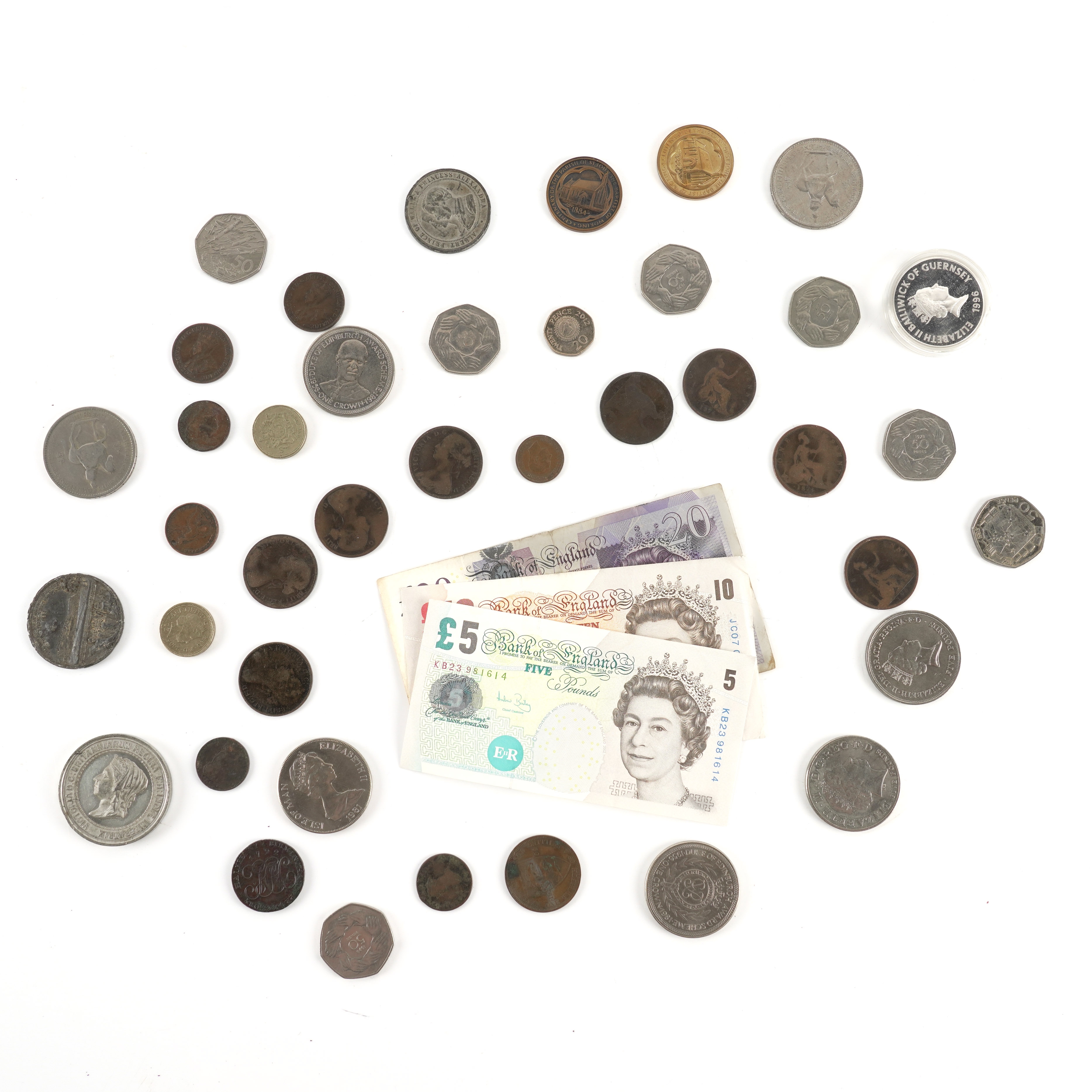 To include; two Victoria Jubilee head crowns 1887 and 1891, a Victoria Shilling 1897, two cartwheel twopences 1797, further crowns, two pound coins, seven fifty pences, Channel Islands coins, various copper and bronze coins, tokens and medallions, also three bank notes, comprising; twenty pounds, ten pounds and five pounds