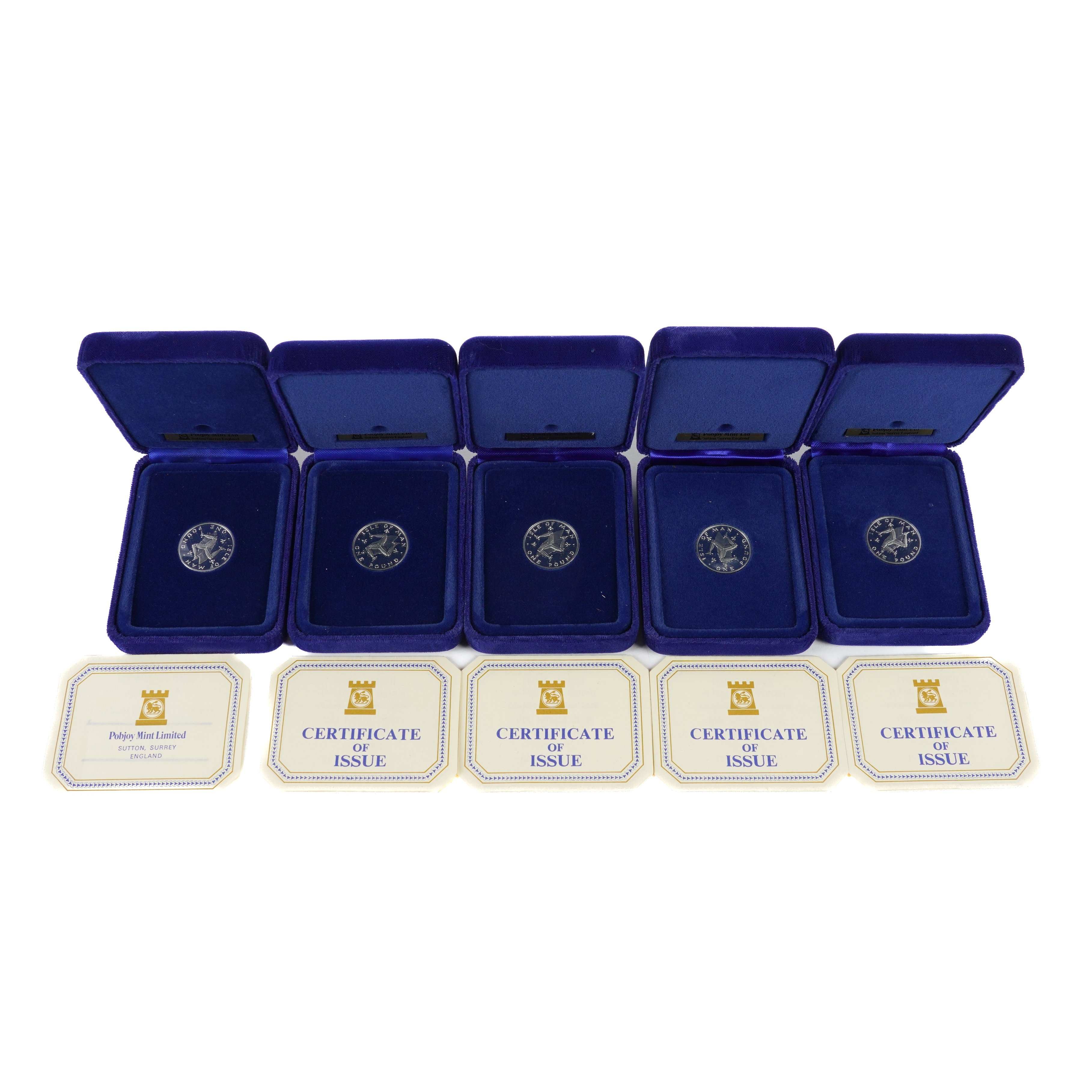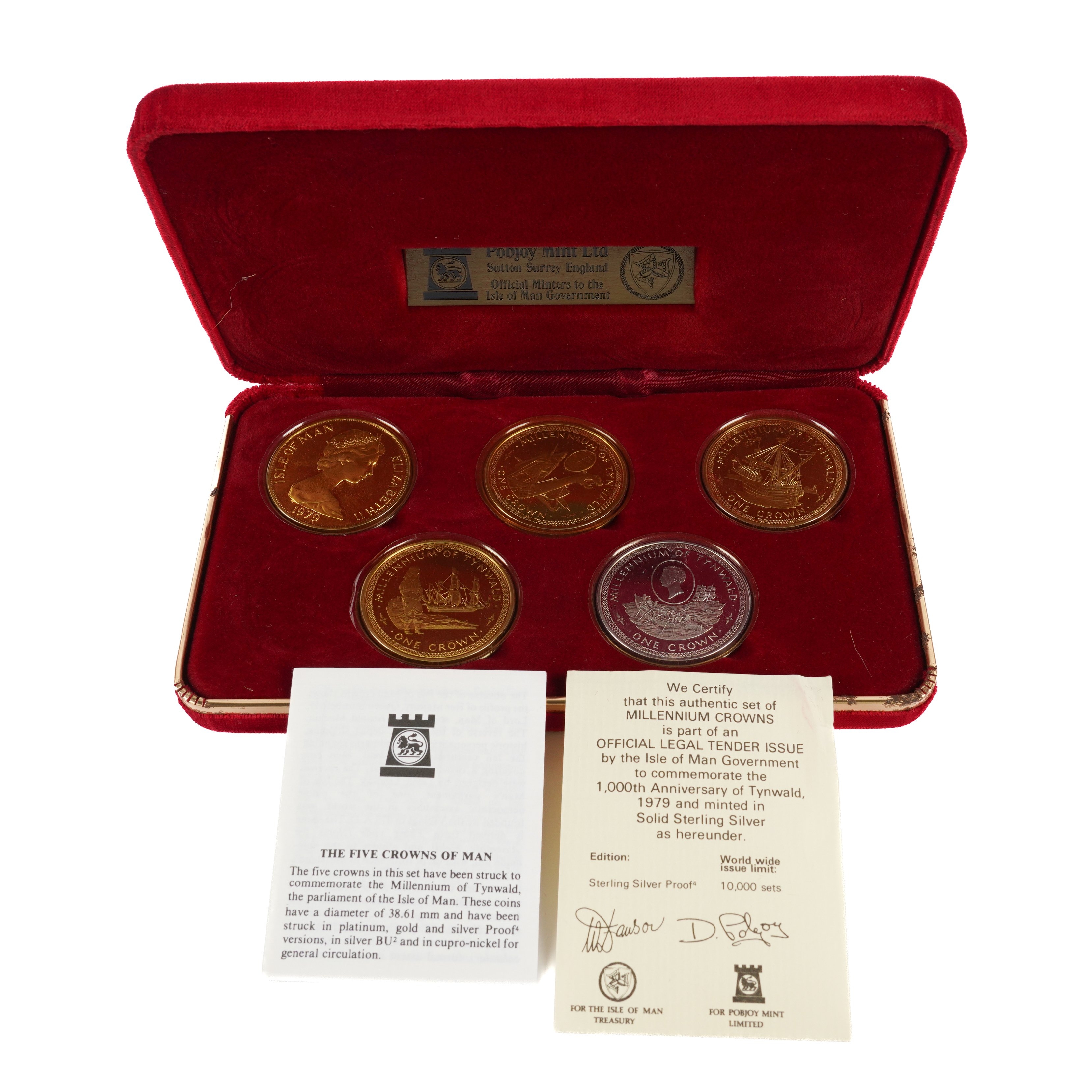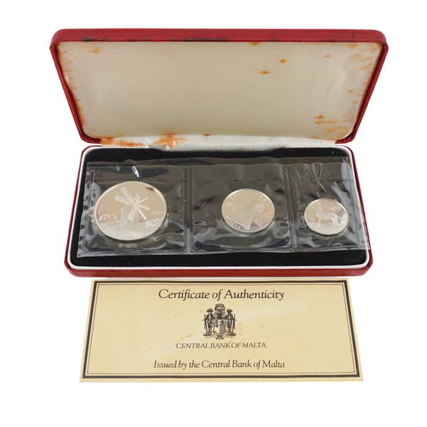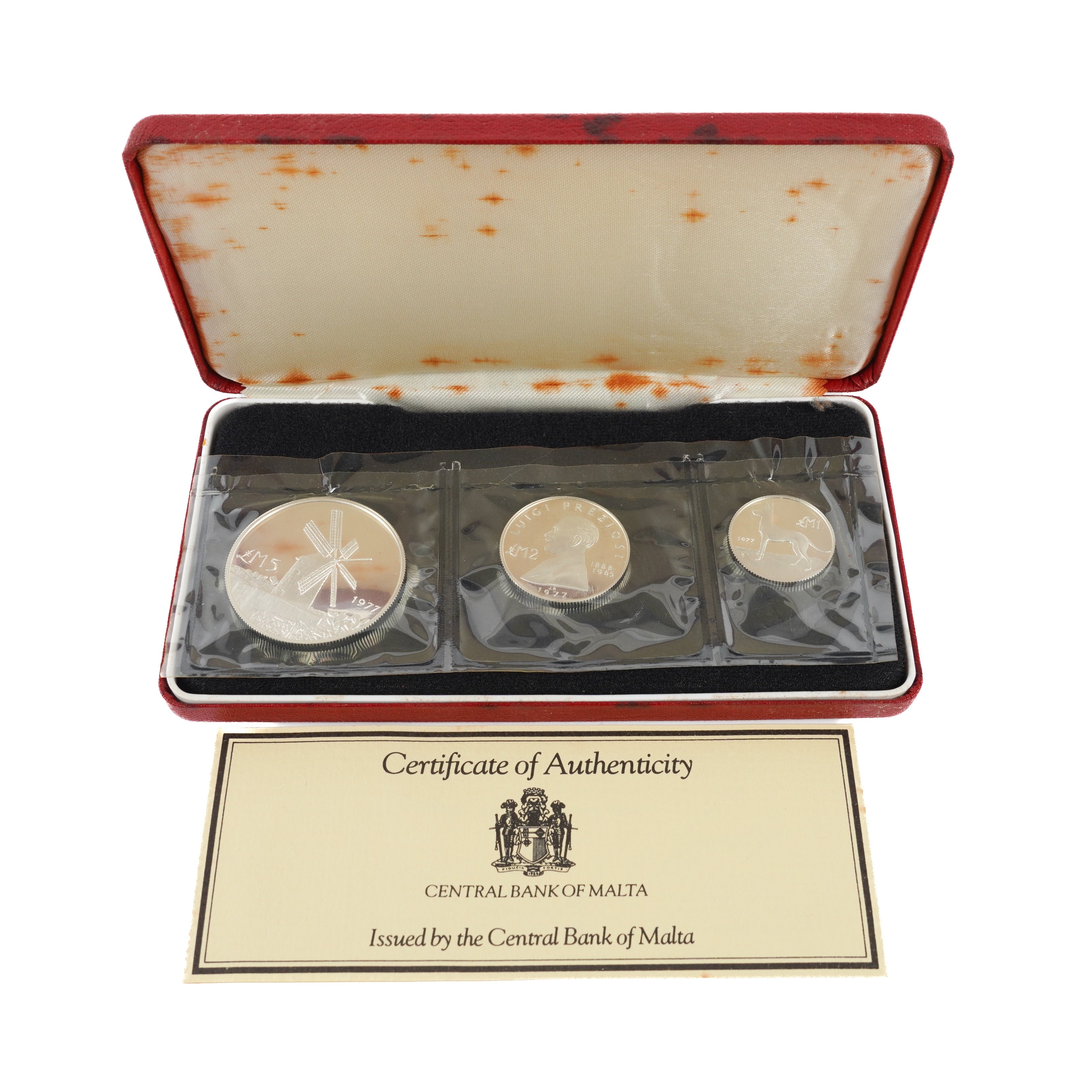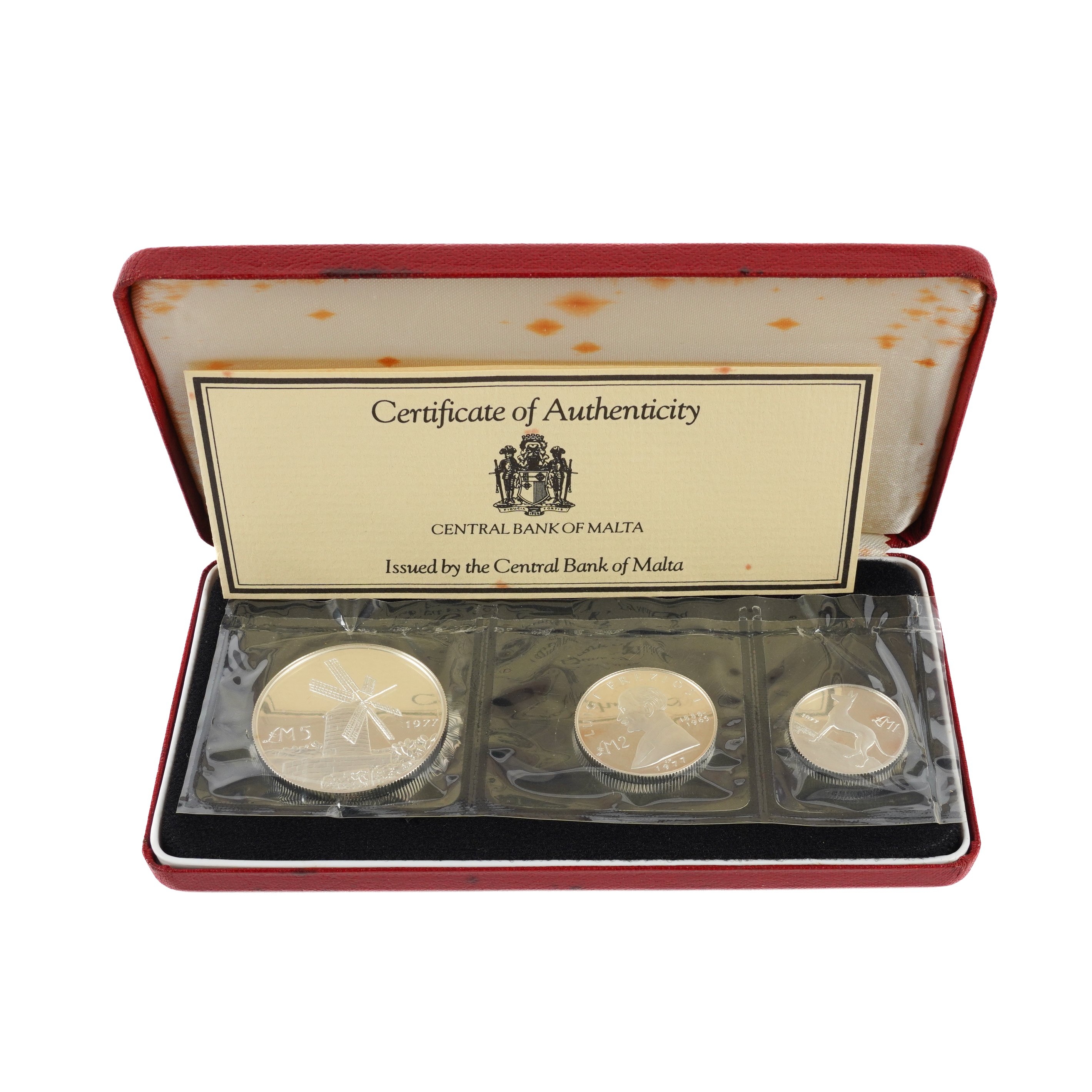 Comprising; an Isle of Man 1979 set of five crown sized coins, three bank of Malta silver proof three coin sets 1977 and five Isle of Man silver proof one pound coins, with cases, certificates and paperwork