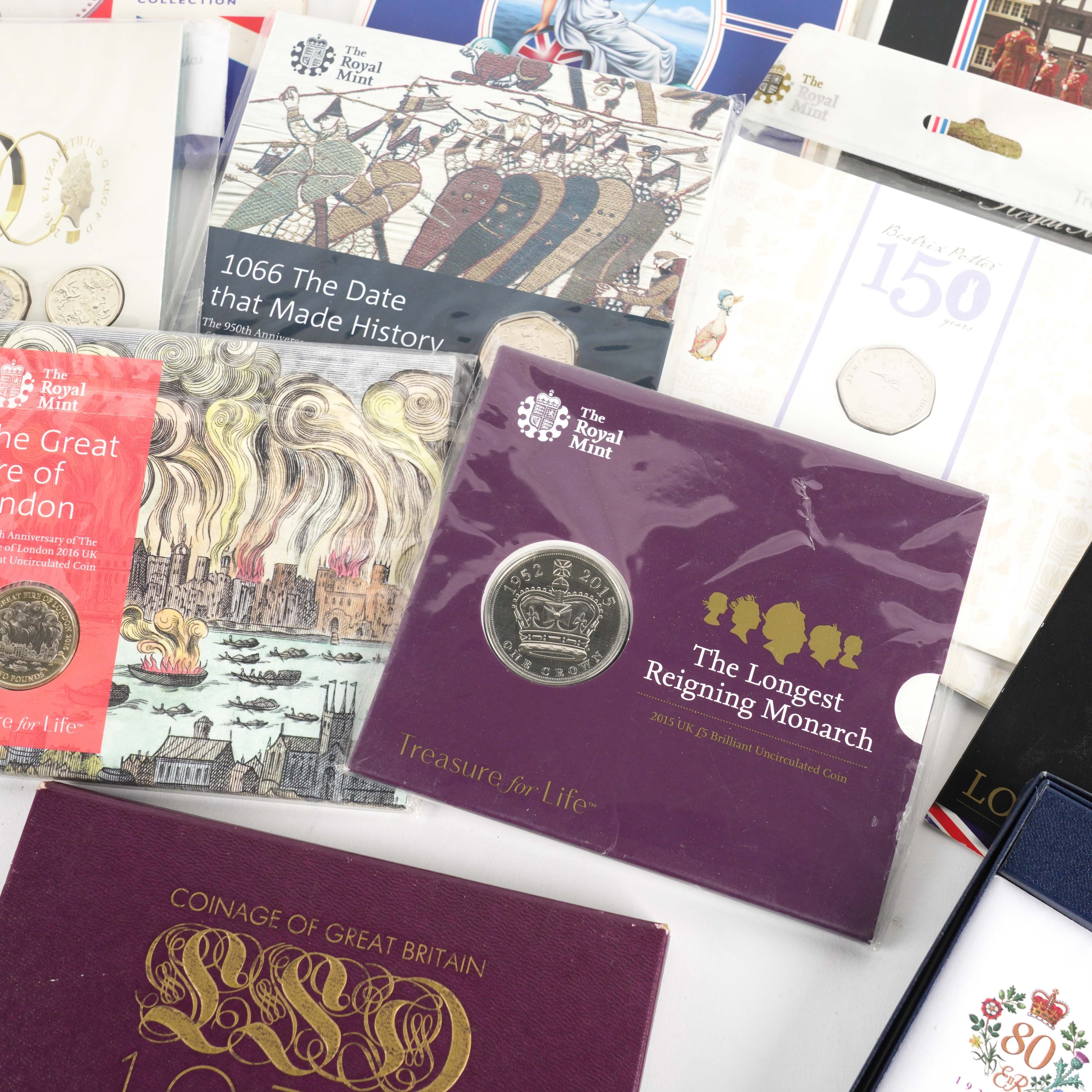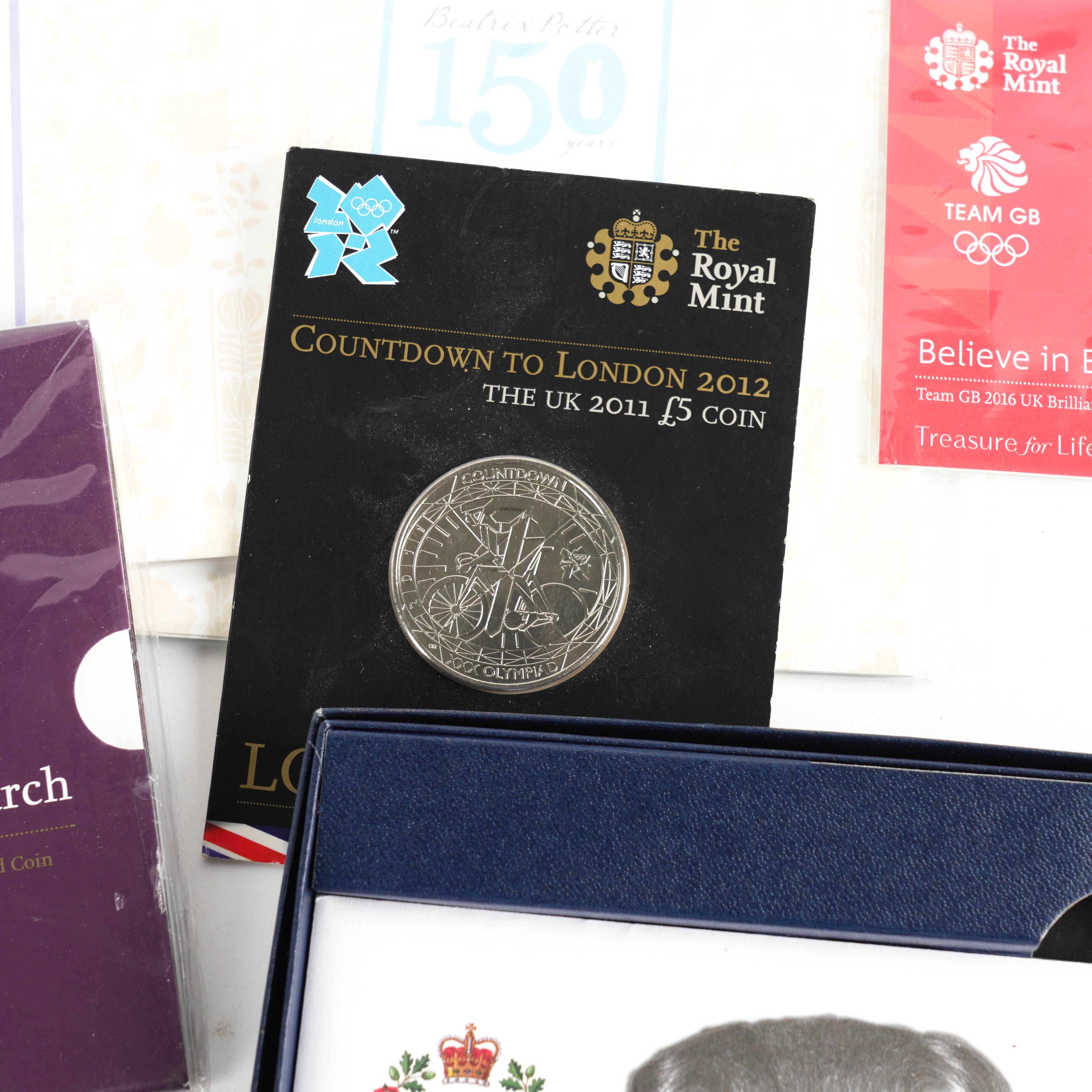 To include; a 1970 proof coin set, two Beatrix Potter 2016 fifty pence five coin sets, with two cases, a 2006 five pounds silver proof crown, mounted to a First Day Cover, celebrating The Queen's 80th Birthday, with display box and fourteen further items