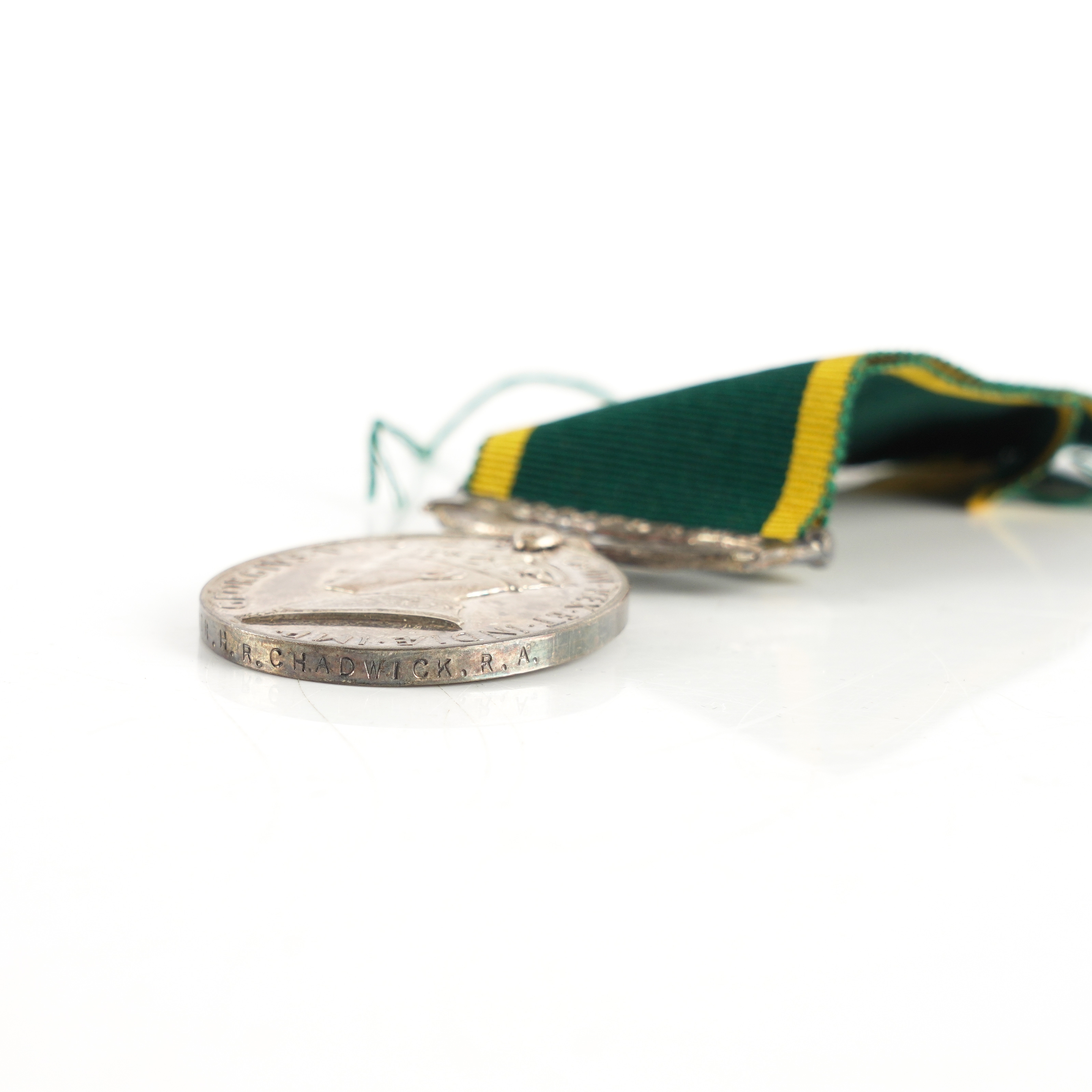 Comprising; The France and Germany Star, The 1939-45 Defence Medal, The War Medal, The Efficiency Medal, George VI issue, with suspension detailed Territorial to 1429310 BDR.H.R.CHADWICK. R.A., a box of postage, also a gilt metal brooch designed as a replica of the Coronation Anointing Spoon, mounted to the original card, detailed Coronation of King Edward VIII, with the original box