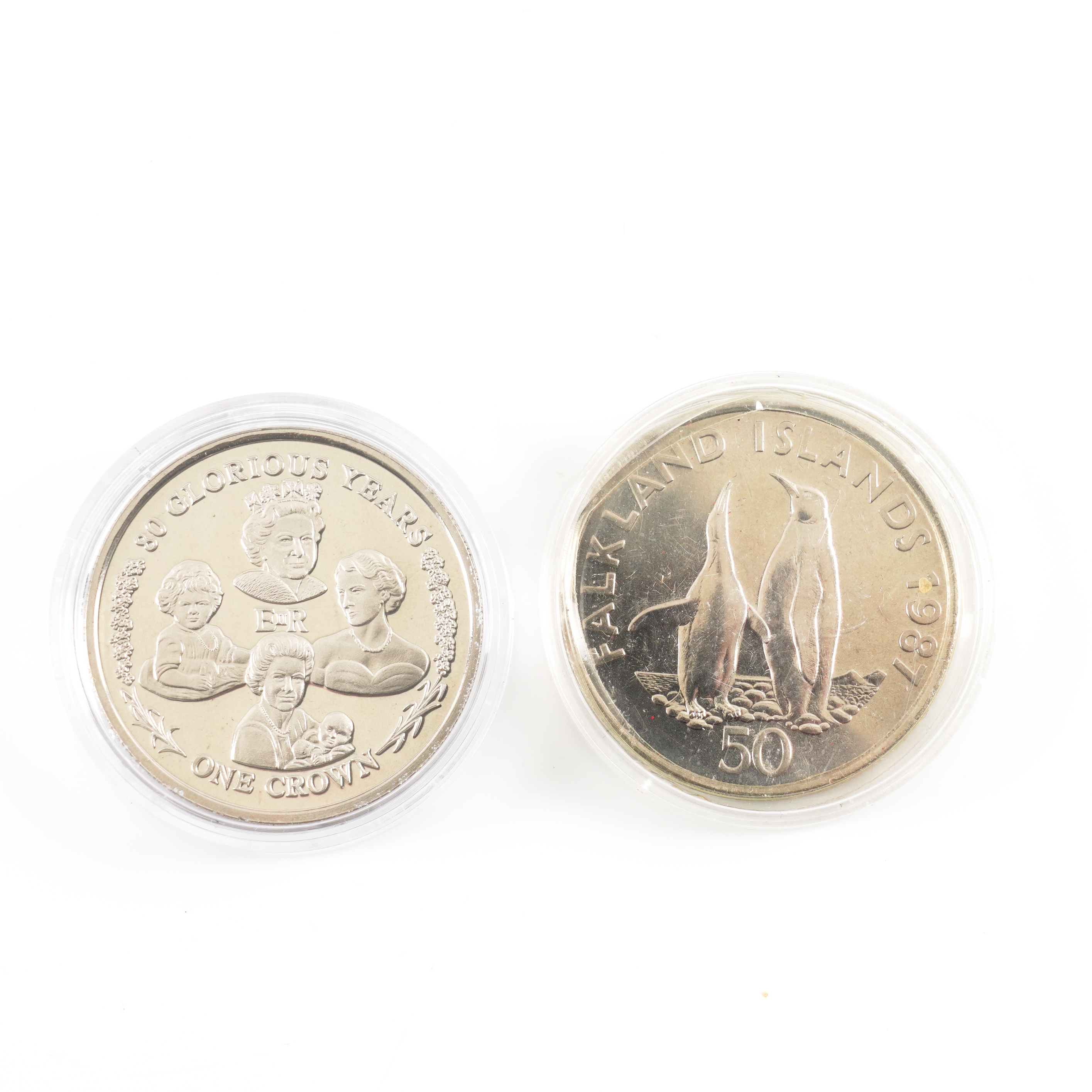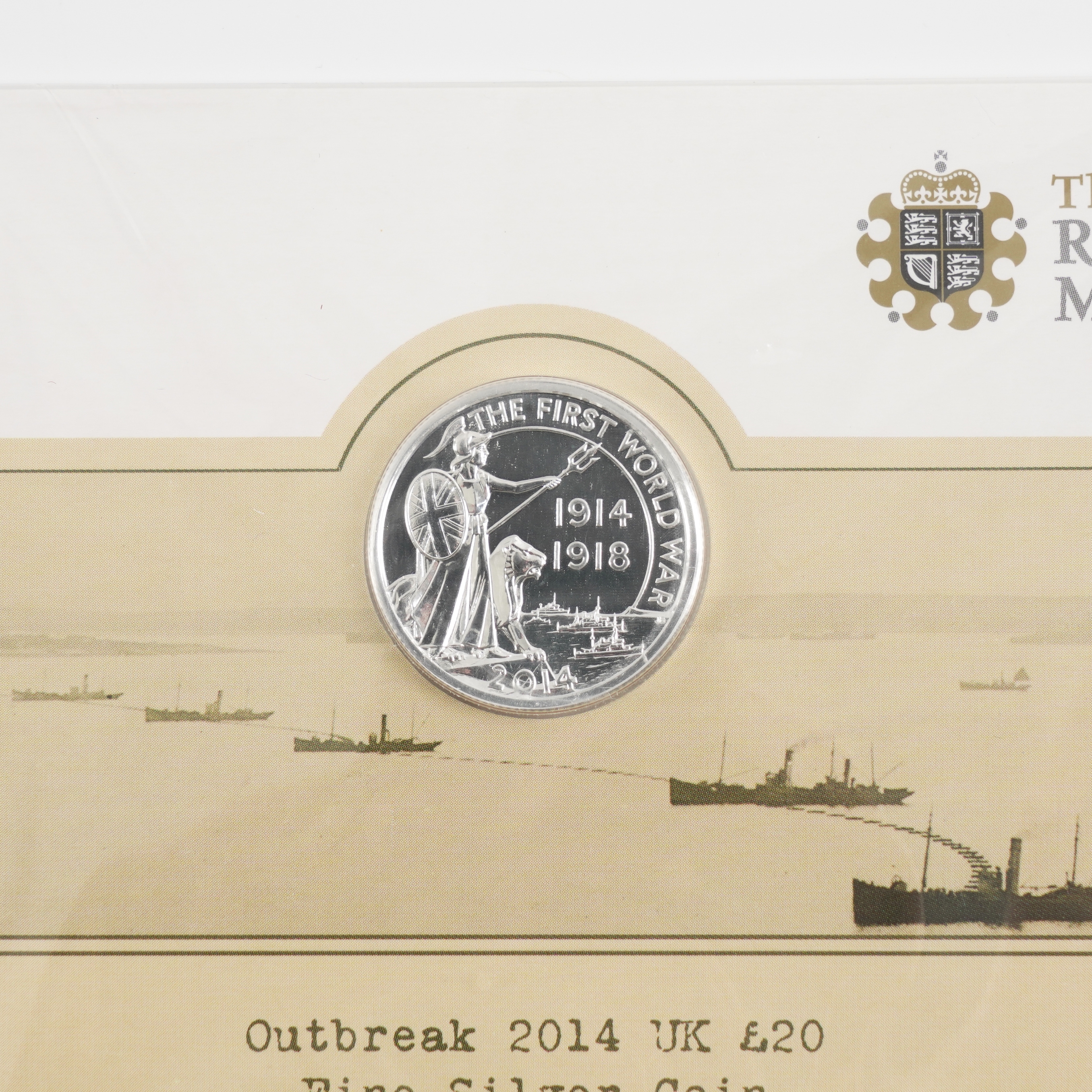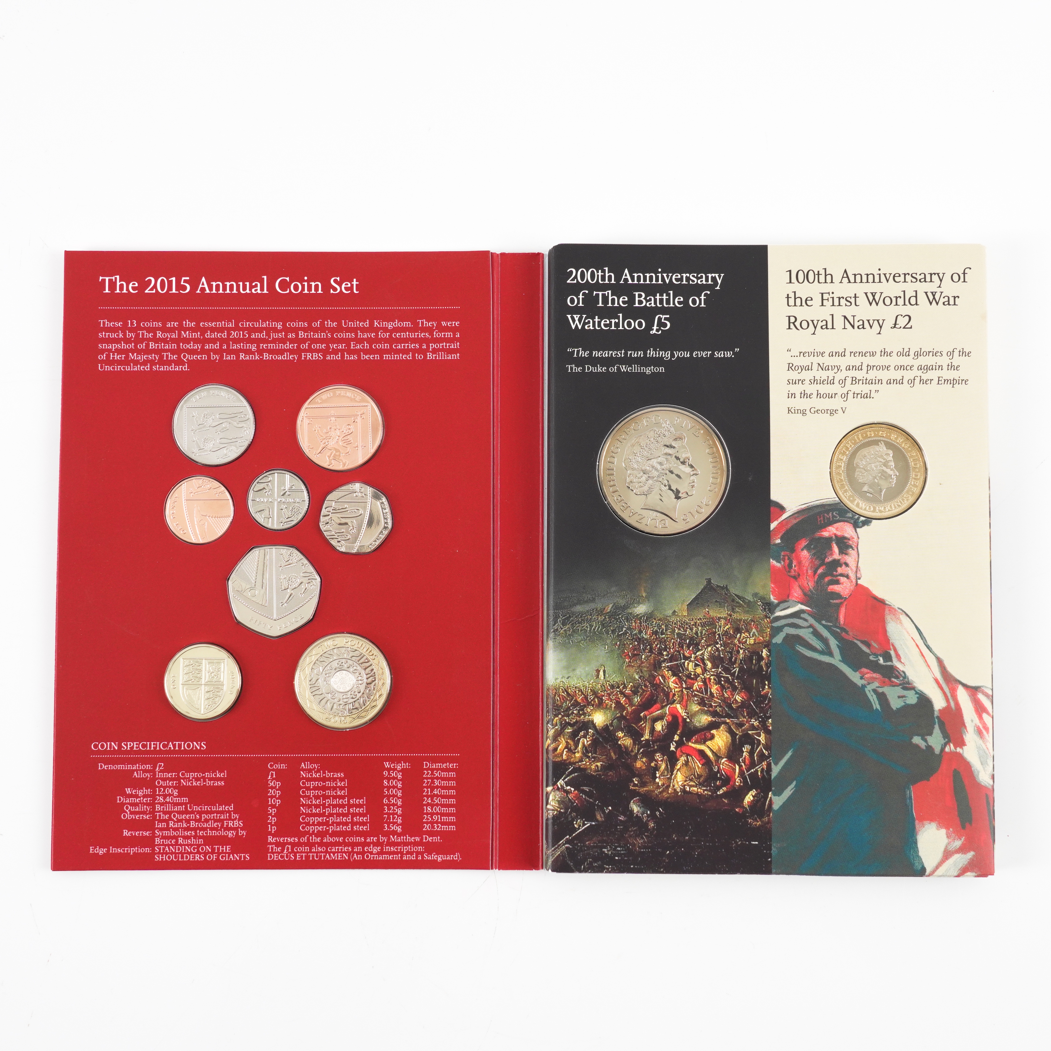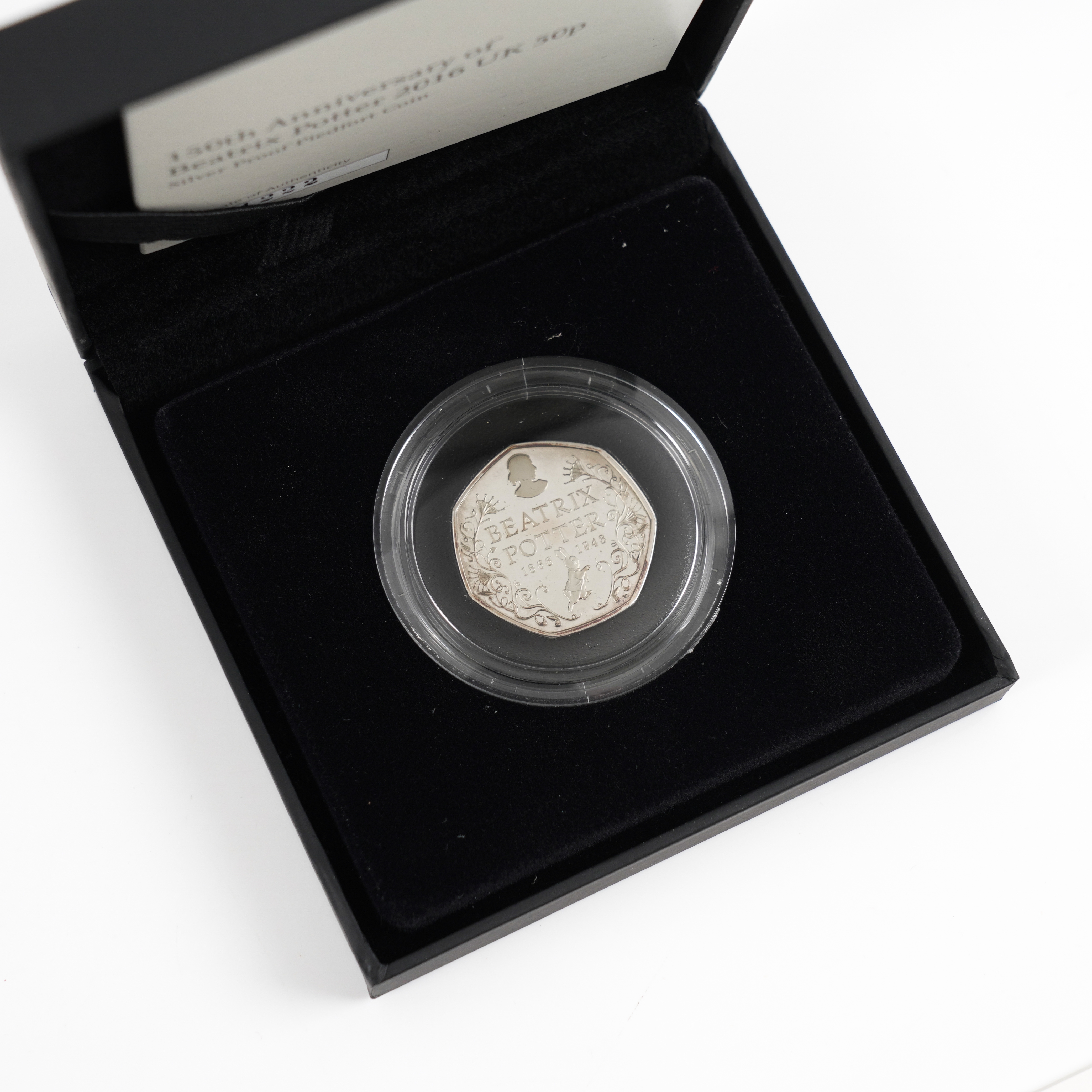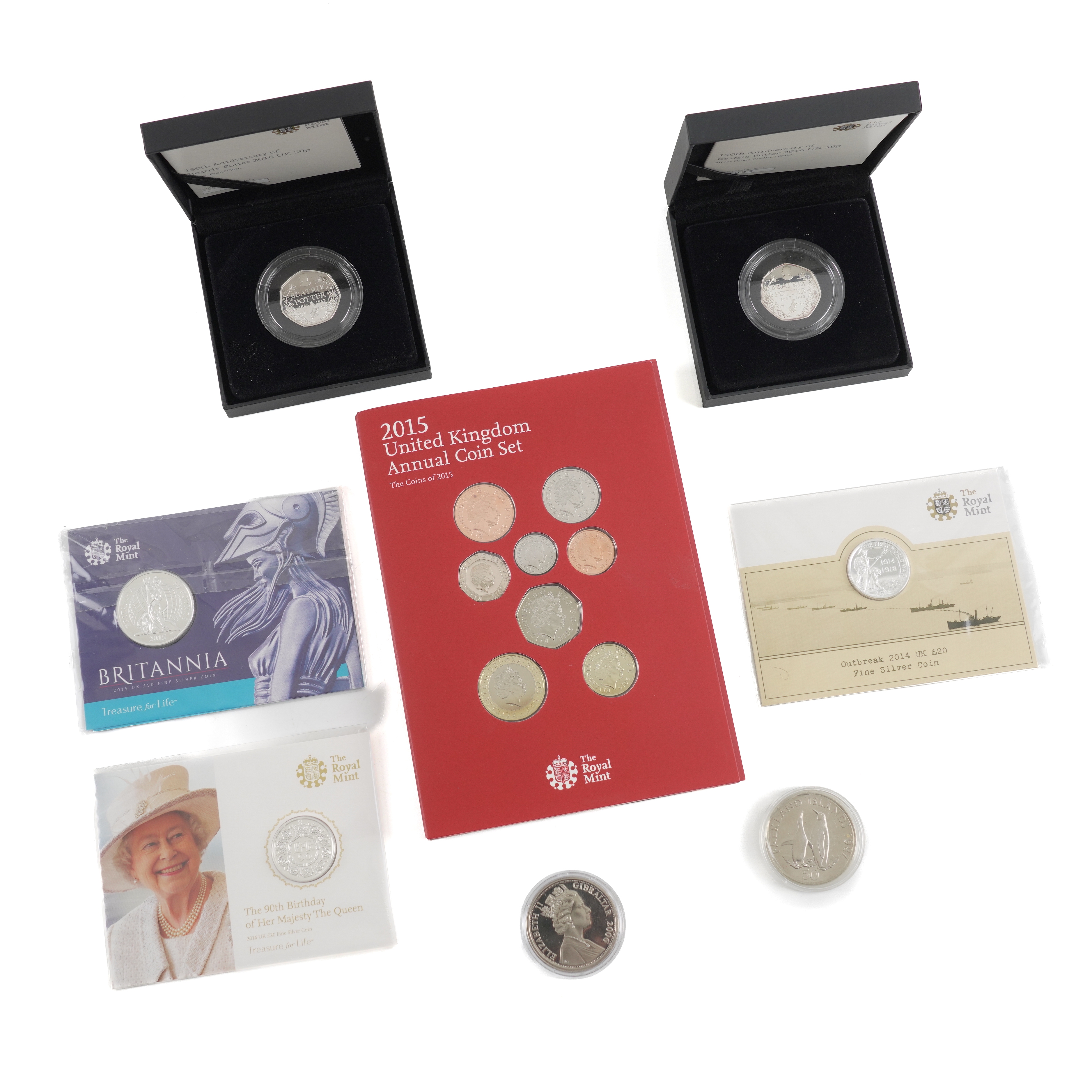 Comprising; a United Kingdom 2015 Annual Coin Set, two silver proof UK fifty pence pieces commemorating The 150th Anniversary of Beatrix Potter 2016, both piedfort and regular issues, with cases and booklets, a one ounce Britannia coin and four further items, including a Falkland Islands 1987 fifty pence