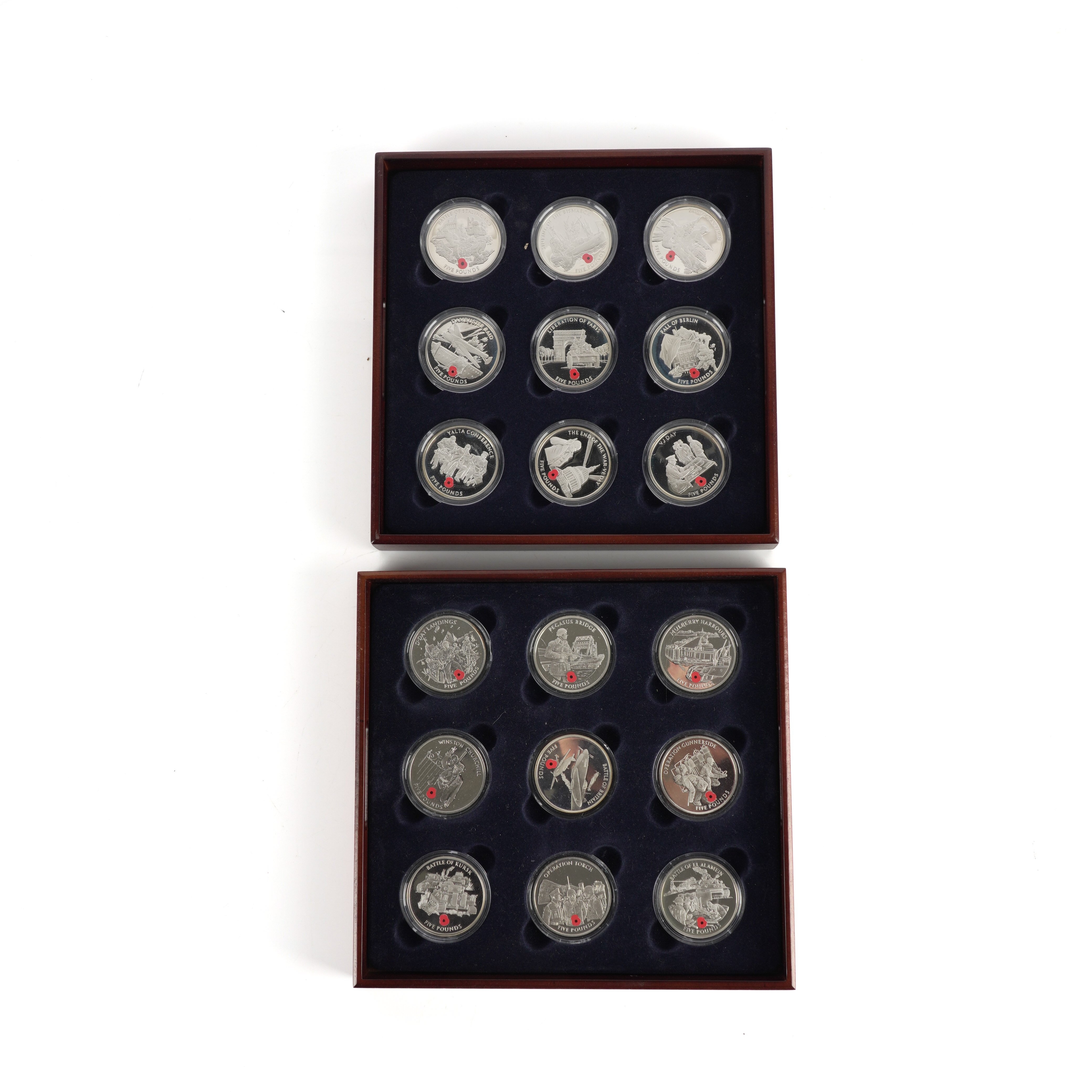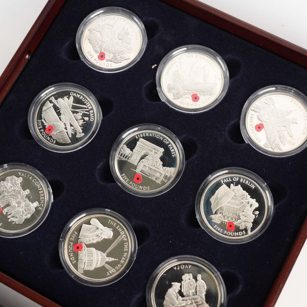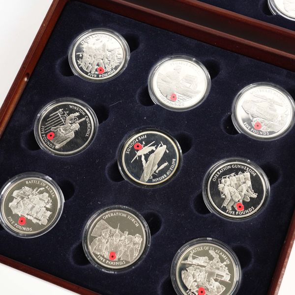 A ROUTE TO VICTORY EIGHTEEN COIN SILVER PROOF SET OF FIVE POUNDS CROWNS