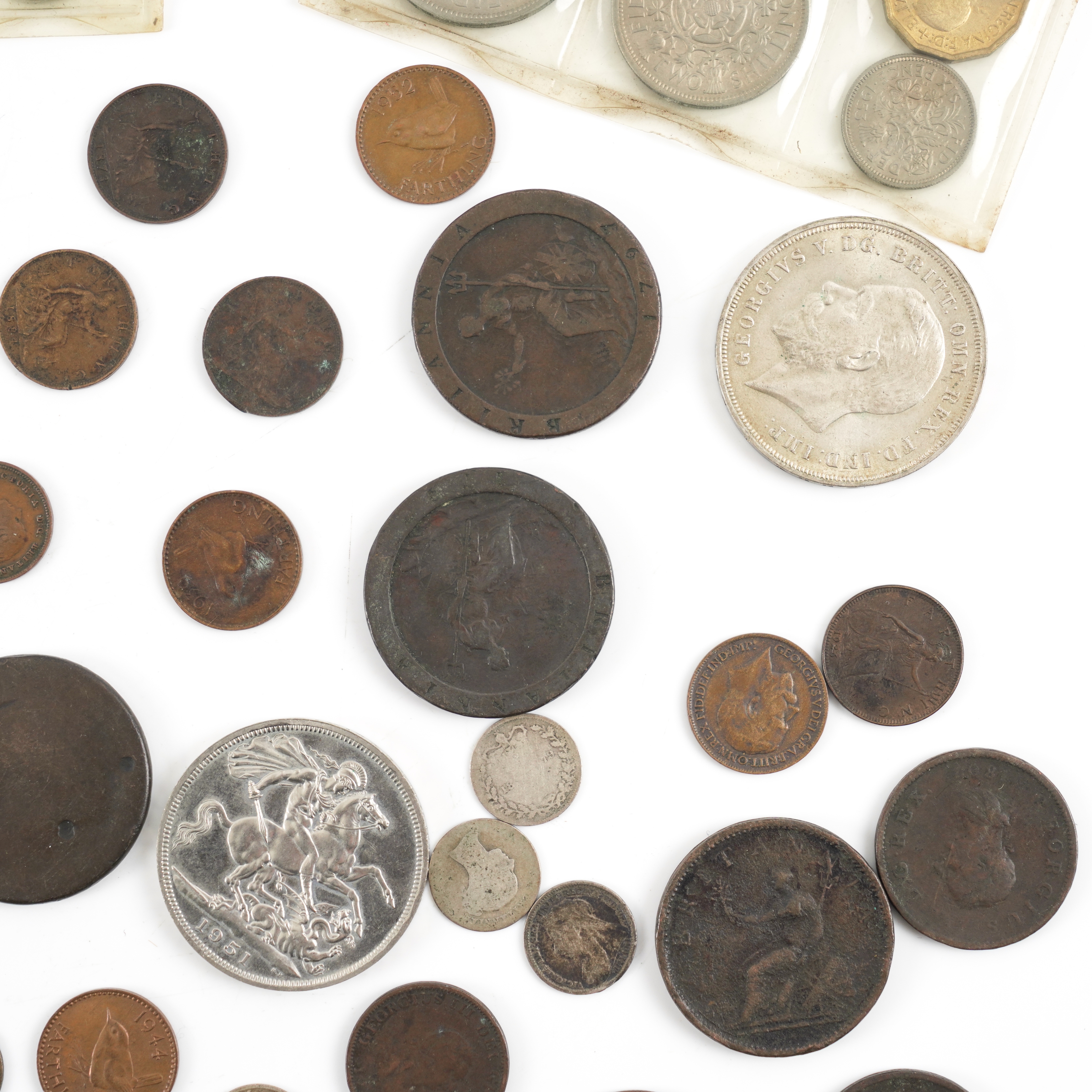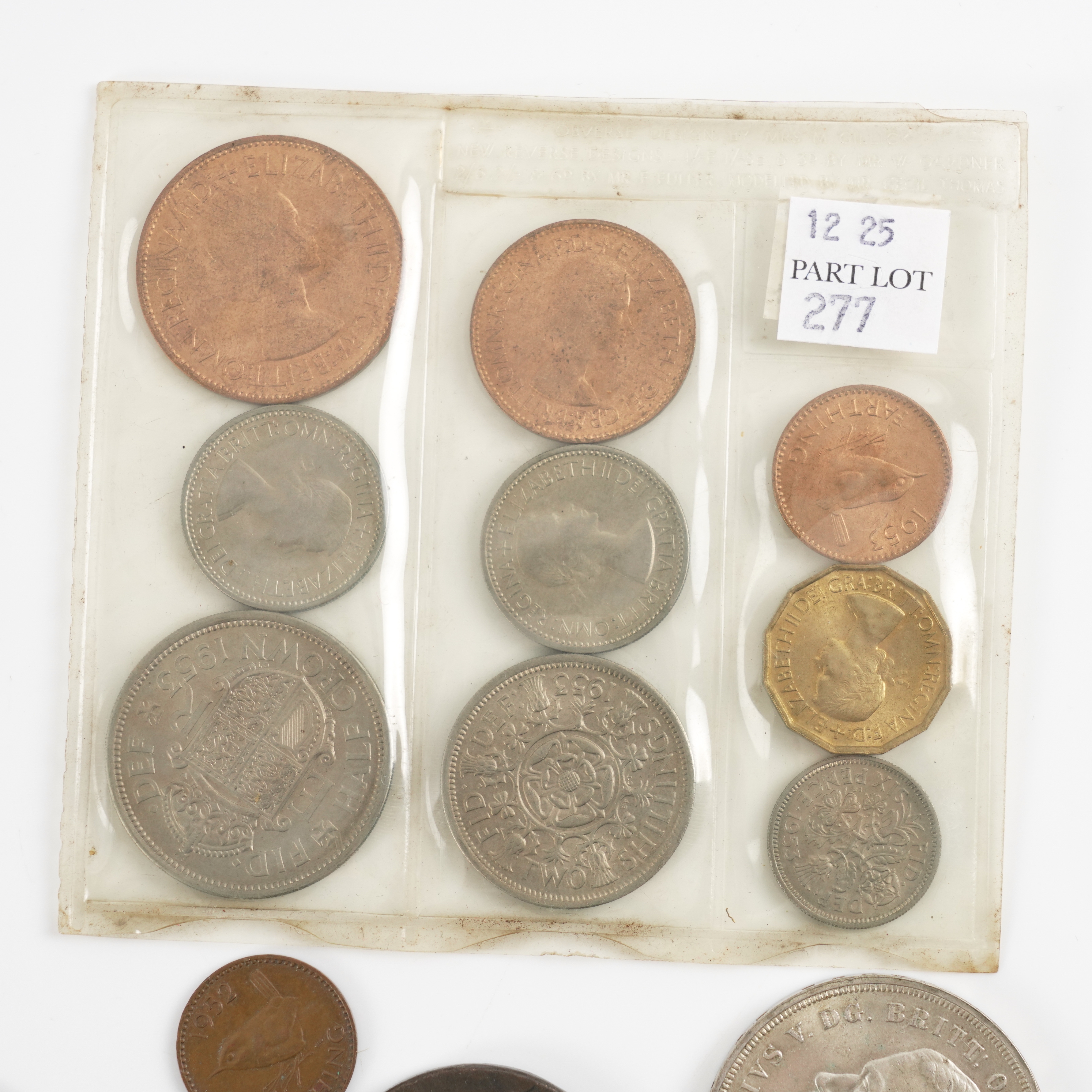 Comprising; four George V 1935 Silver Jubilee crowns, two George VI 1951 crowns, three 1953 nine coin plastic sets, a quantity of silver three pences, pre-1920 and pre-1947 issues, a Canada five cents 1911 and copper and bronze coins, including cartwheel pennies, three halfpenny tokens, three Isle of Man coins, an Irish halfpenny, various farthings and a half farthing 1843