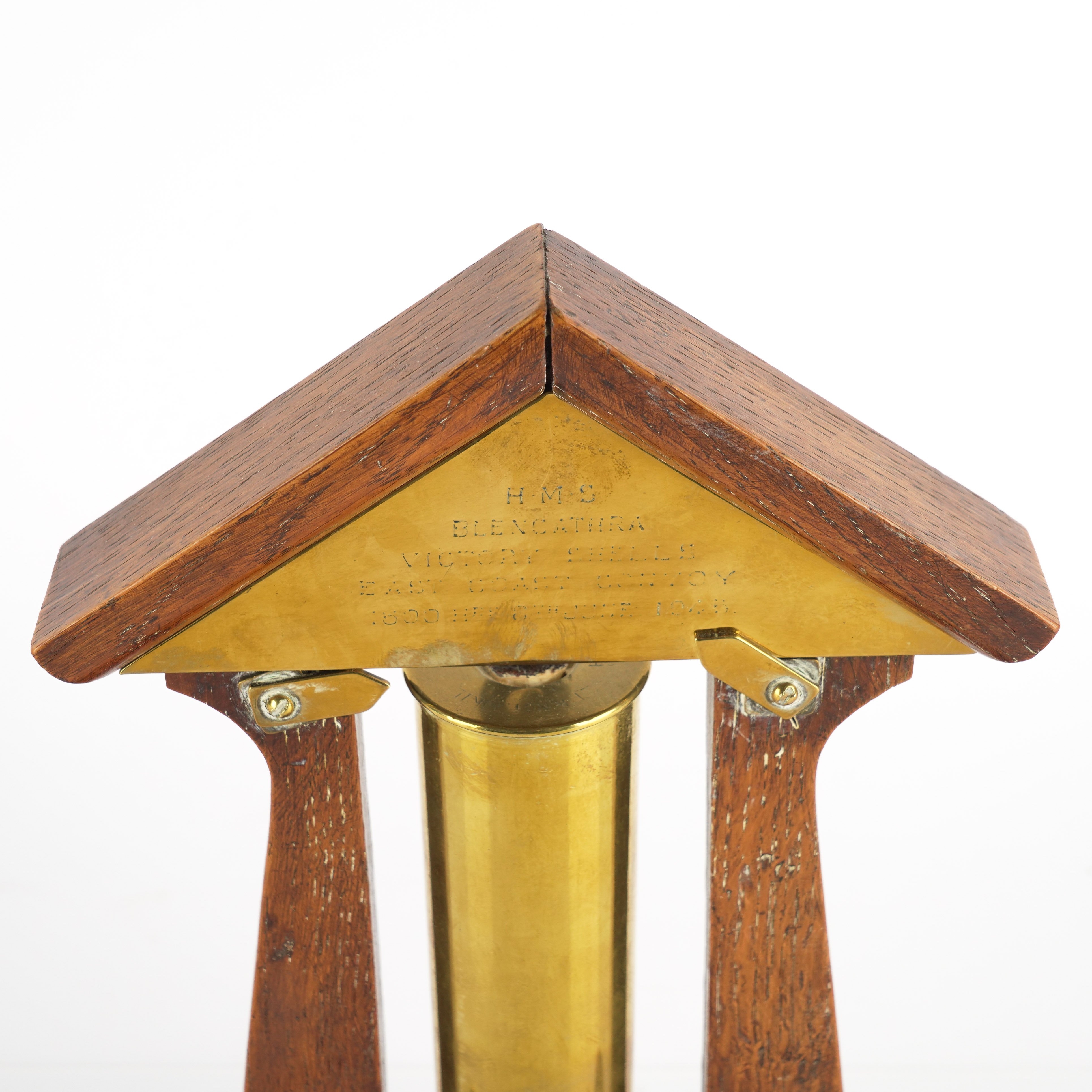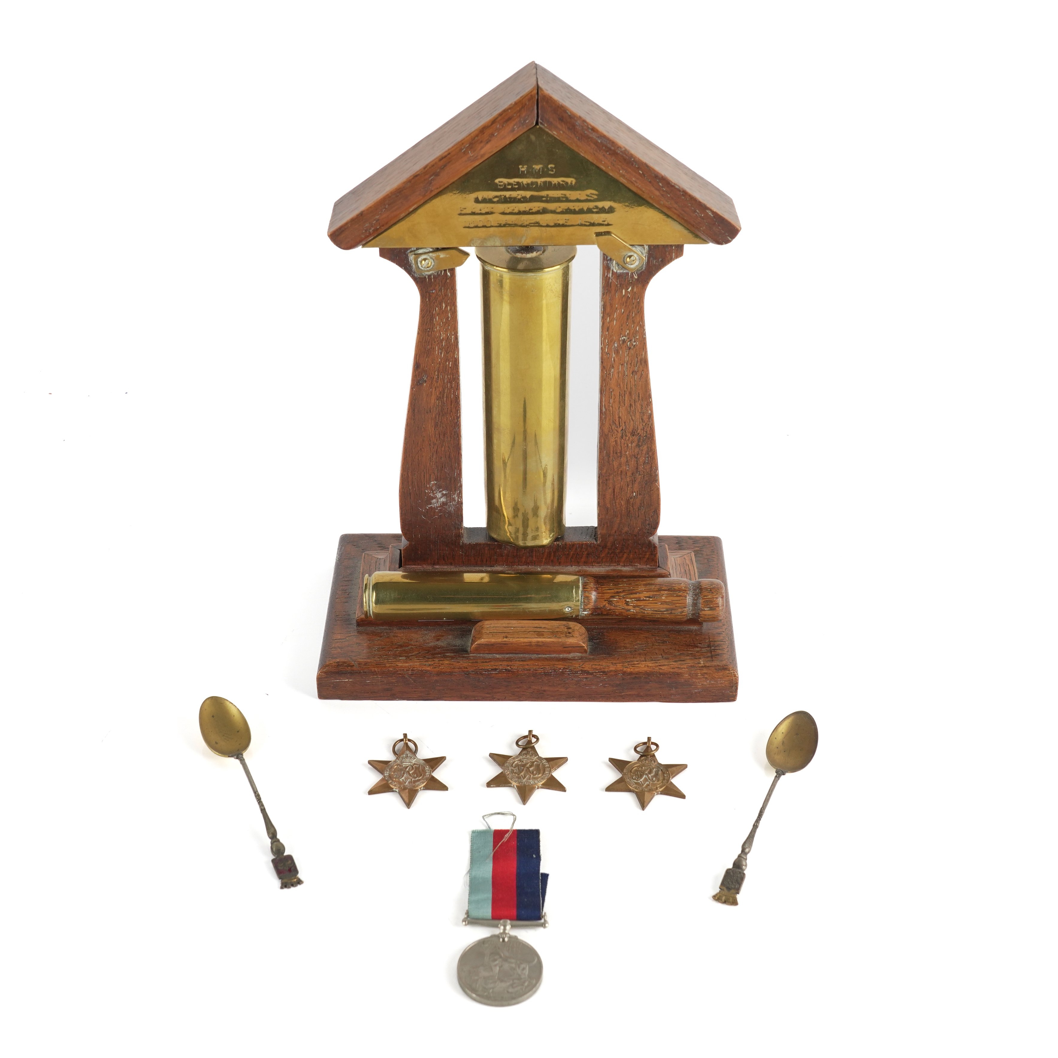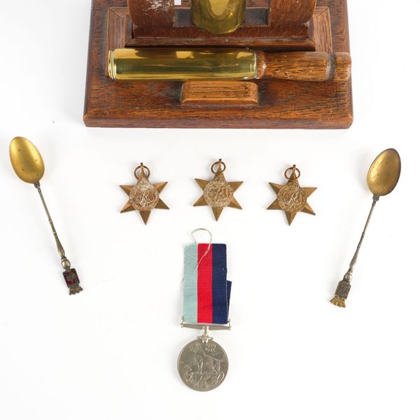 Comprising; The 1939-45 Star, The Burma Star, The France and Germany Star and The War Medal, two French souvenir spoons, detailed Cambrai and Lille and a brass and oak dinner gong, formed from two Second World War period brass shells, the stand detailed HMS Blencathra Victory Shells East Coast Convoy 1500 Hrs 8th June 1945, height of stand 30cm and width of base of stand 21cm