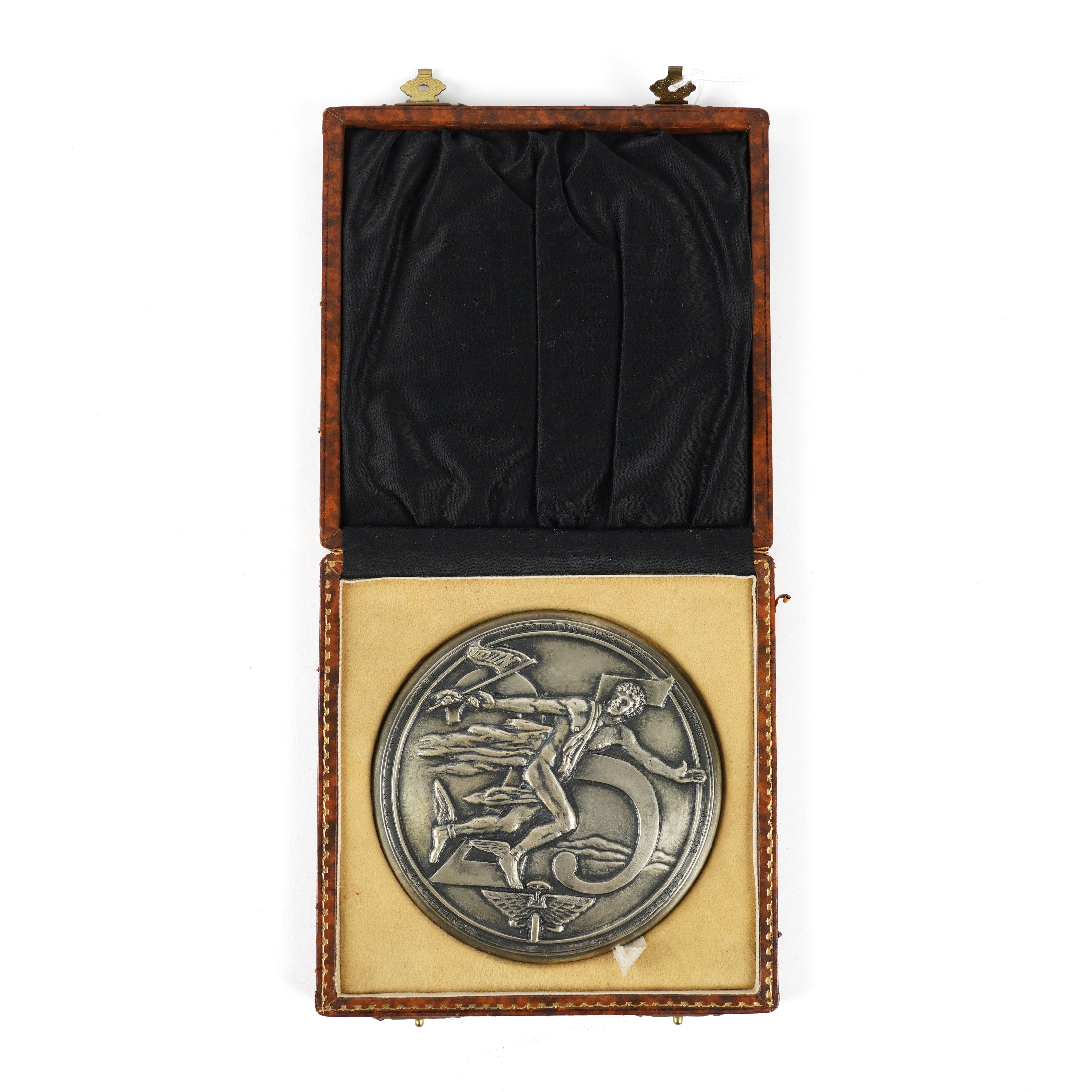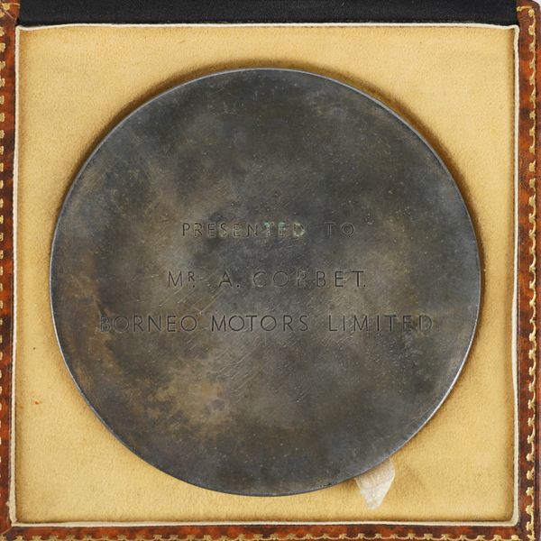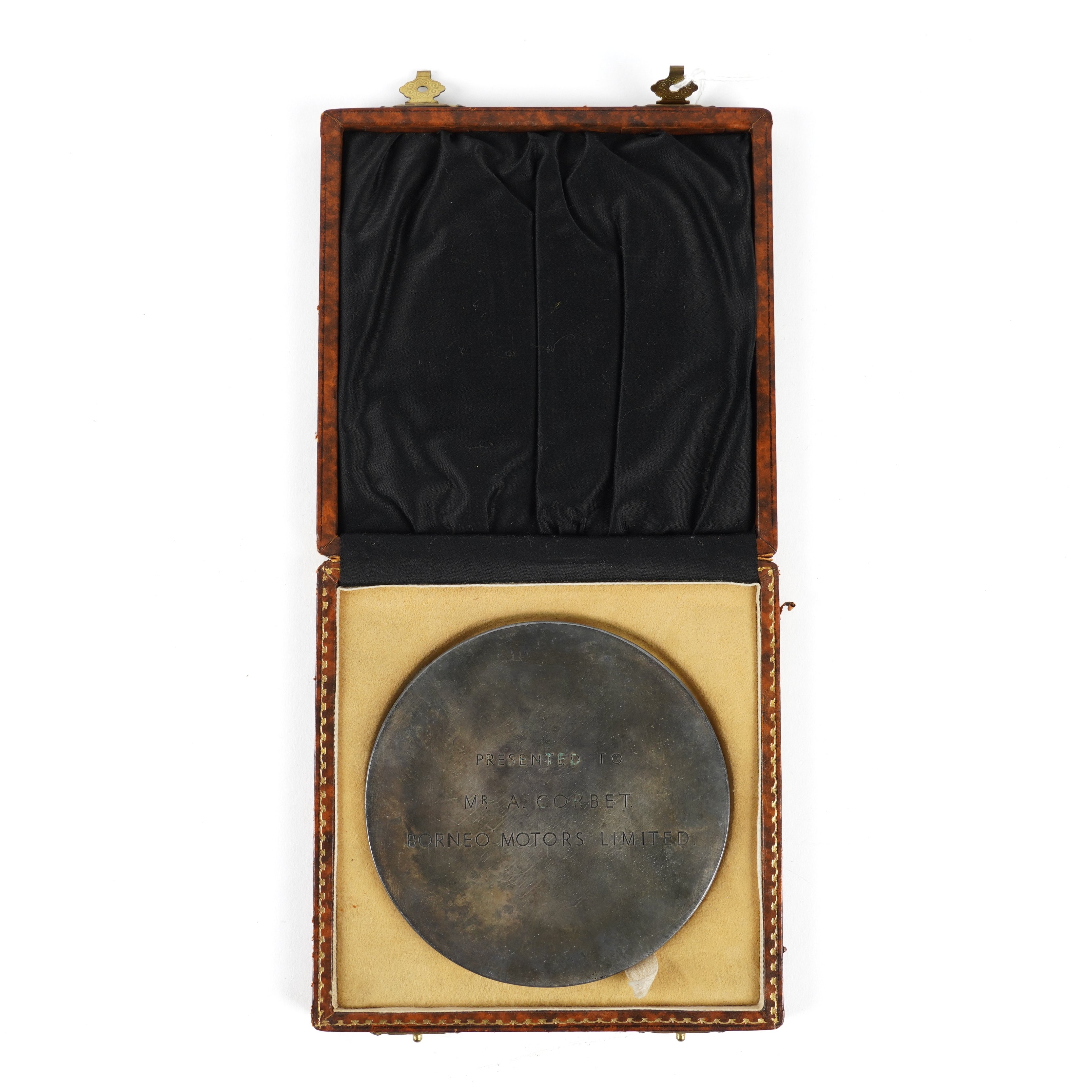 Depicting Hermes - herald and messenger of the Greek gods - guardian of roads and their commerce, detailed to the reverse Presented to Mr A Corbet, Borneo Motors Limited, diameter 11.7cm, with the original fitted case