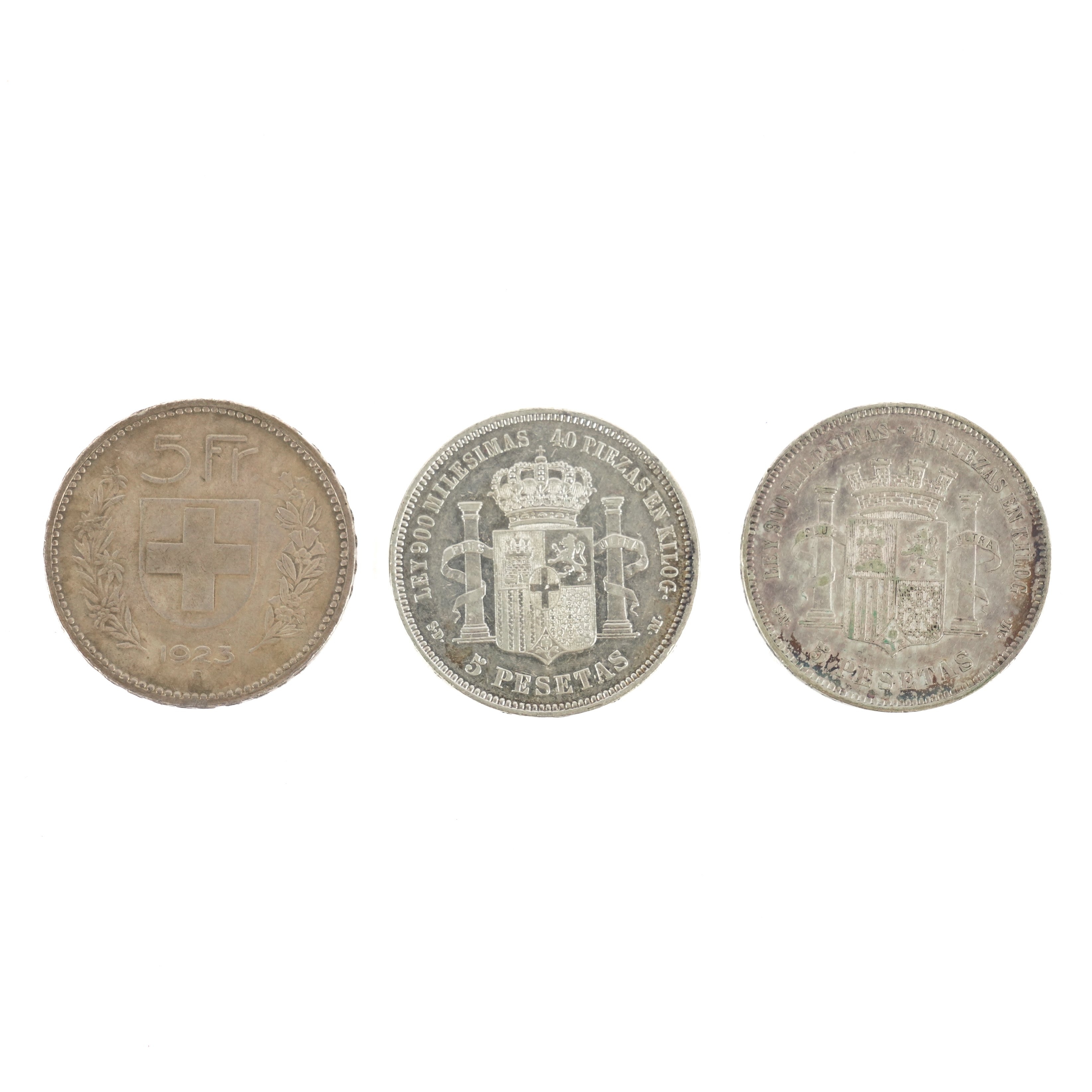 The Swiss five francs 1923B, the two Spanish five pesetas 1870 and 1871