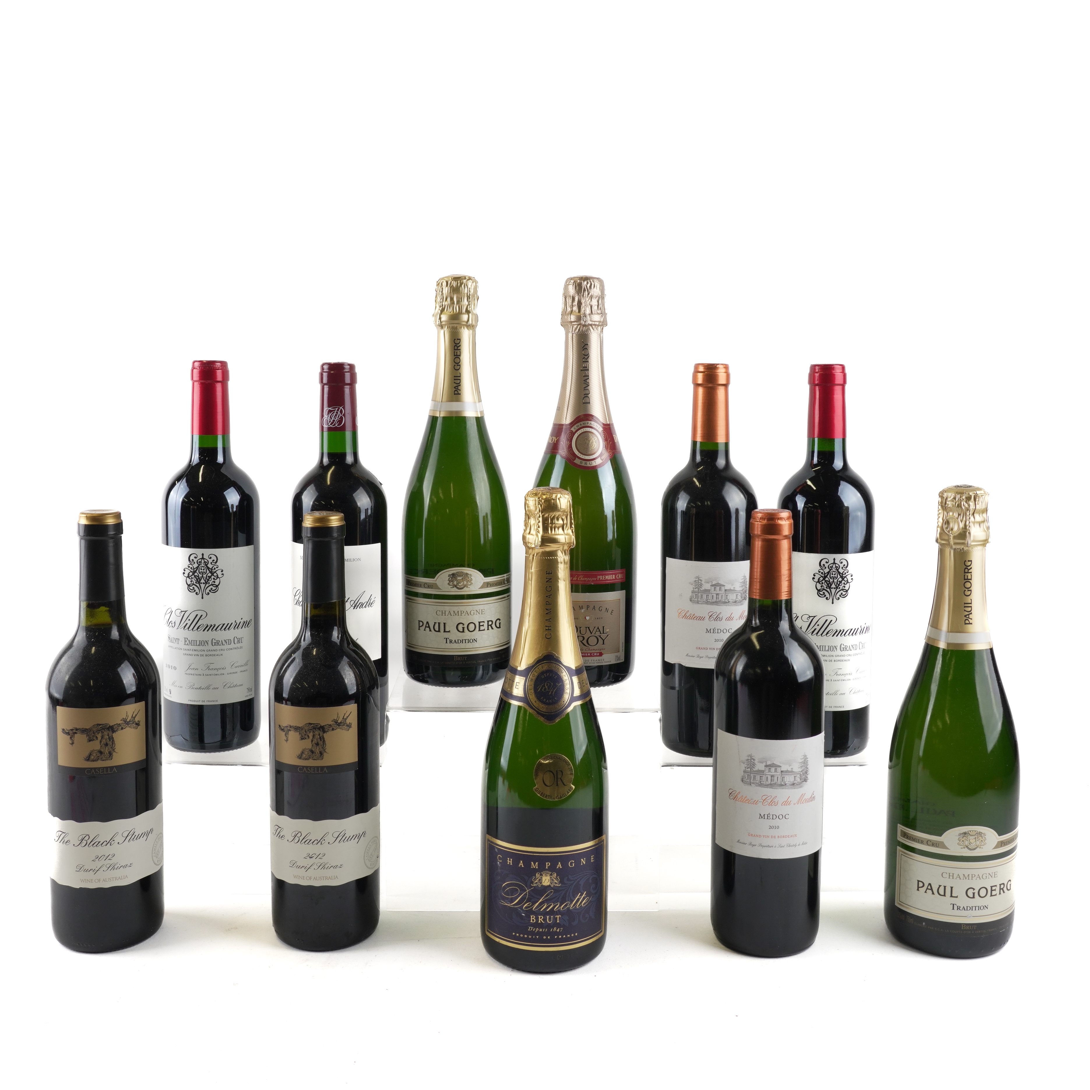 Including two bottles of Clos Villemaurine Saint-Emilion 2010, two bottles of Chateau Clos du Moulin 2010, two bottles of The Black Stump 2012, a bottle of Vieux Chateau Saint Andre 2015, two bottles of Paul Goerg Champagne, a bottle of Duval Le Roy Champagne and a bottle of Delmotte Brut Champagne