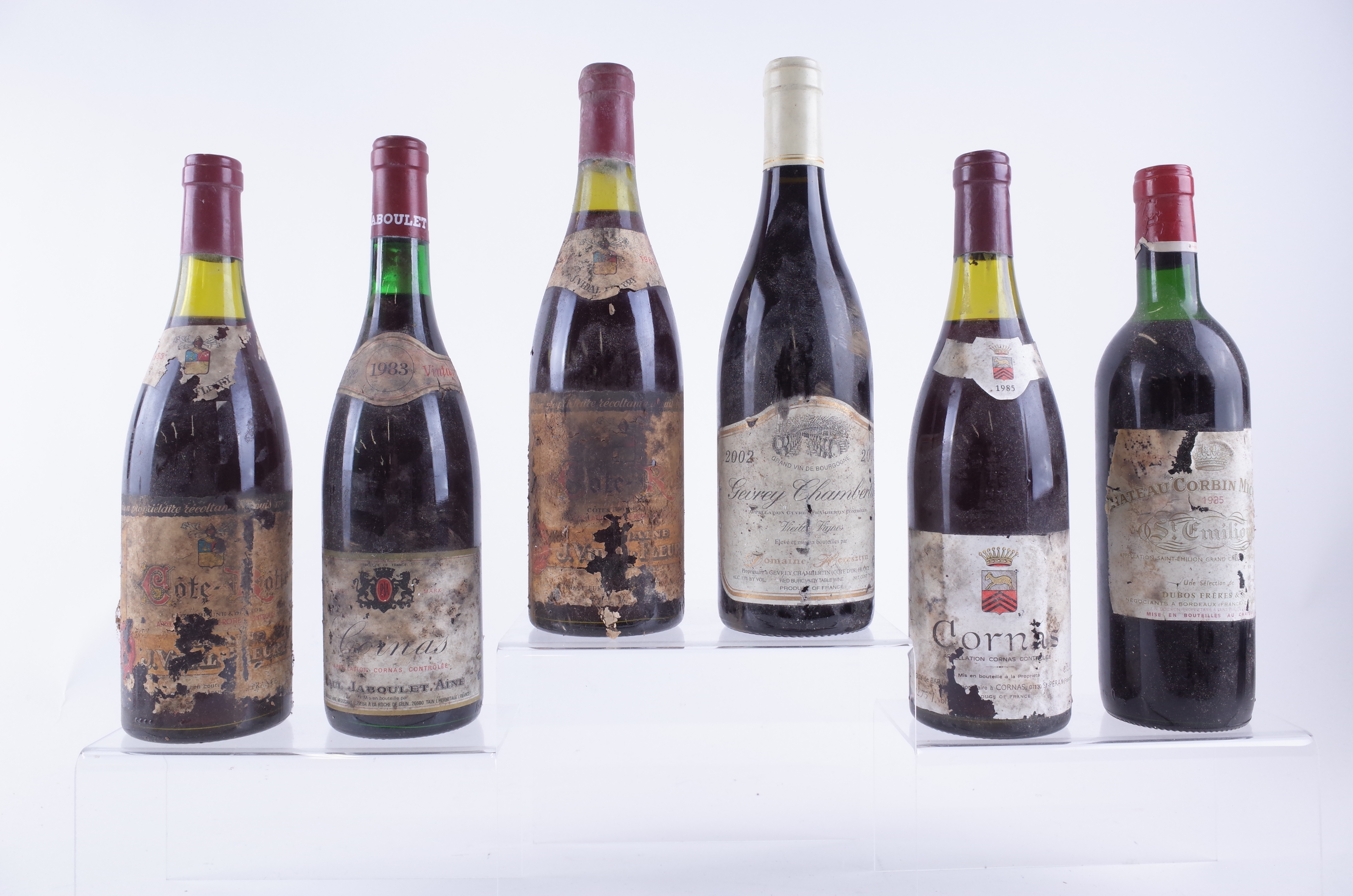 Cote-Rotie, Vidal-Fleury 1983; Gevrey-Chambertin, Vieilles Vignes, Domaine Heresztyn, 2002; Cote-Rotie, Vidal-Fleury 1983; Cornas, Guy de Barjac, 1985; Chateau Corbin Michotte, St Emilion, 1985; Cornas, Paul Jaboulet Aine, 1983 (see additional photographs).