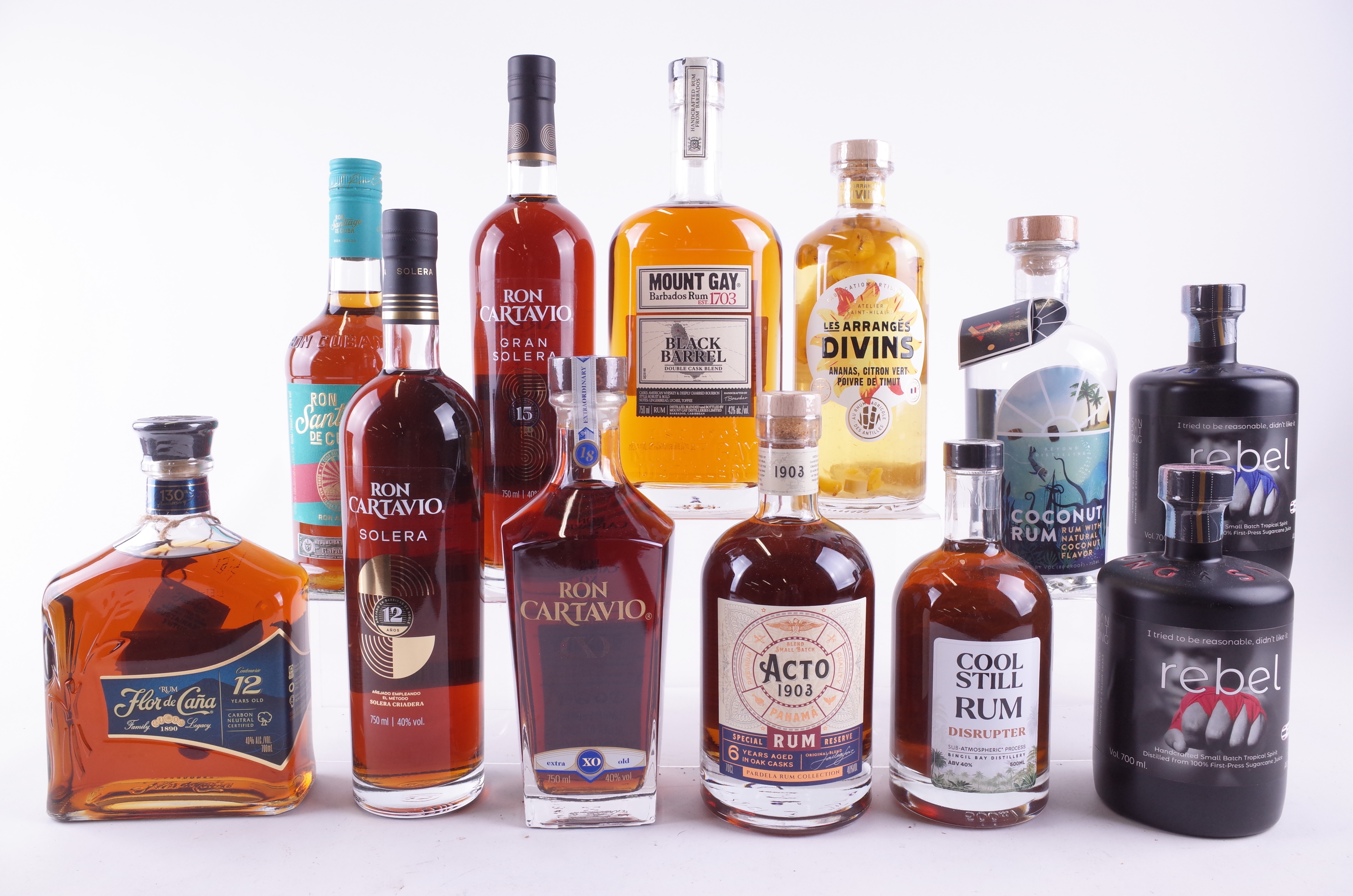 Flor de Caña 12 Years Old; Ron Cartavio Solera 12 Years Old, XO and Gran Solera; Acto Special Reserve 6 Years Aged in Oak; Bingil Bay Distillery Disrupter Cool Still (50cl); Sanpatong Distillery Co 2 x Rebel; Rob Santiago de Cuba Añejo 8 Years; Mount Gay Black Barrel Double Cask Blend; Les Arrangés Divins Pineapple, Lime + Timut Pepper; Beyond Distilling Coconut