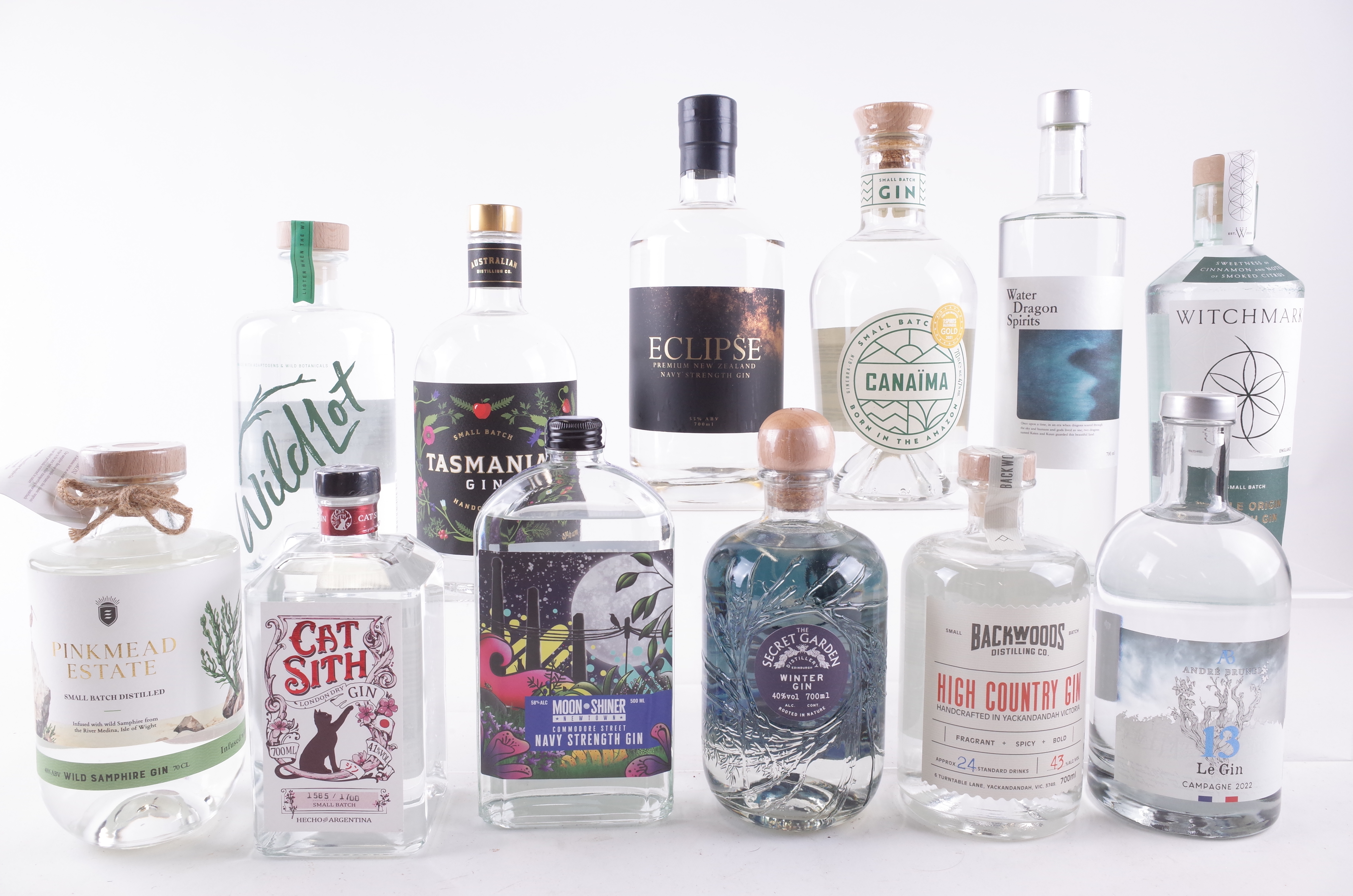 Pink Mead Estate Small Batch Wild Samphire; Cat Sith London Dry; Moon Shiner Navy Strength (50cl); The Secret Garden Winter; Backwoods Distilling Co High Country; André Brunel 13 Le Gin Campagne 2022; Witchmark Single Origin Small Batch Black Lime; Whiskey + Co Water Dragon Spirits; Canaïma Small Batch; Eclipse Premium Navy Strength; Australian Distilling Co Tasmania Small Batch; Wild Lot Small Batch