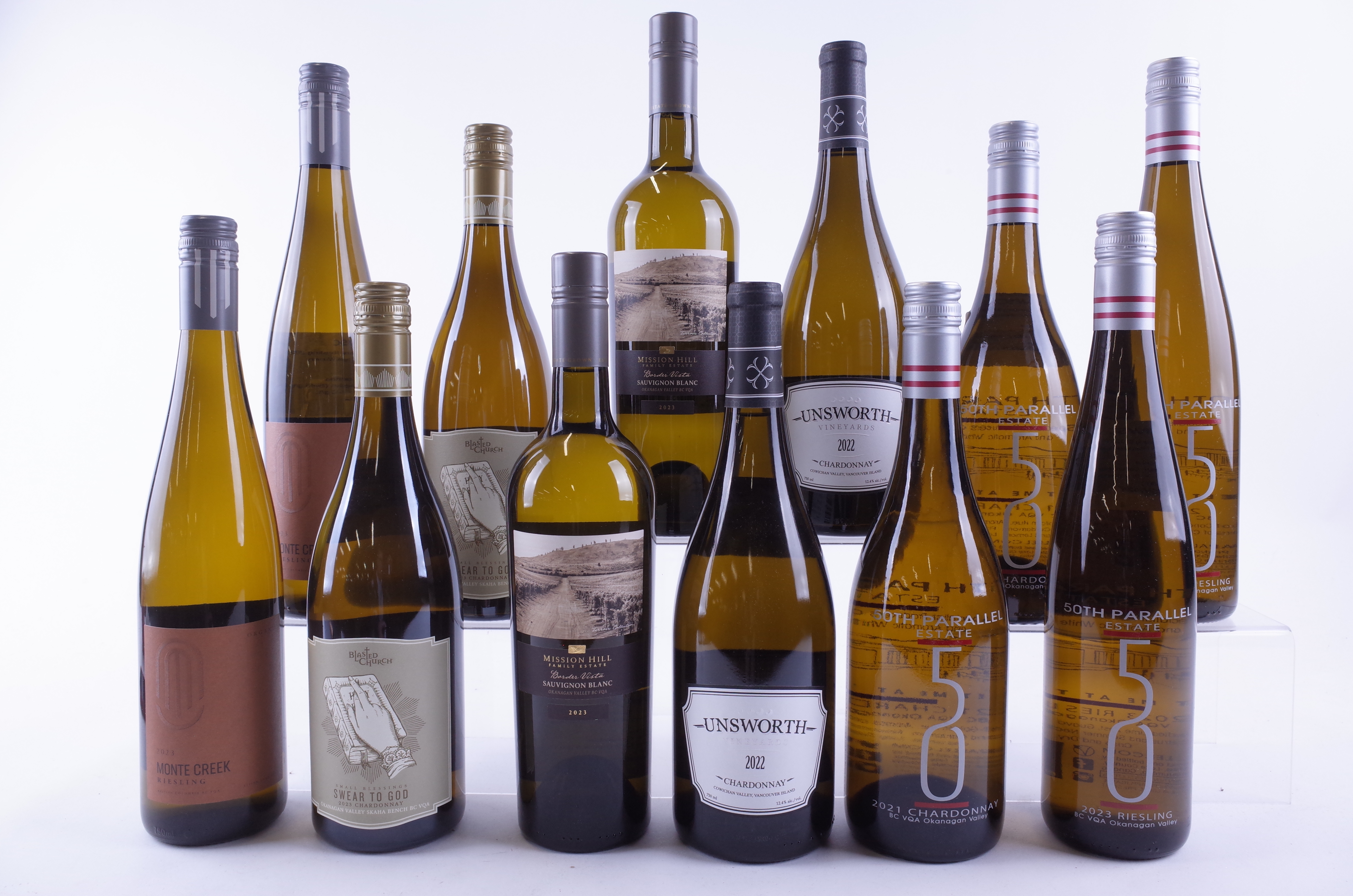 Monte Creek Winery 2 x Living Land Riesling 2023; Blasted Church Vineyards 2 x Swear To God Chardonnay 2023; Mission Hill Family Estate Winery 2 x Terroir Sauvignon Blanc 2023; Unsworth Vineyards 2 x Cowichan Valley Chardonnay 2022; 50th Parallel Estate 2 x Chardonnay 2021 and 2 x Riesling 2023