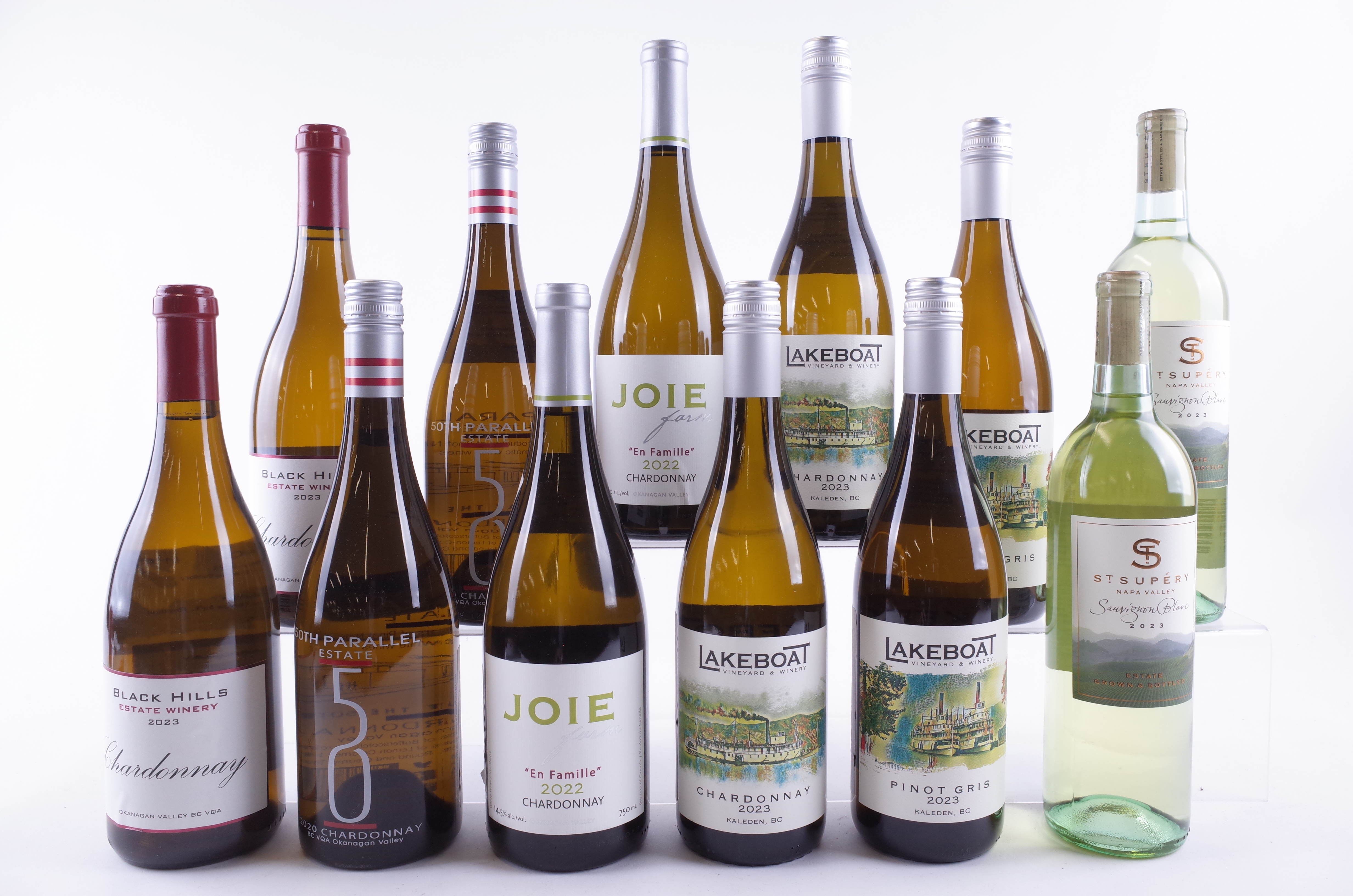 Black Hills Estate Winery 2 x Chardonnay 2023; 50th Parallel Estate 2 x Chardonnay 2020; Joie Farm Winery 2 x En Famille Chardonnay 2022; Lakeboat Vineyard + Winery 2 x Chardonnay 2023 and 2 x Pinot Gris 2023; St Supéry Estate Vineyards + Winery 2 x Sauvignon Blanc 2023