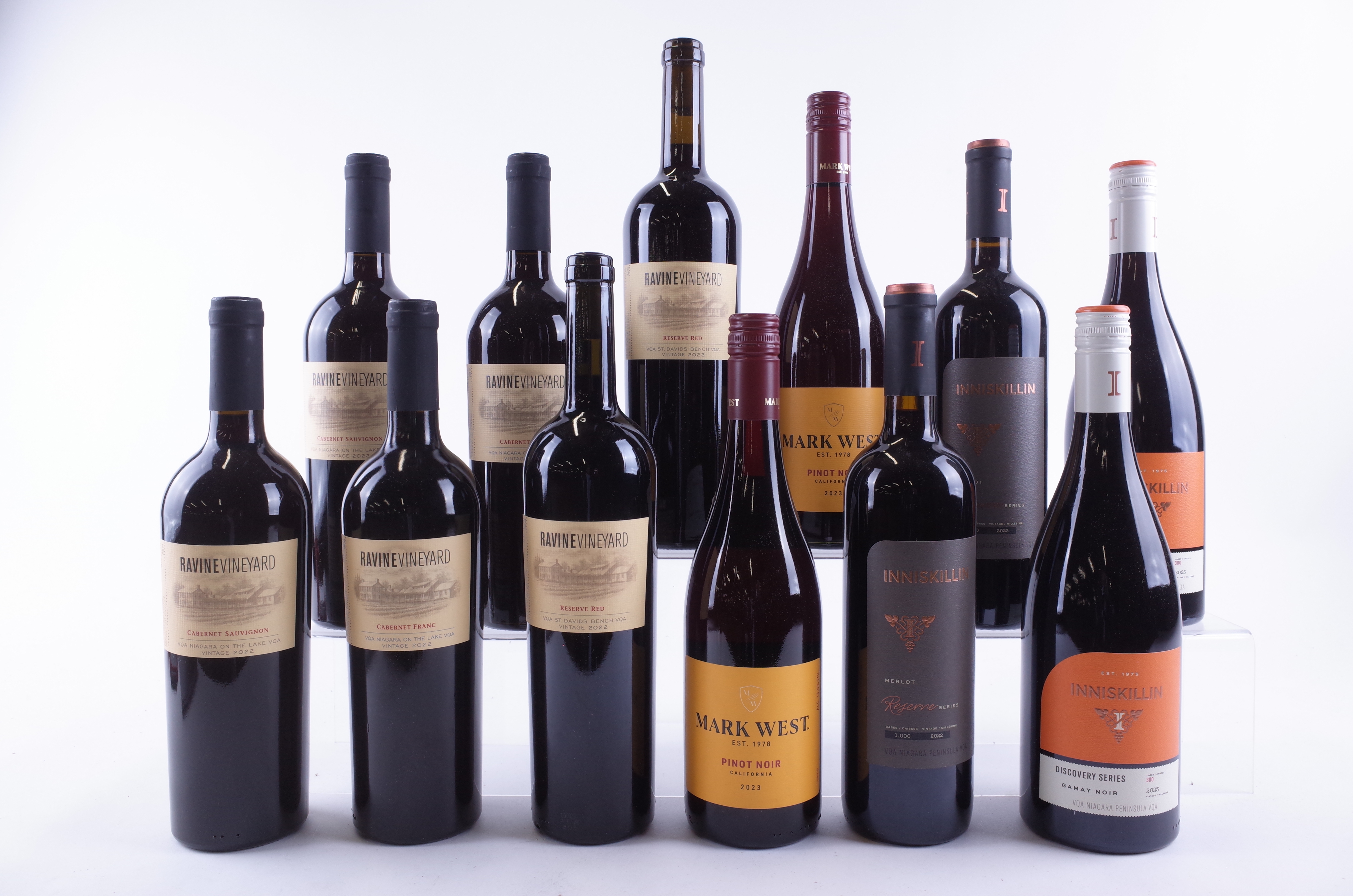 Ravine Vineyard Estate Winery 2 x Cabernet Sauvignon 2022, 2 x Cabernet Franc 2022 and 2 x Reserve Red 2022; Inniskillin 2 x Reserve Merlot 2022 and 2 x Discovery Series Gamay Noir 2023; Mark West 2 x Mark West Pinot Noir 2023