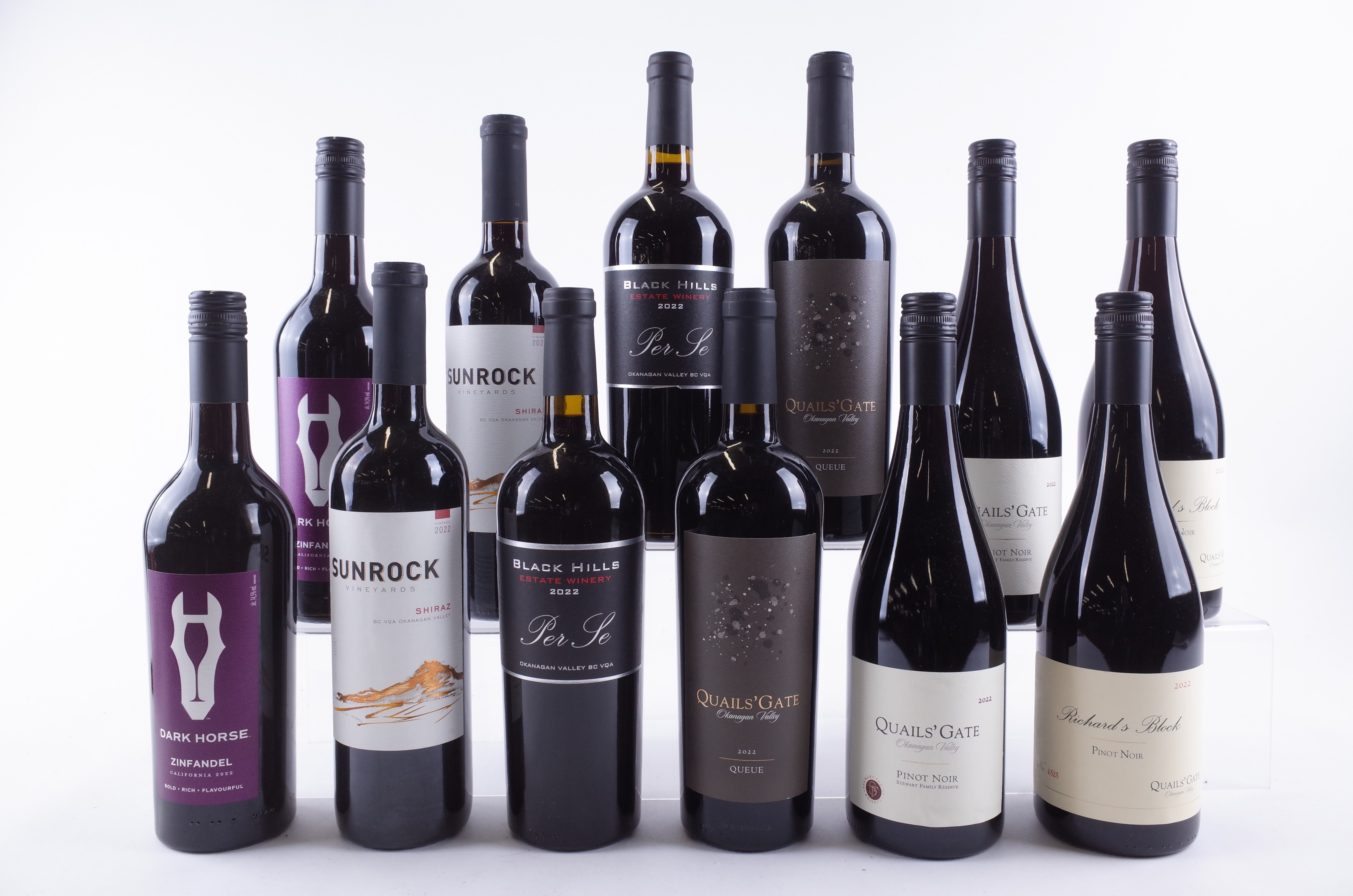 Sun Rock Vineyards 2 x Shiraz 2022; Black Hills Estate Winery 2 x Per Se 2022; Quails' Gate Estate Winery 2 x Queue 2022, 2 x Stewart Family Pinot Noir 2022 and 2 x Richard's Block Pinot Noir 2022; Dark Horse 2 x Zinfandel 2022