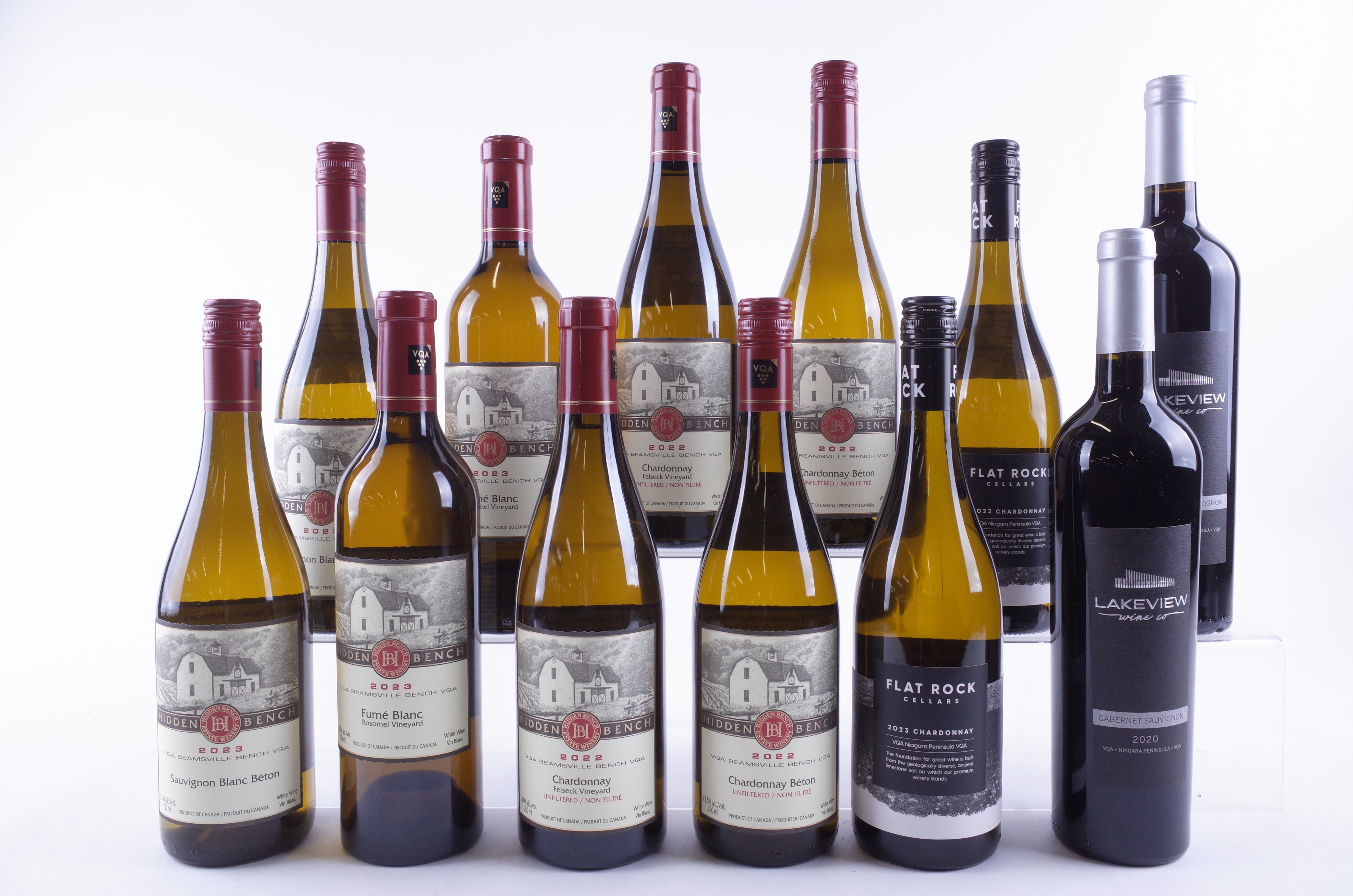 Hidden Bench Estate Winery 2 x Béton Sauvignon Blanc 2023, 2 x Rosomel Vineyard Fumé Blanc 2023, 2 x Felseck Vineyard Chardonnay 2022 and 2 x Béton Chardonnay 2022; Flat Rock Cellars 2 x Foundation Chardonnay 2023; Lakeview 2 x Cabernet Sauvignon 2020