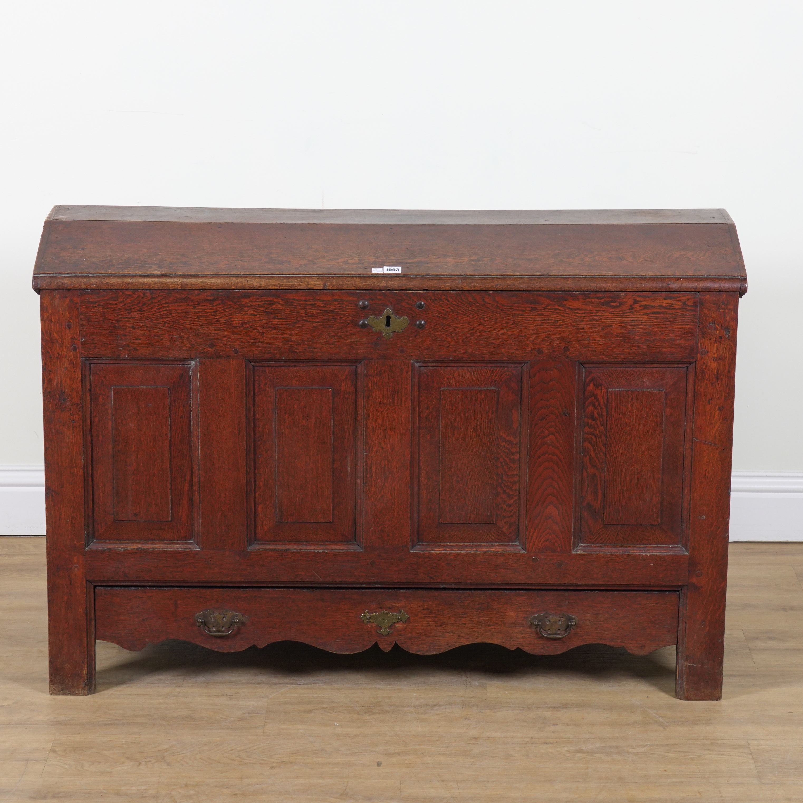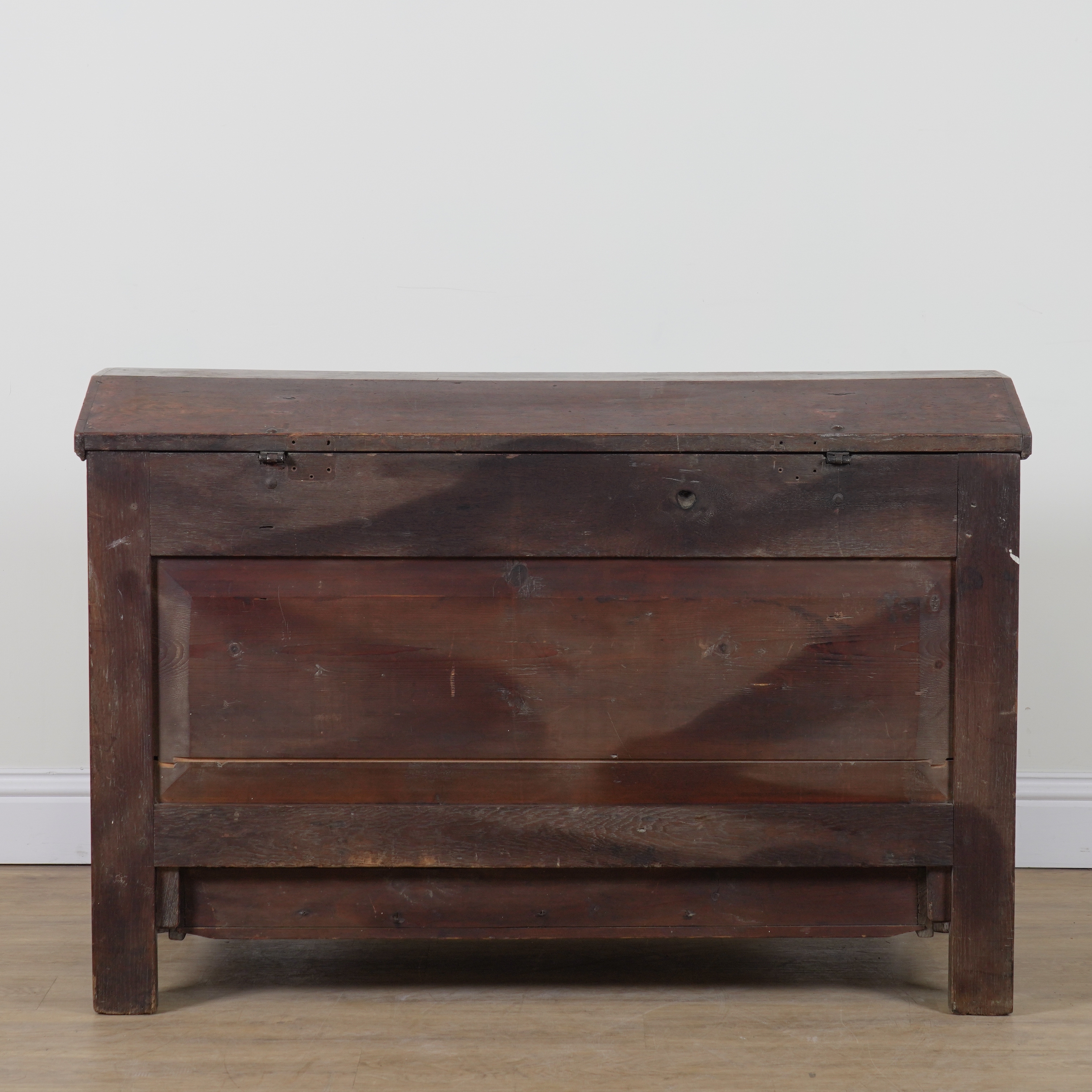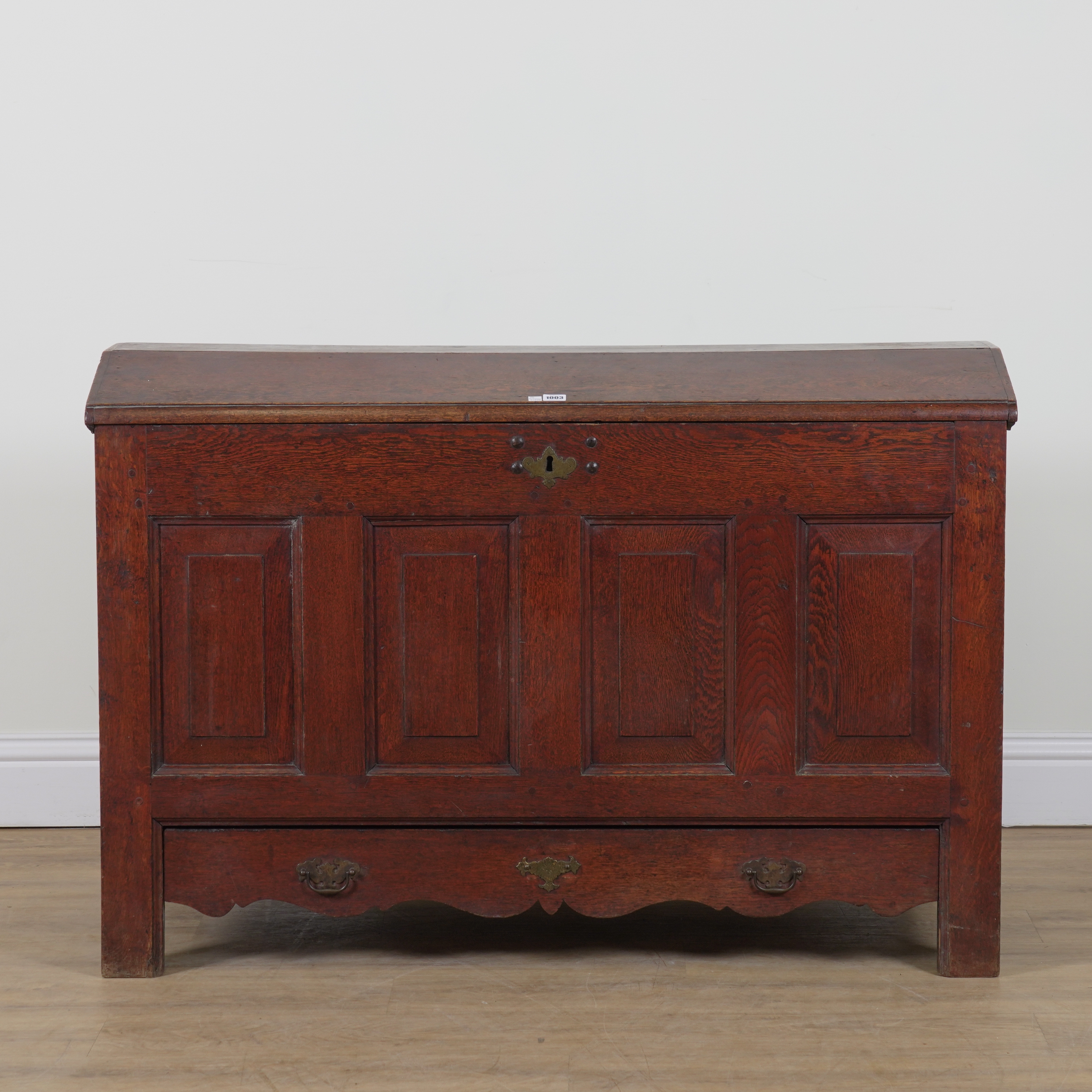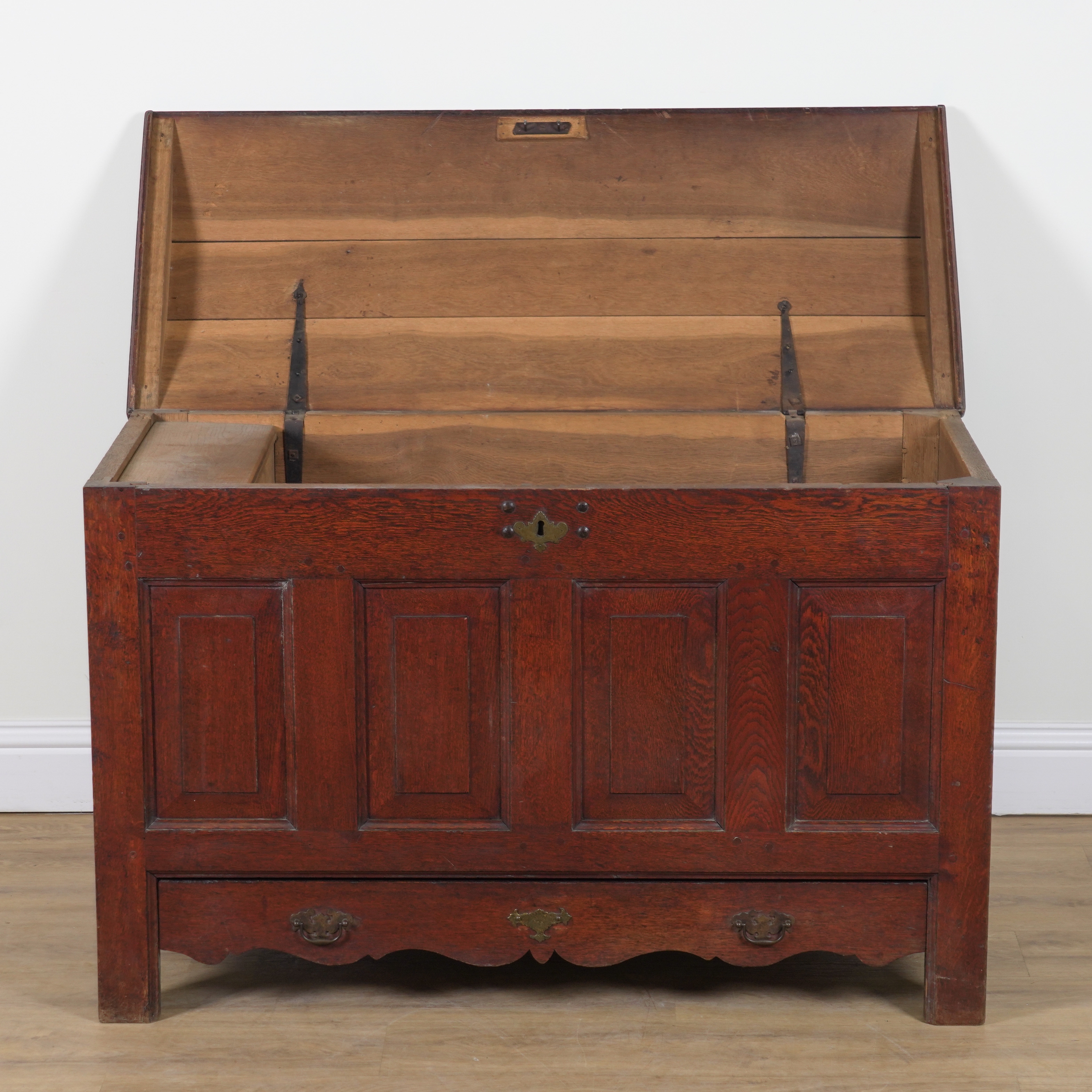 With four panelled front over single long drawer, 127cm wide; 54cm deep; 85cm high