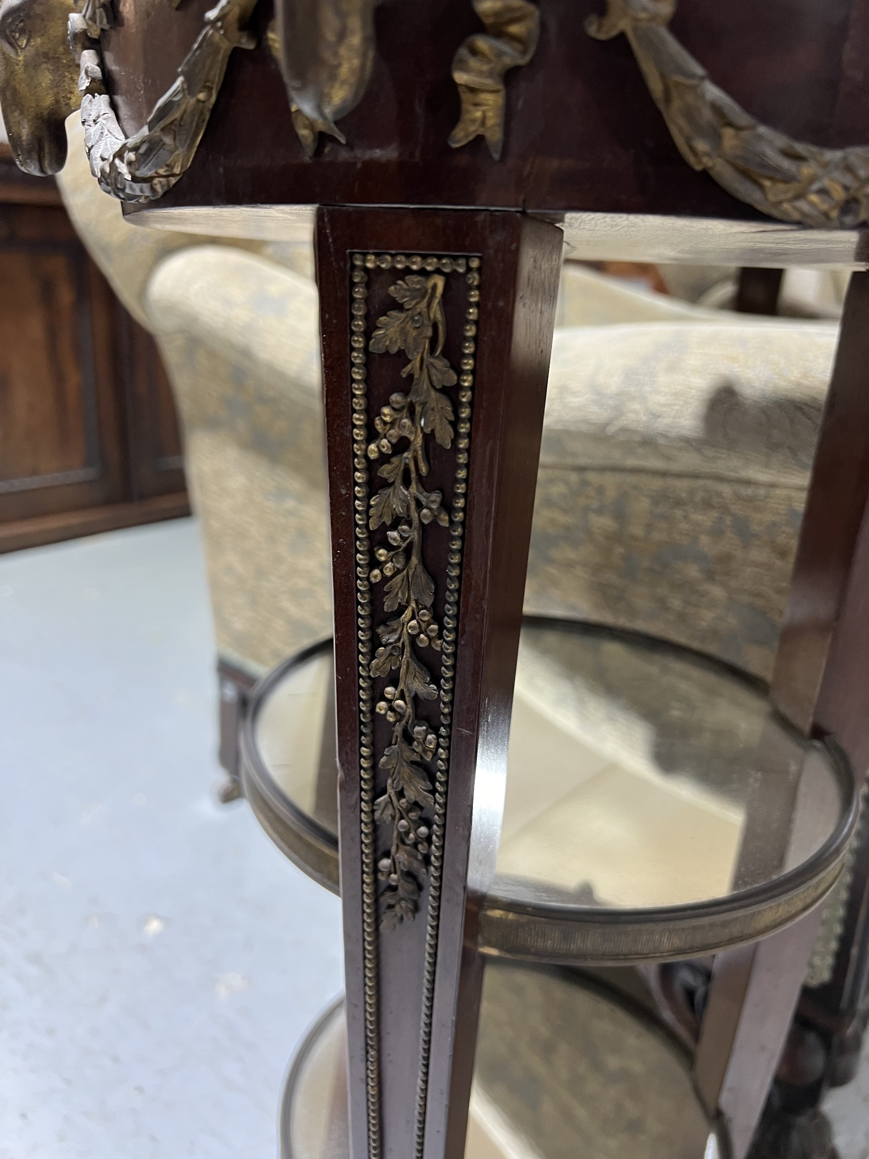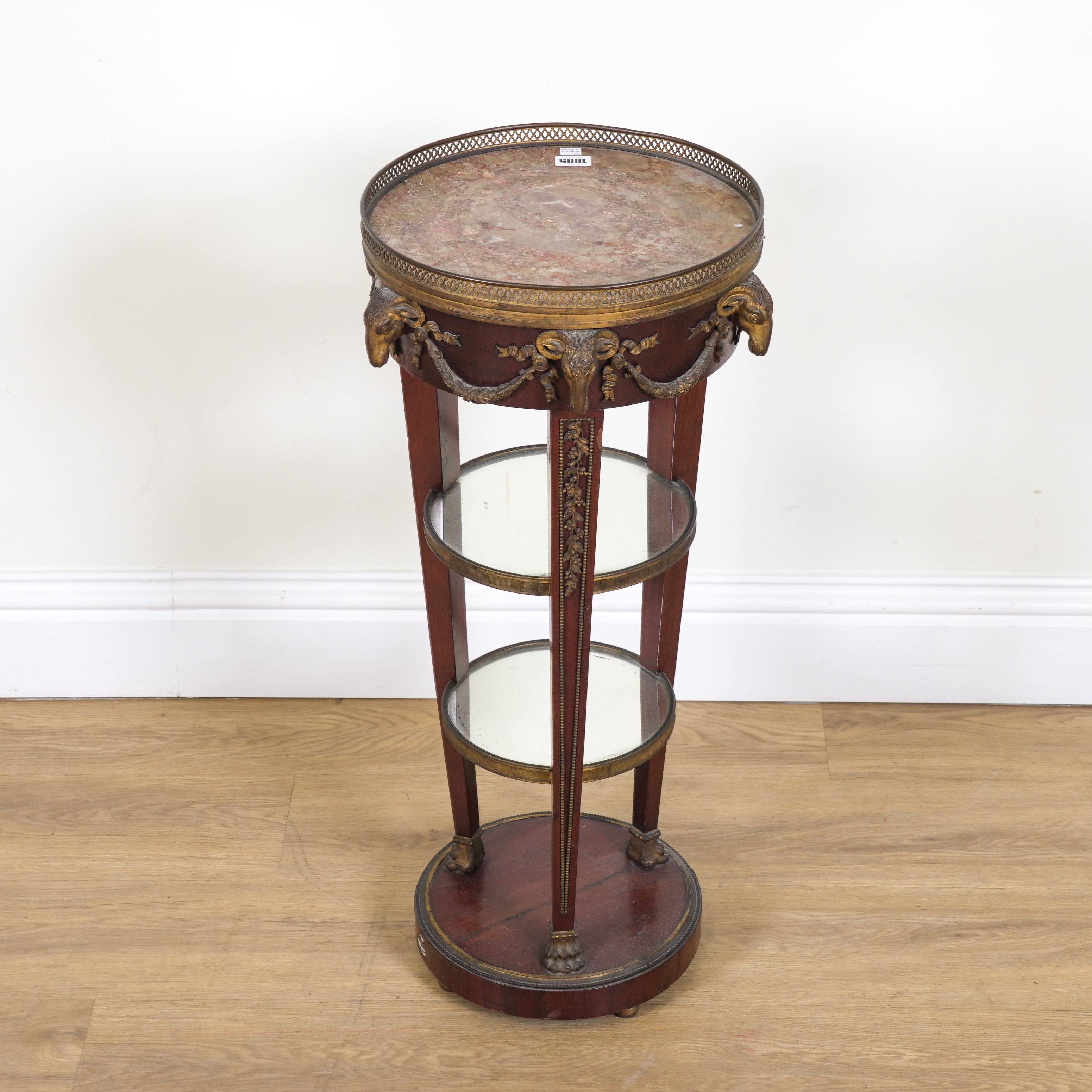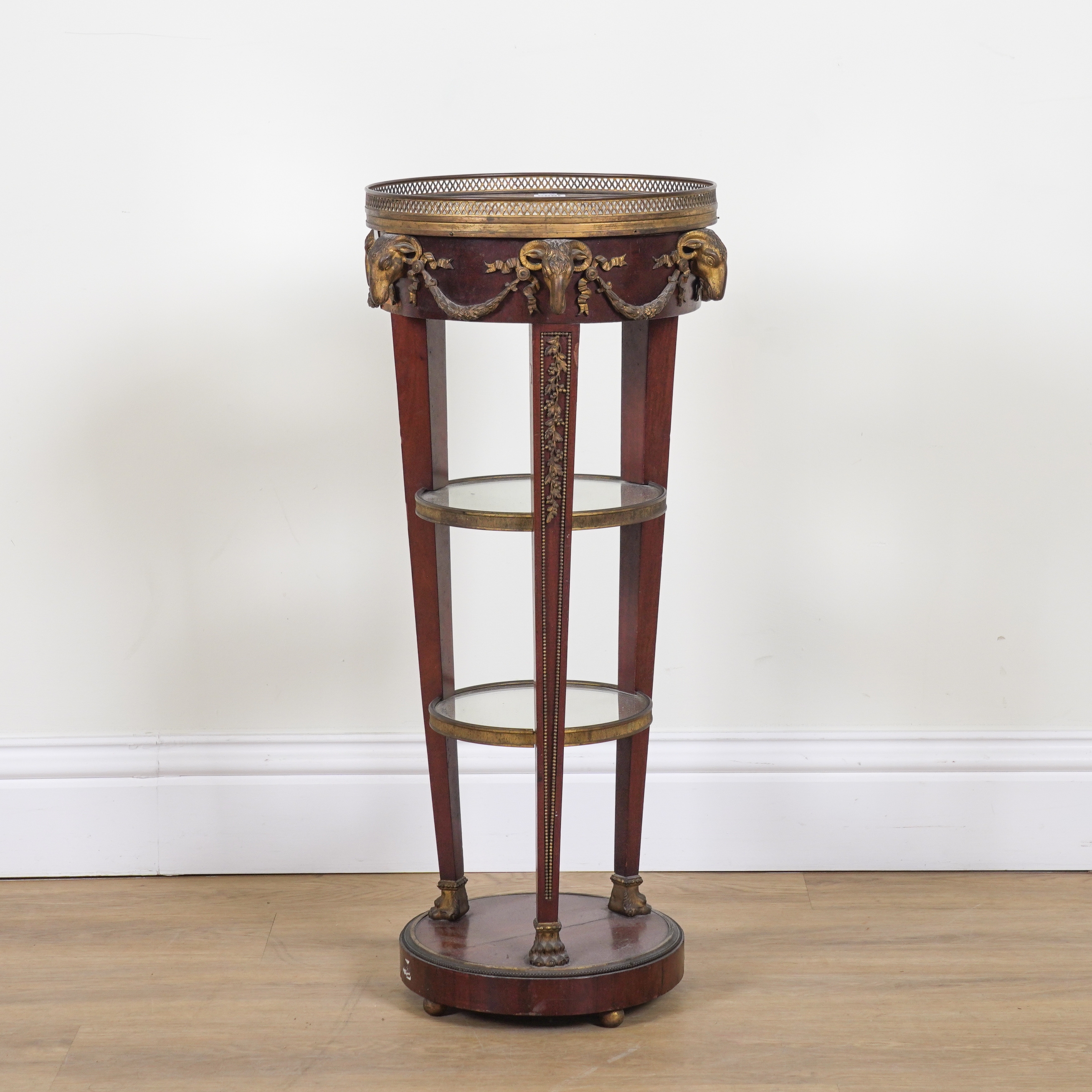 A FRENCH EMPIRE STYLE MAHOGANY GILT METAL MOUNTED THREE TIER JARDINIERE STAND