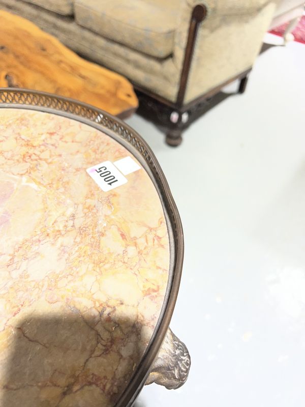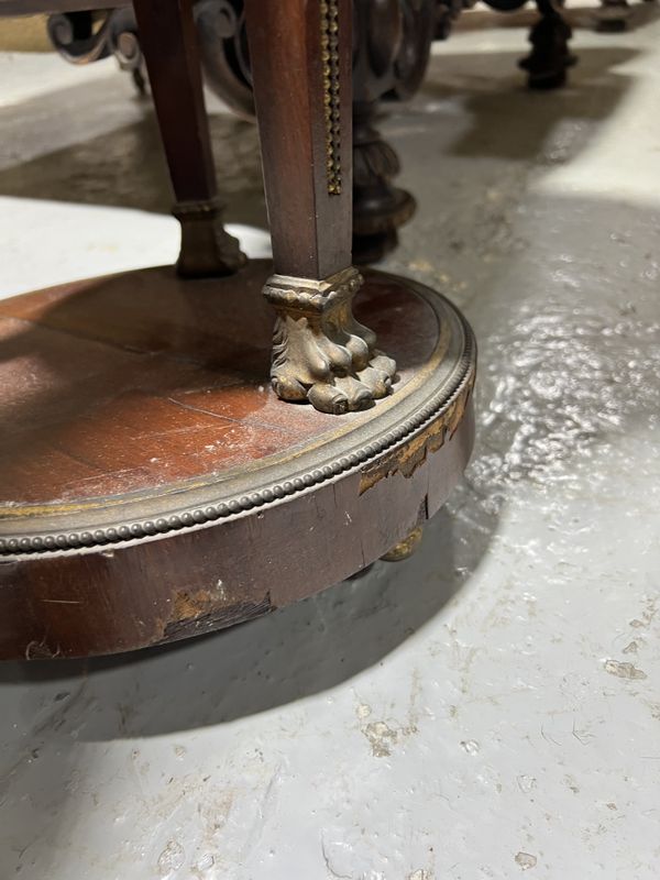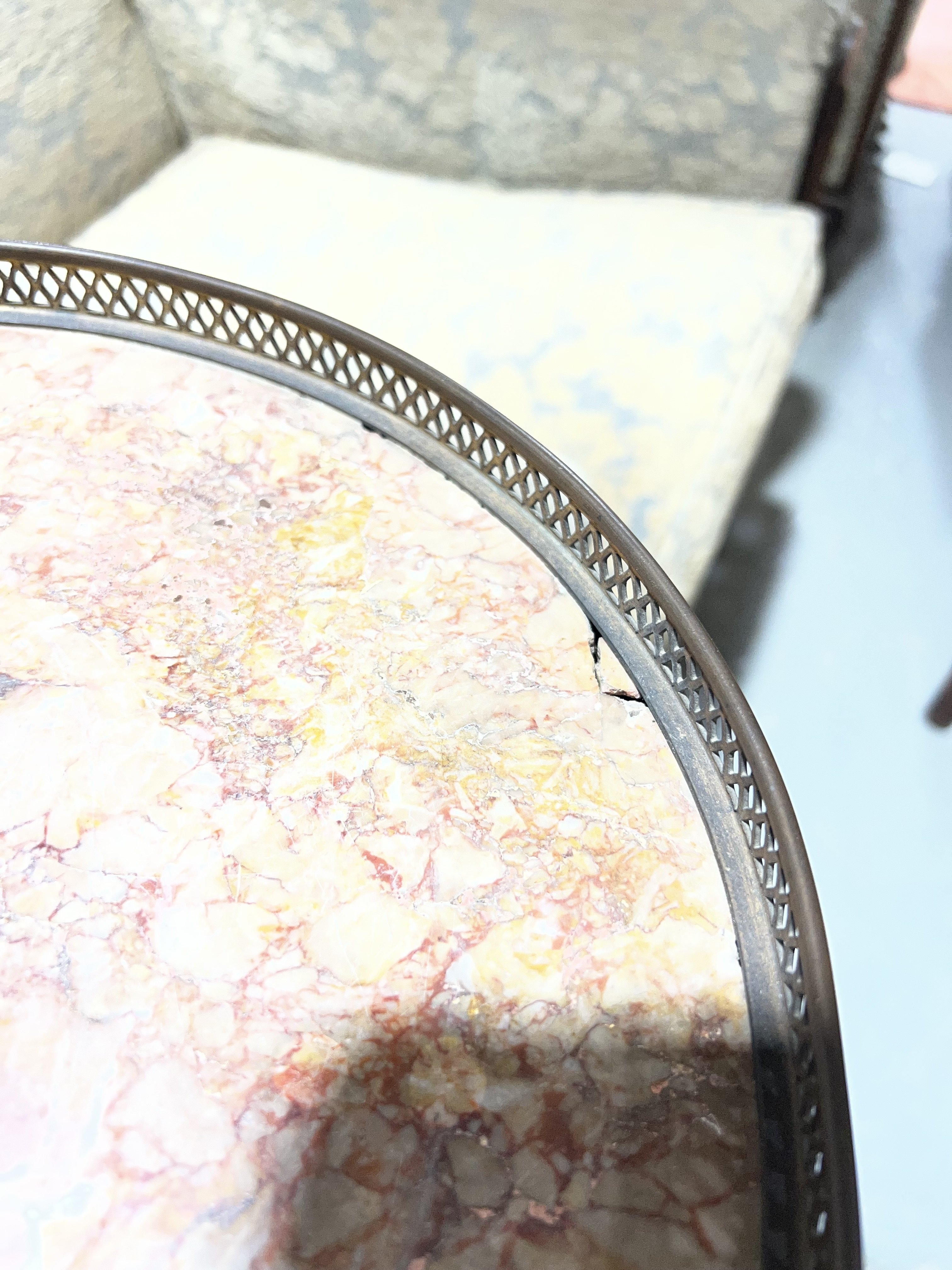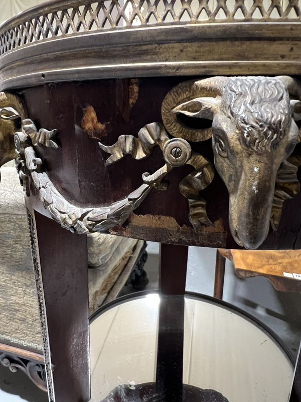 brass gallery bent, chip present to the marble top, losses of veneer around the top edge by rams heads, two splits the base and losses of veneer around the base section see images.