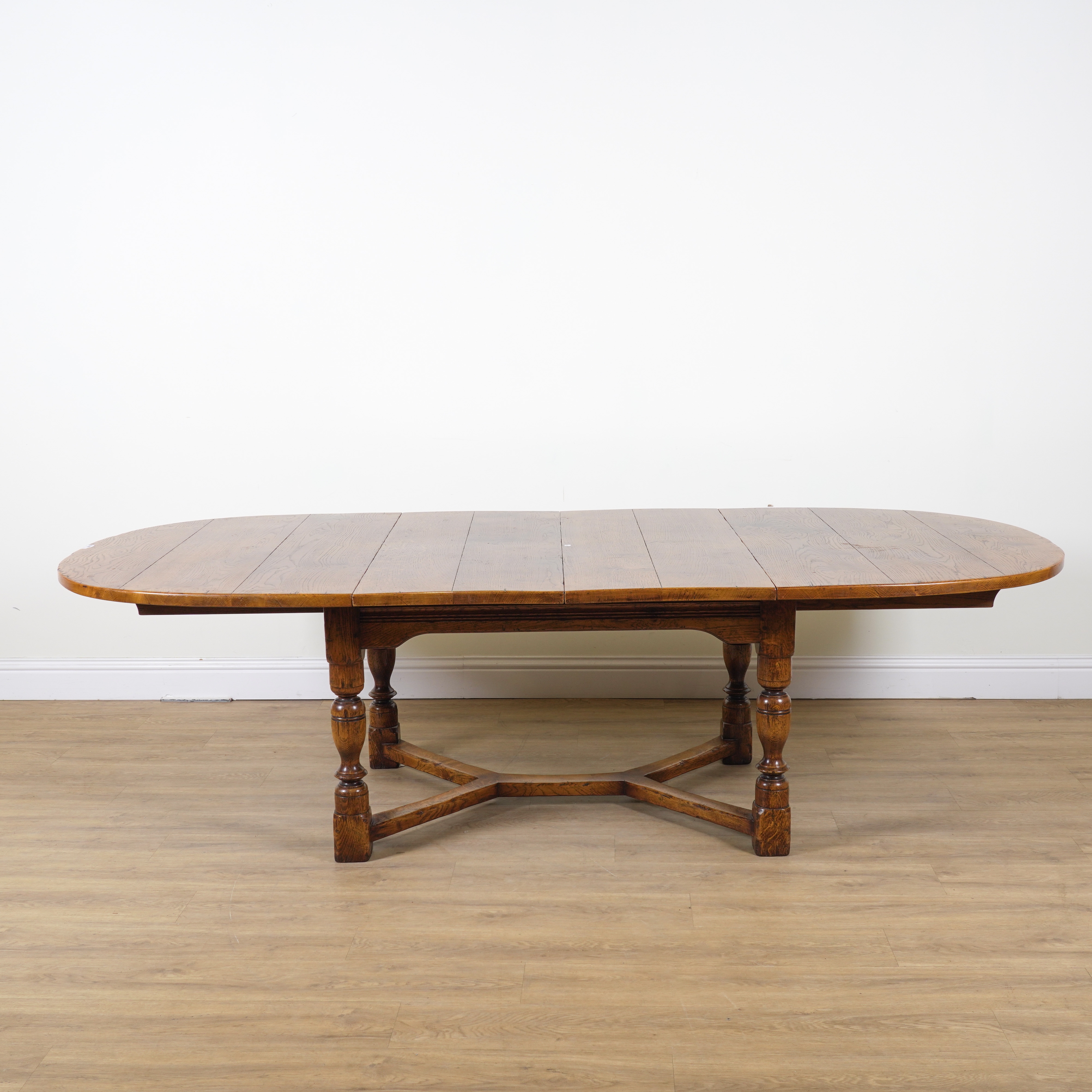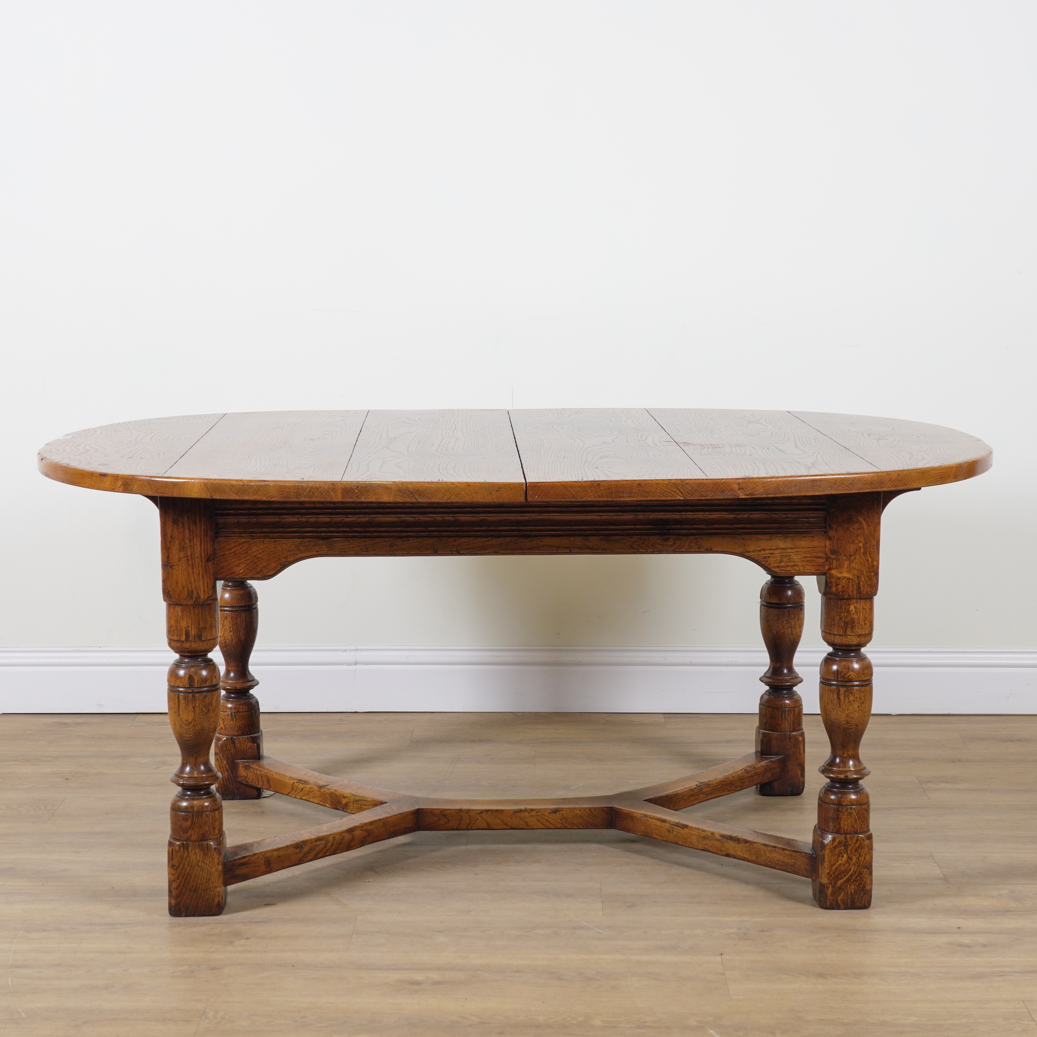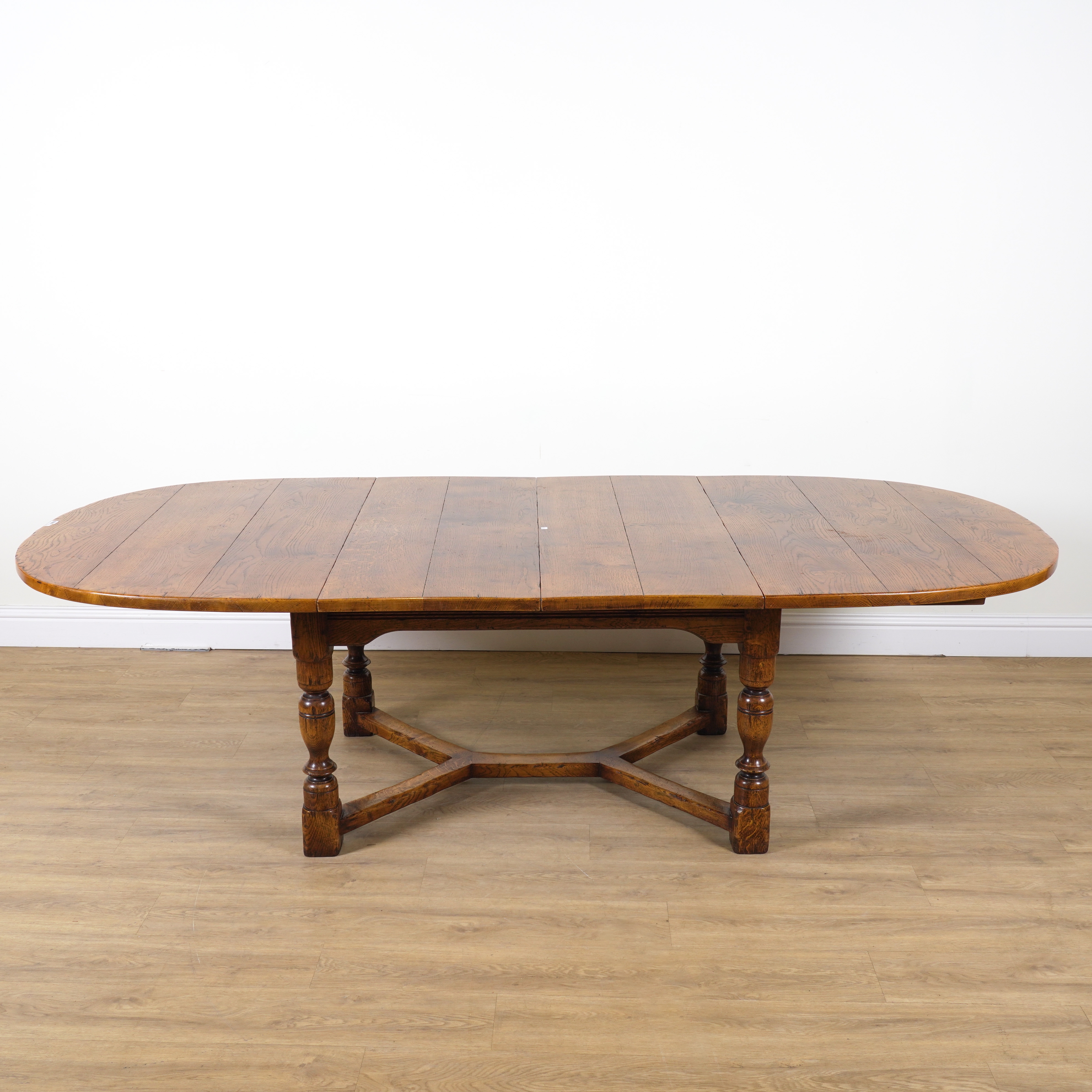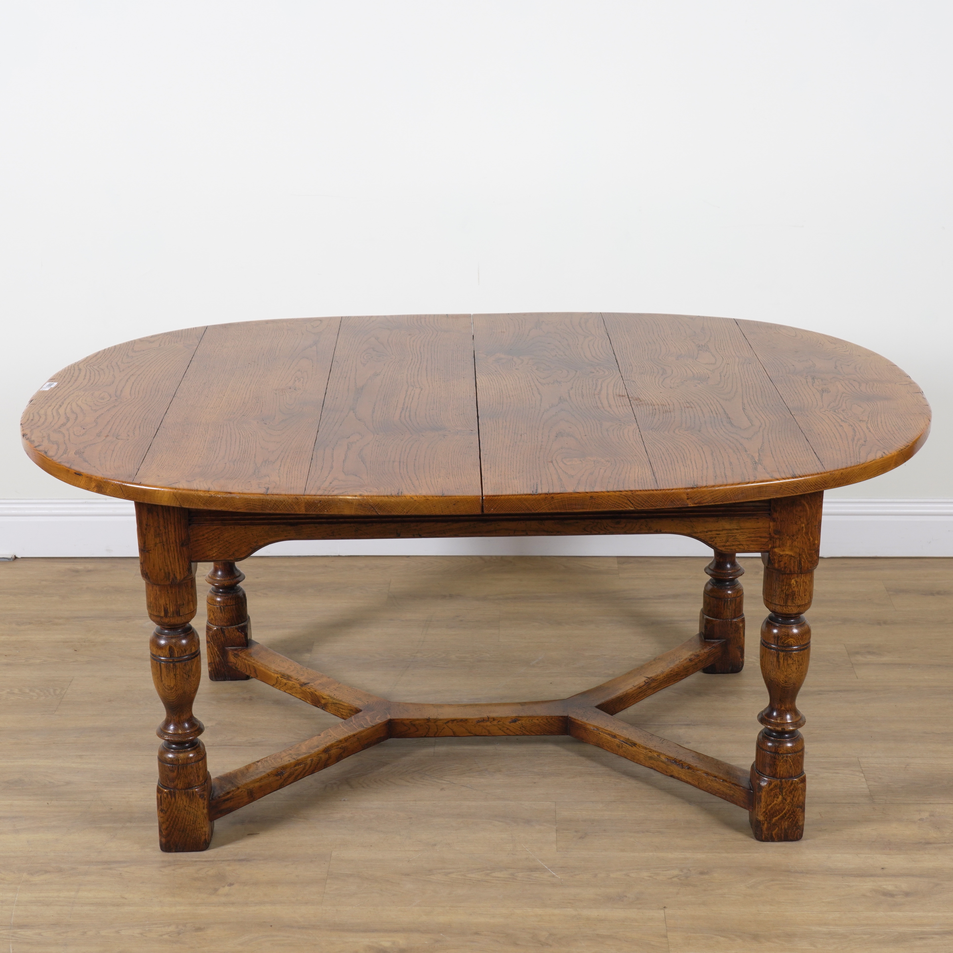 A 17TH CENTURY STYLE OAK DRAWLEAF EXTENDING OVAL DINING TABLE