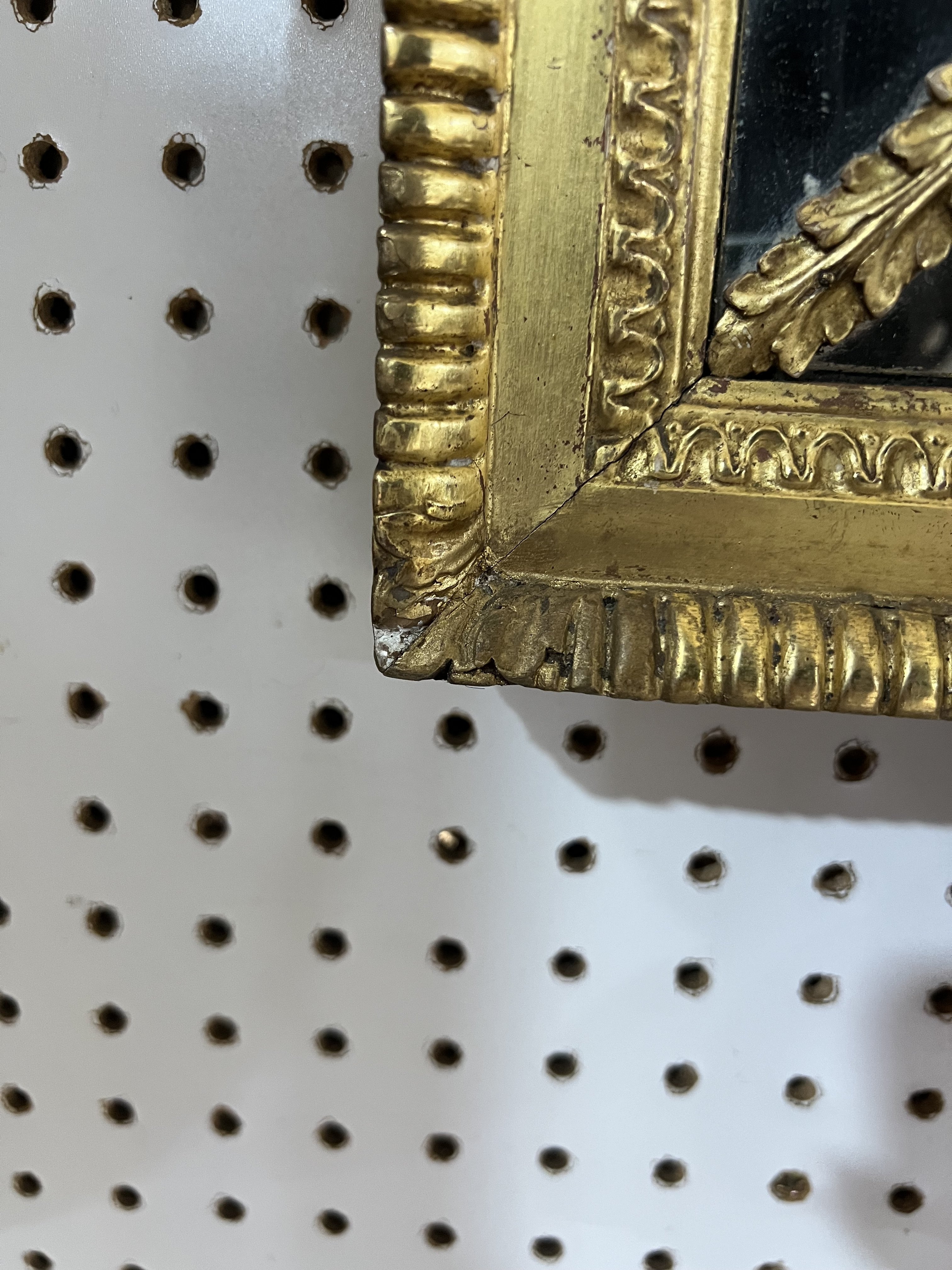 good overall condition, one very small loss to bottom left corner, see image, left side swag decoration slightly bent outwards as can be seen in the main image.