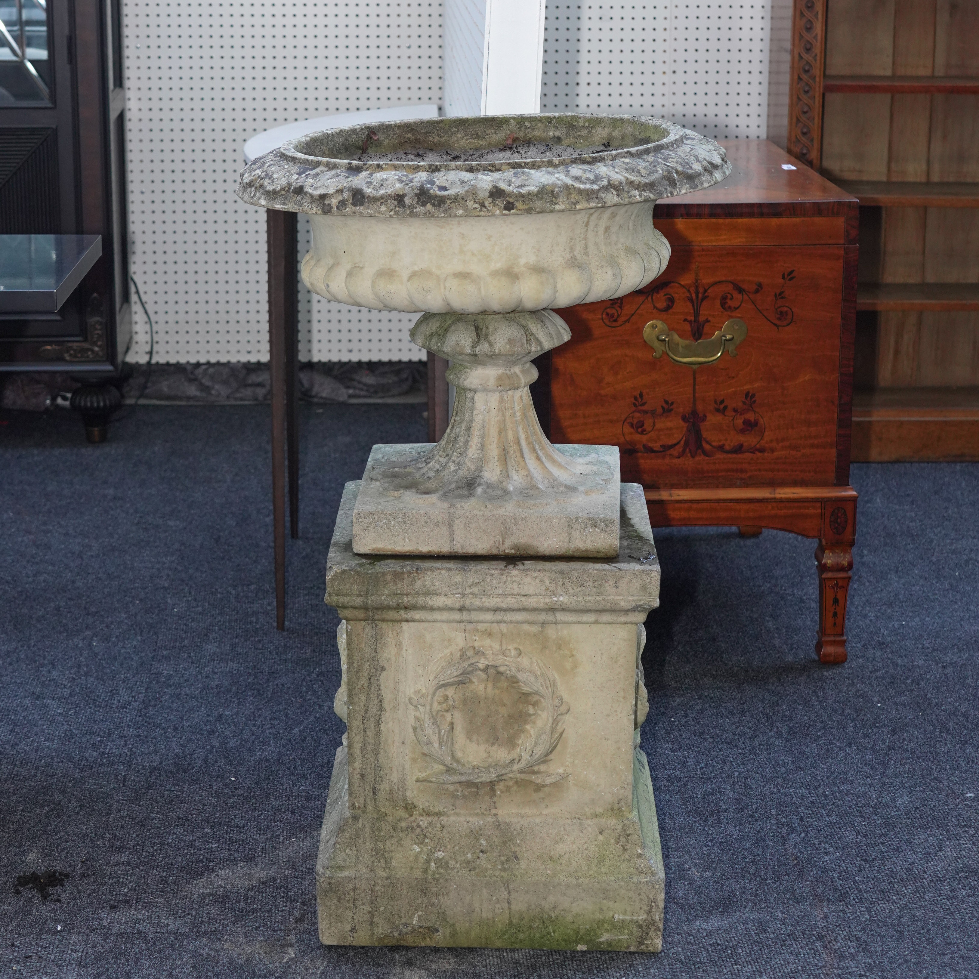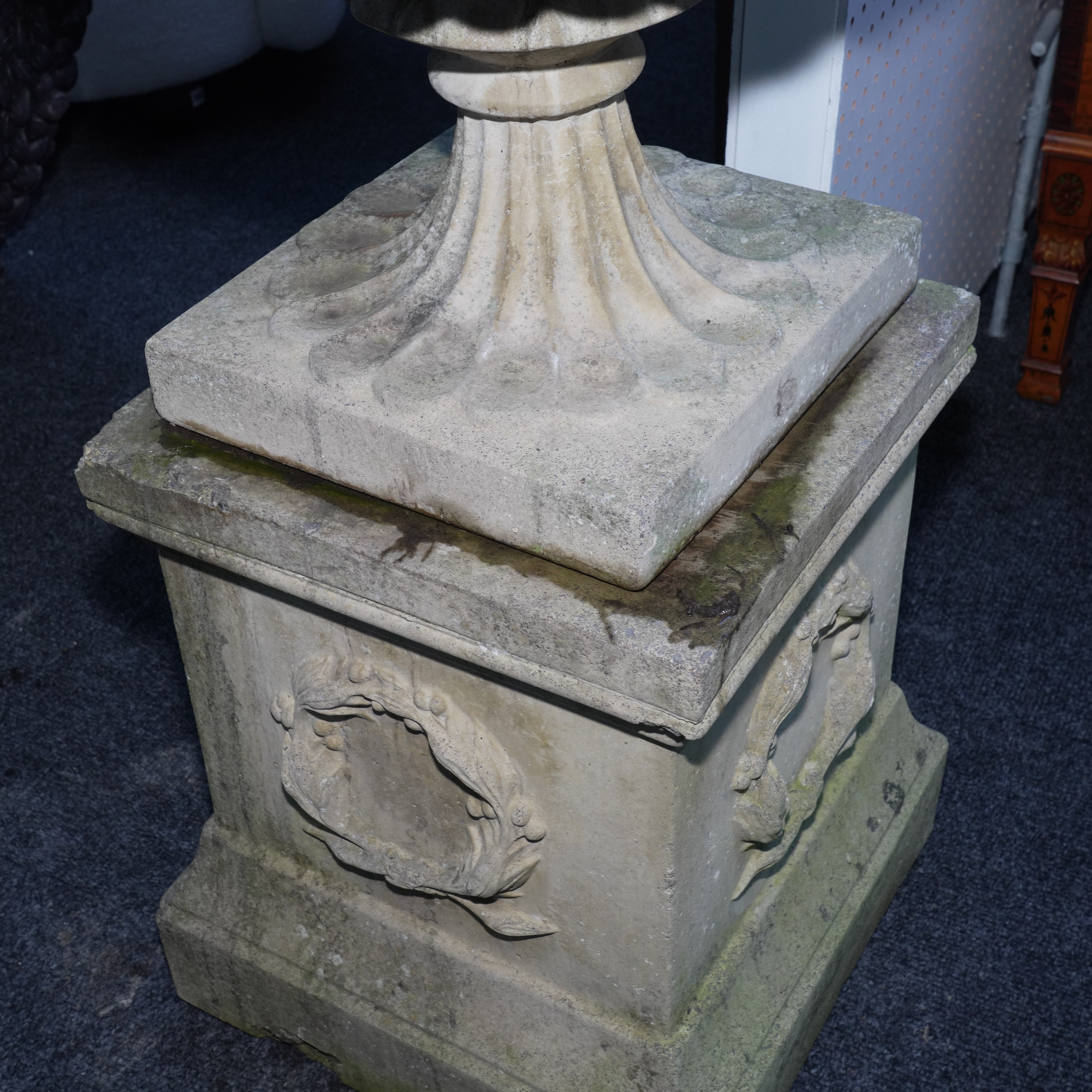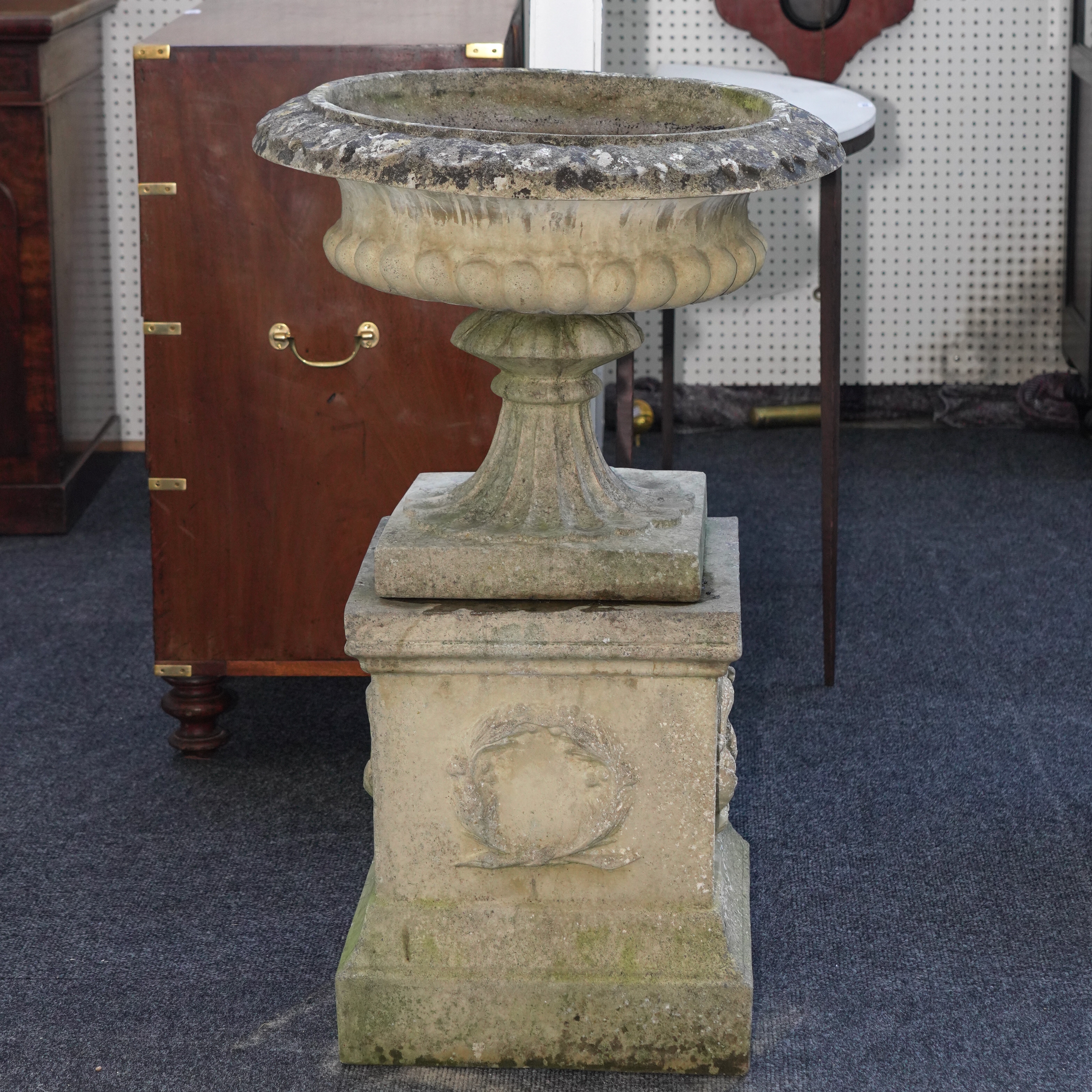 Each with semi-lobed bodies, and fluted socles on stepped square pedestals, 65cm diameter, 107cm high