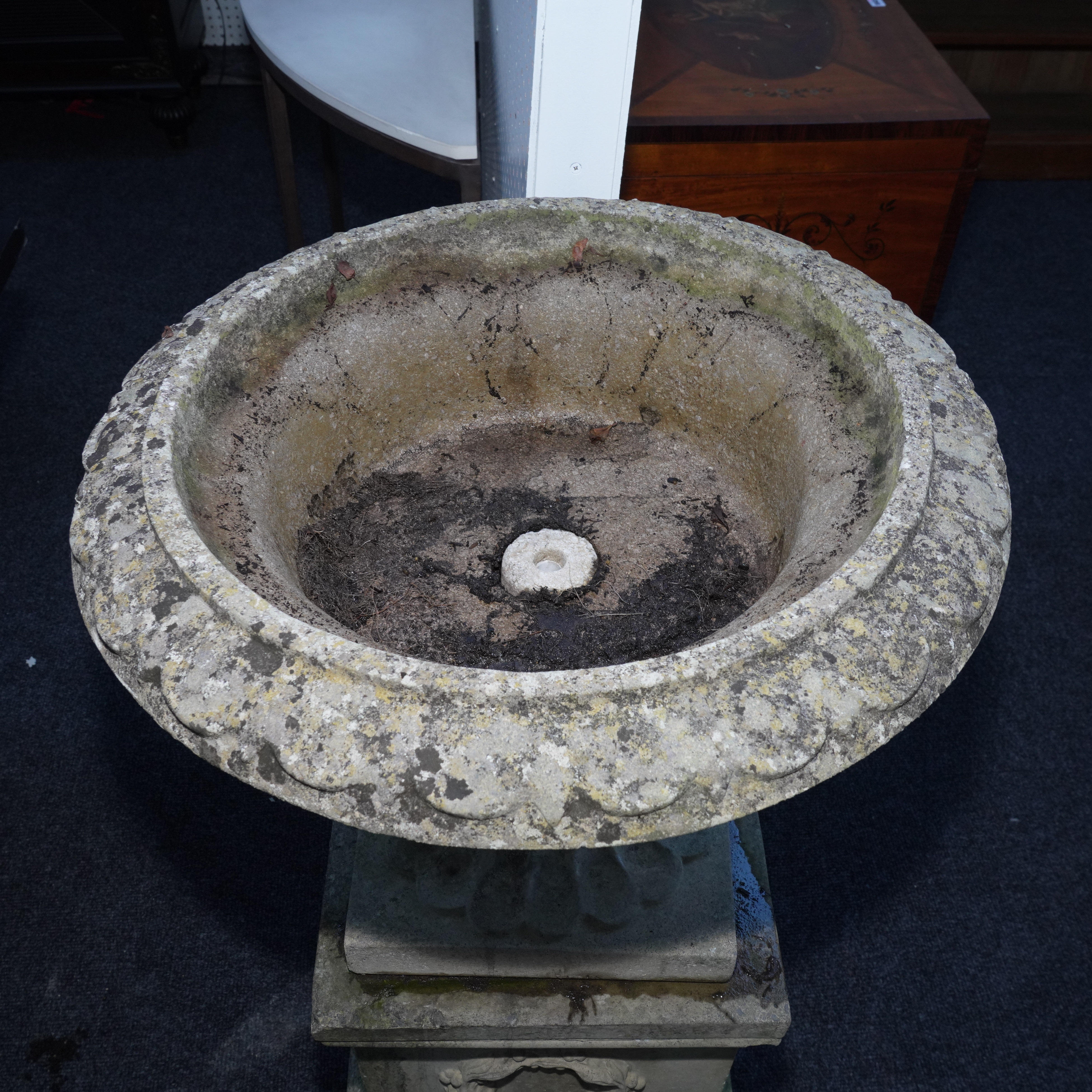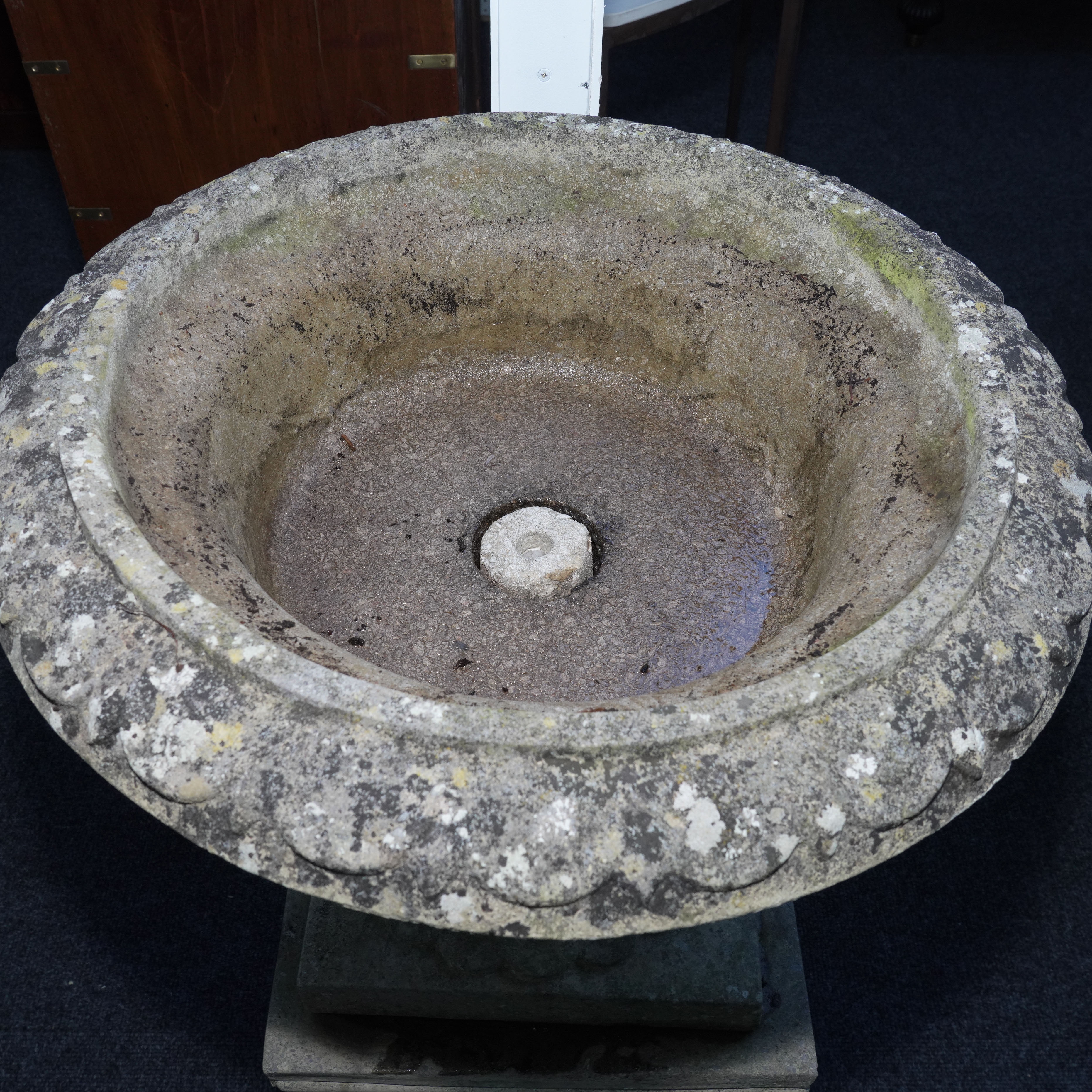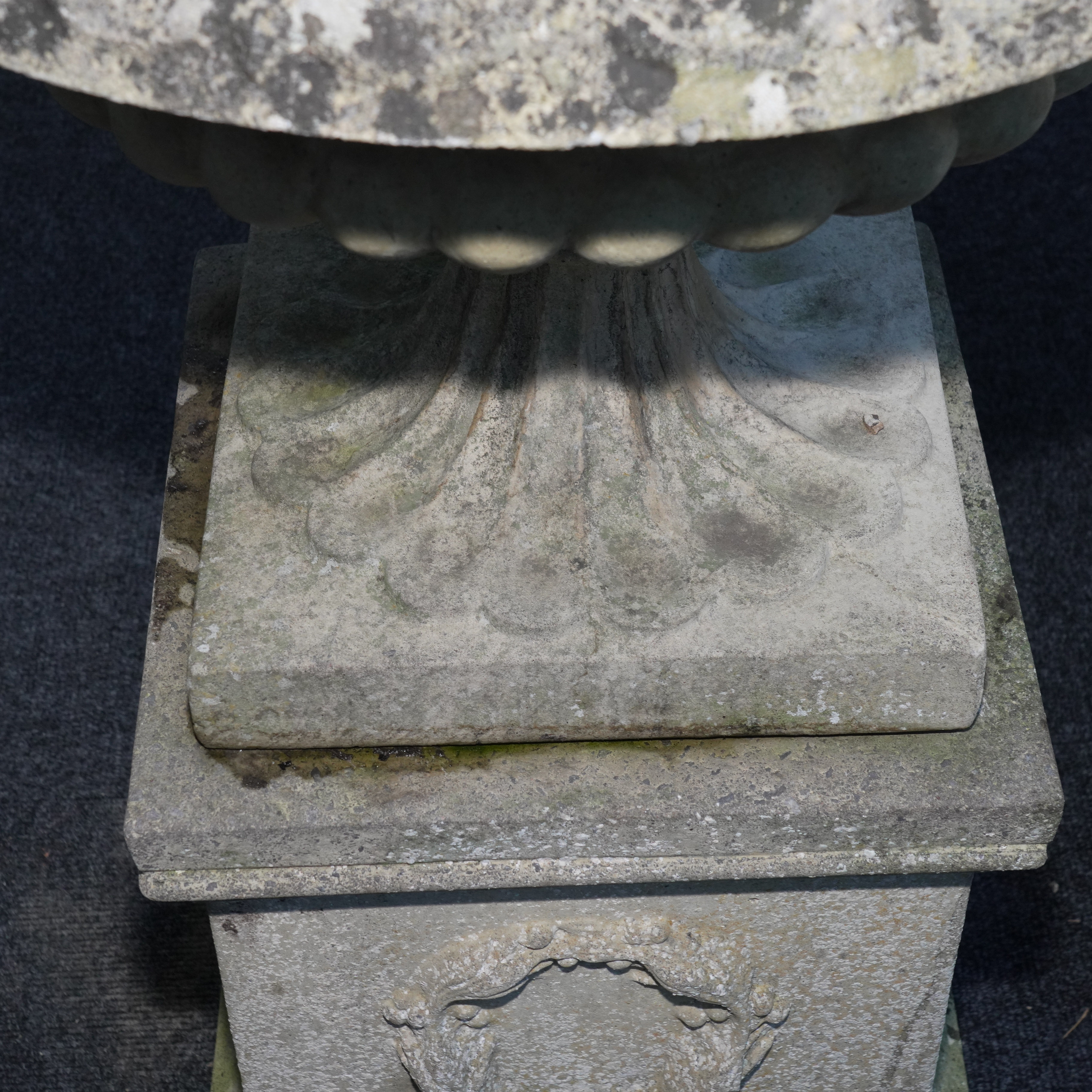 Each with semi-lobed bodies, and fluted socles on stepped square pedestals, 65cm diameter, 107cm high