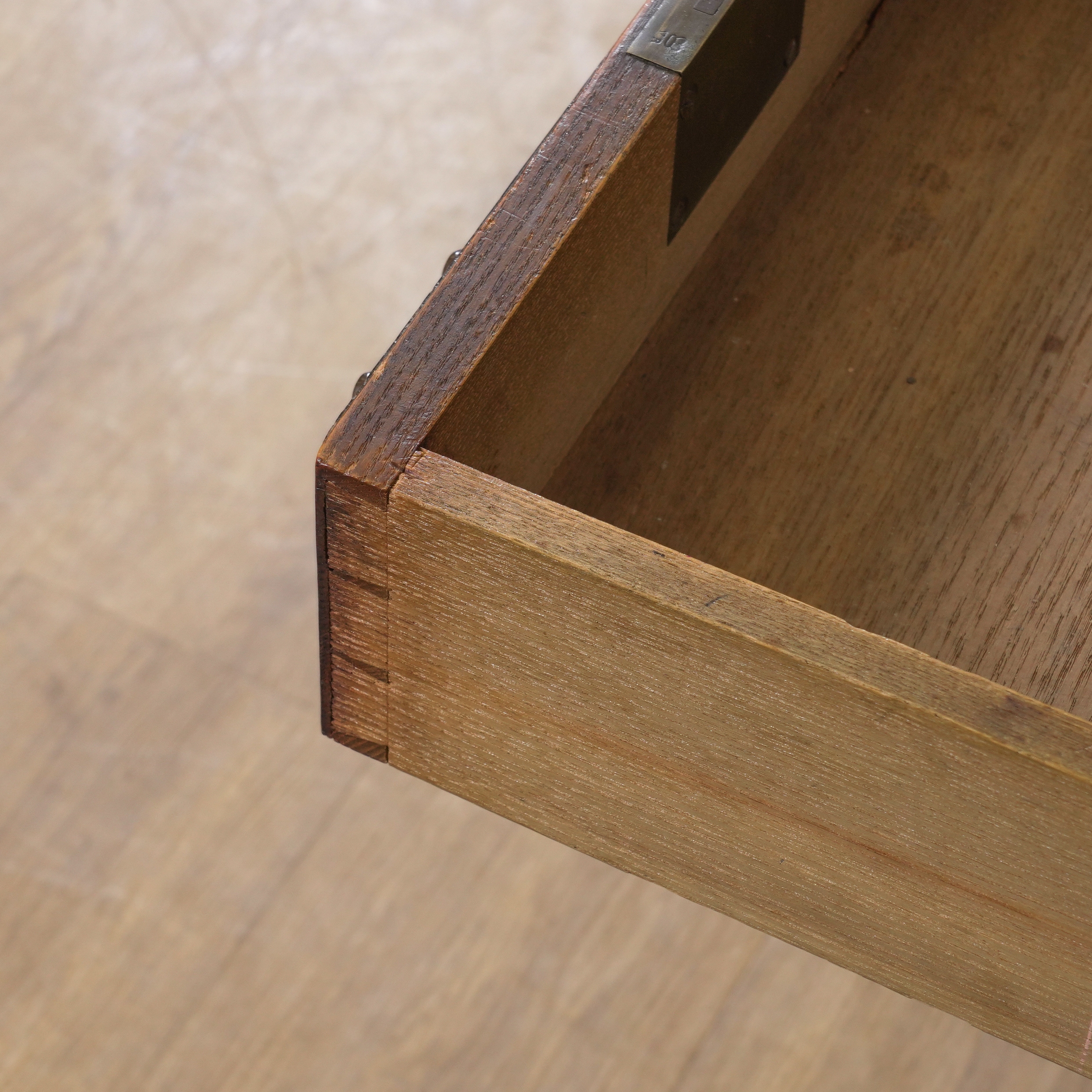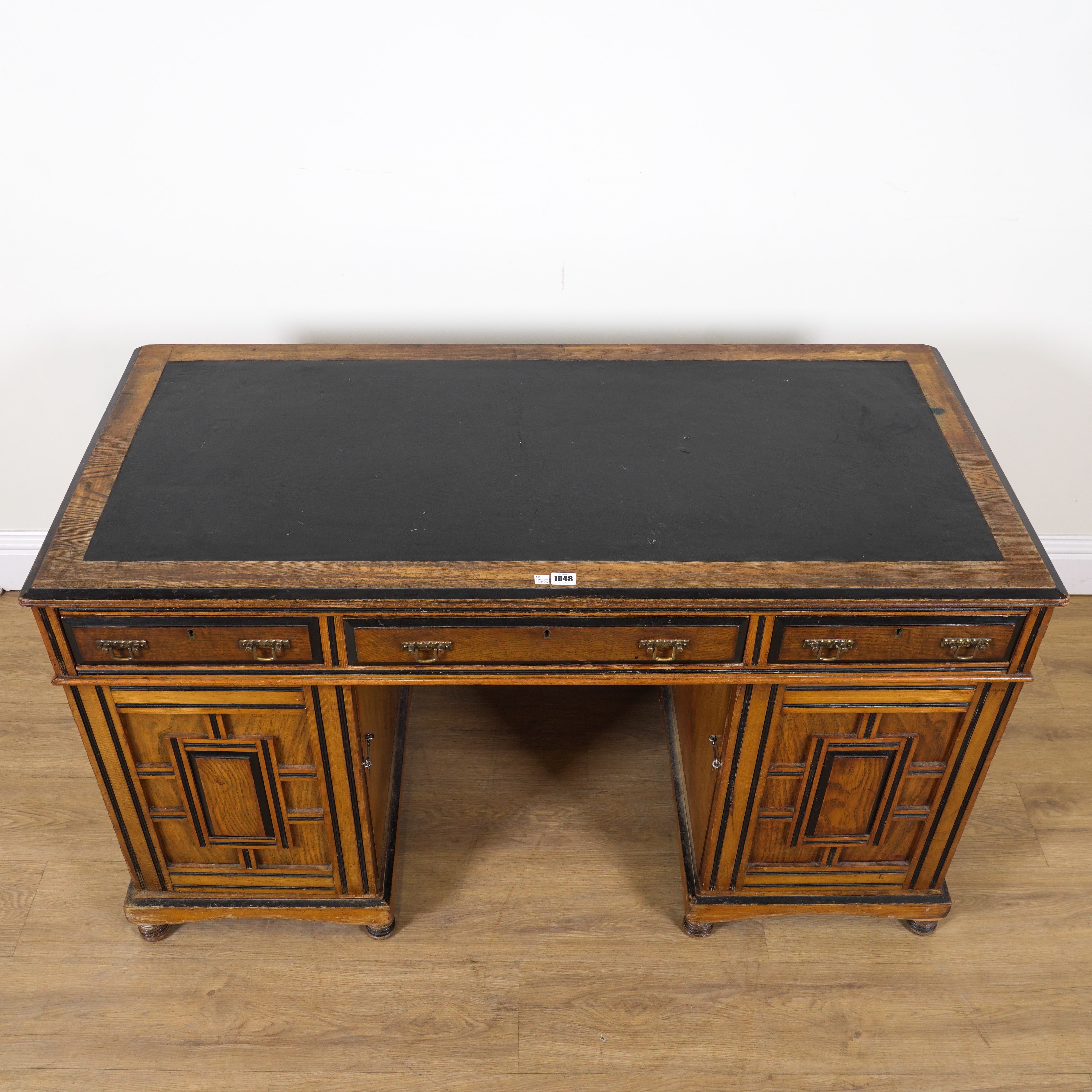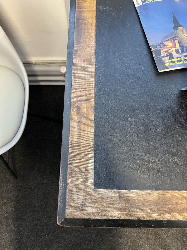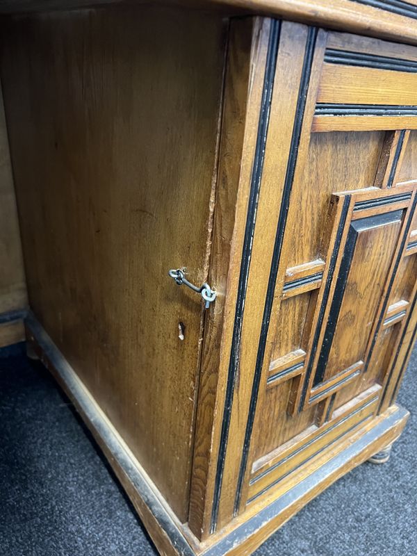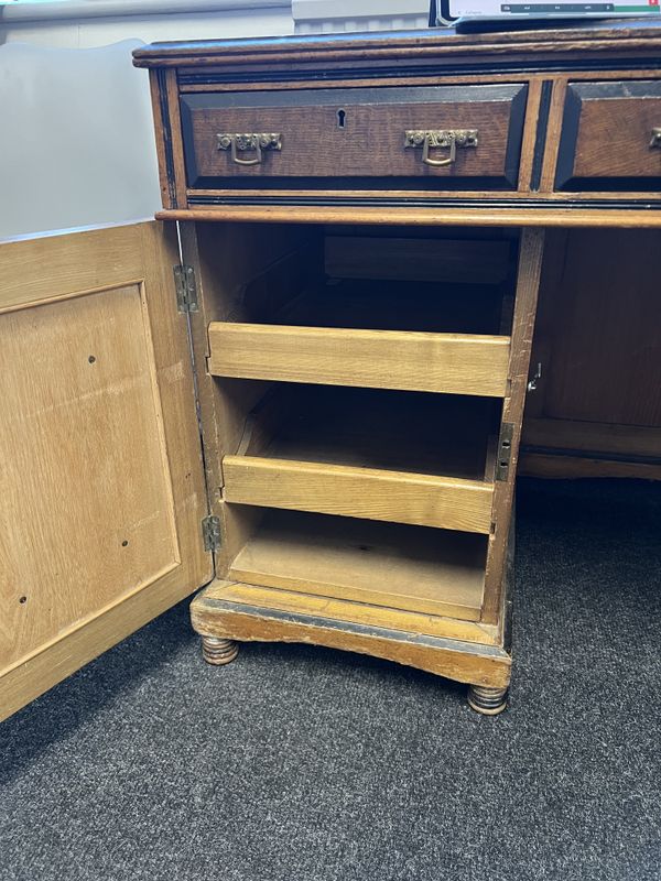 59cm high to underside of desk, old marks and scratches present, some colour variation around the top compared to the pedestals, central drawer fairly stiff, later latches fitted to the cupboards, chips and scuffs to the supports, no key present, no rips or tears to leather top, desk is in one piece and does not come apart, see images.
