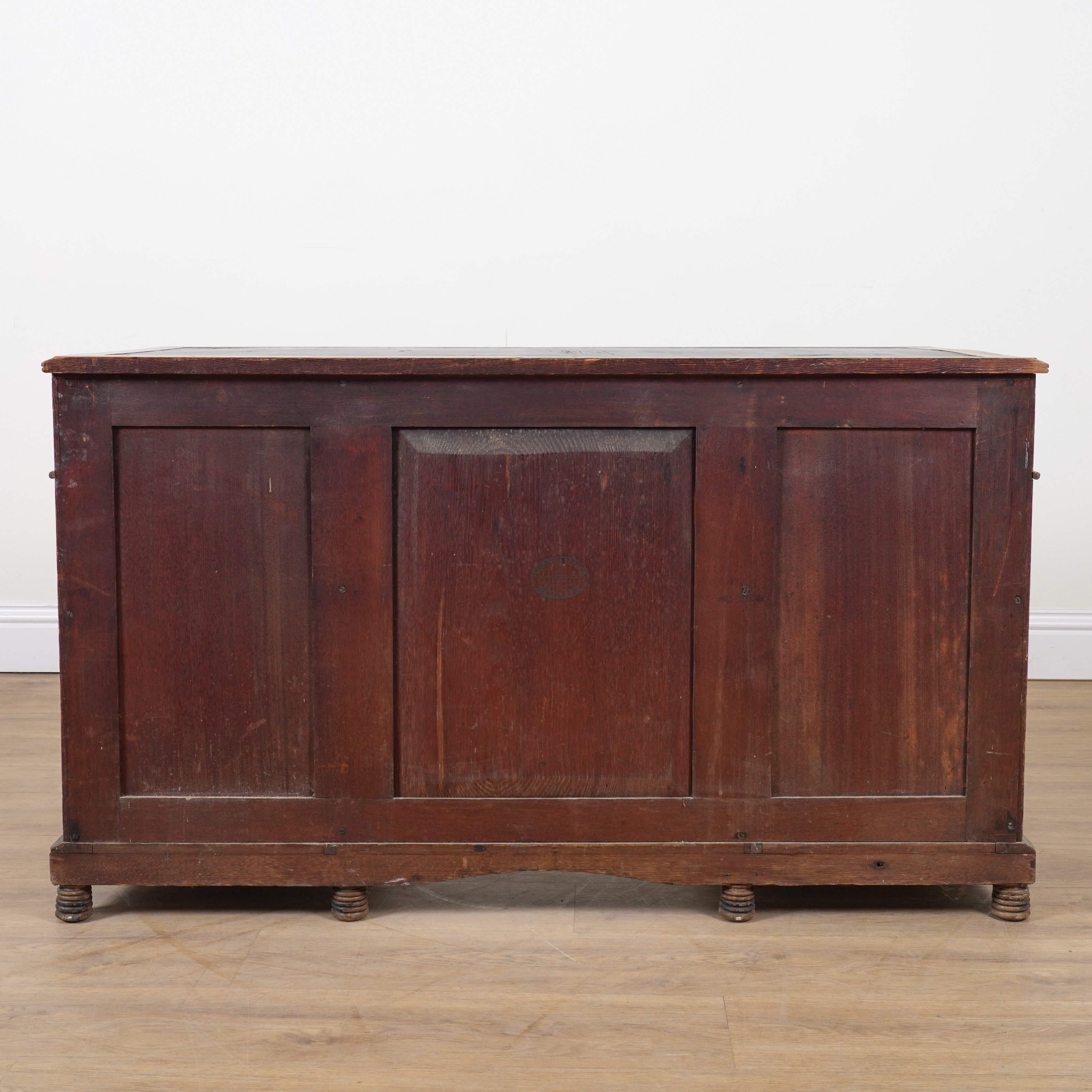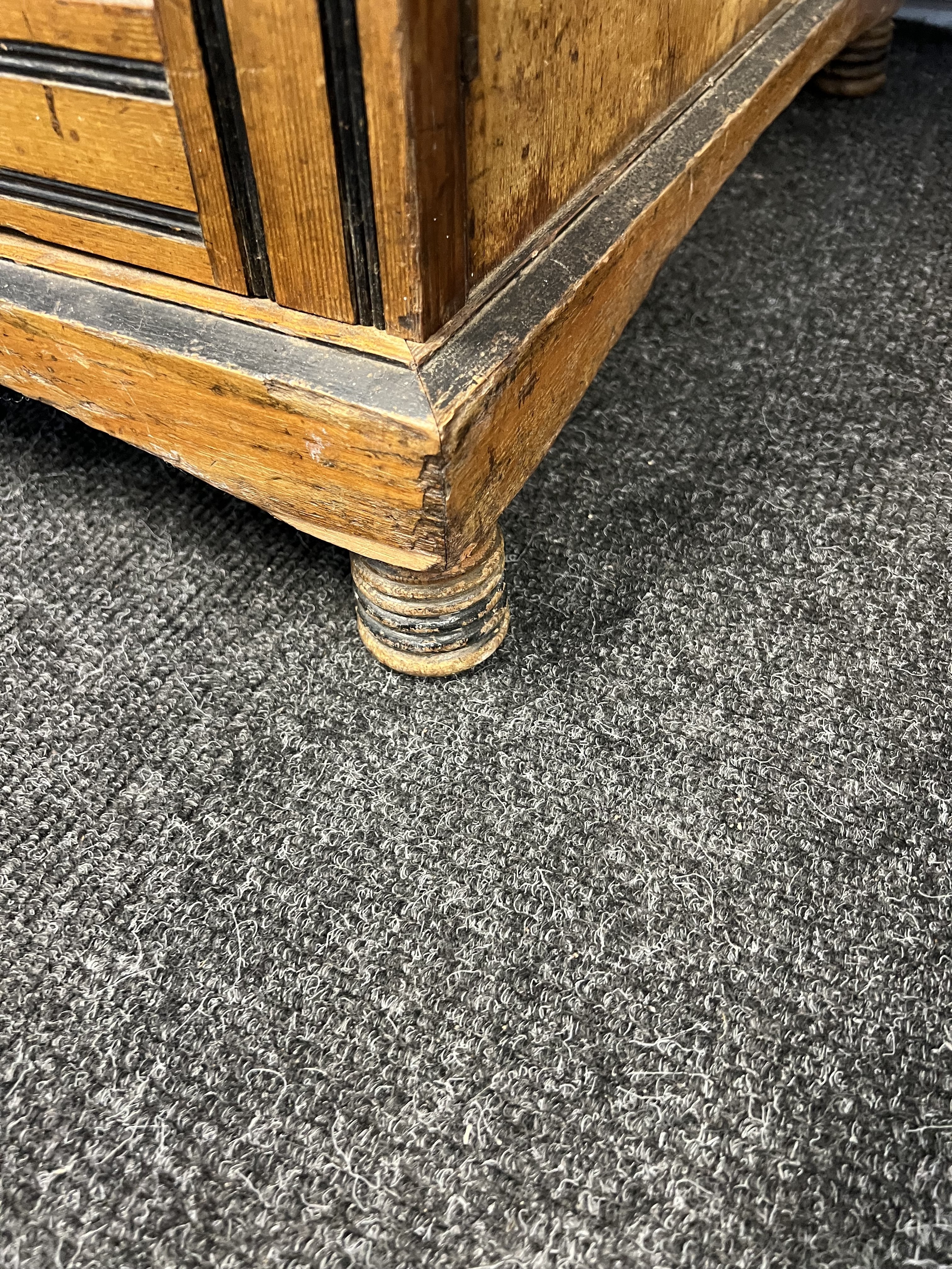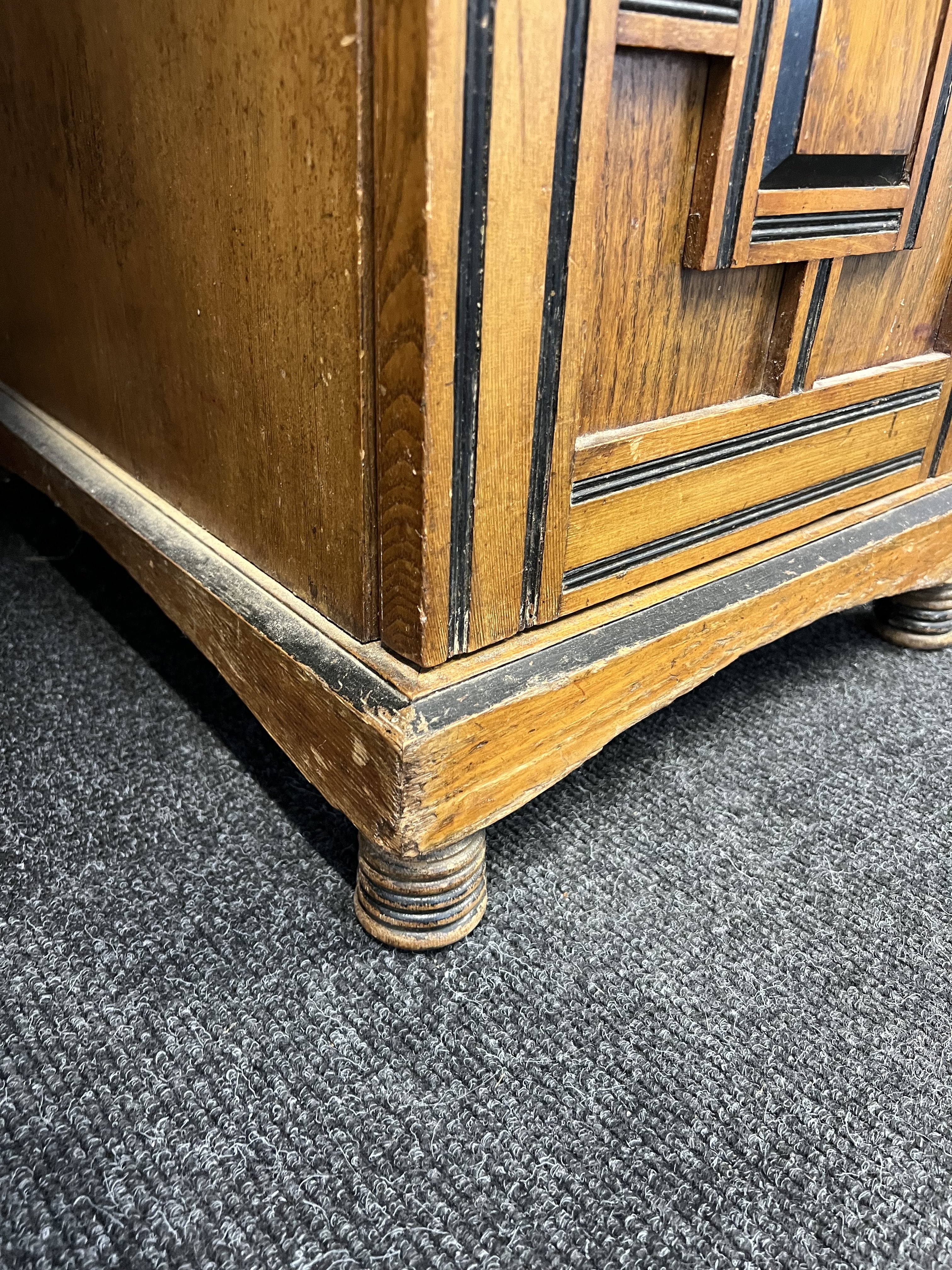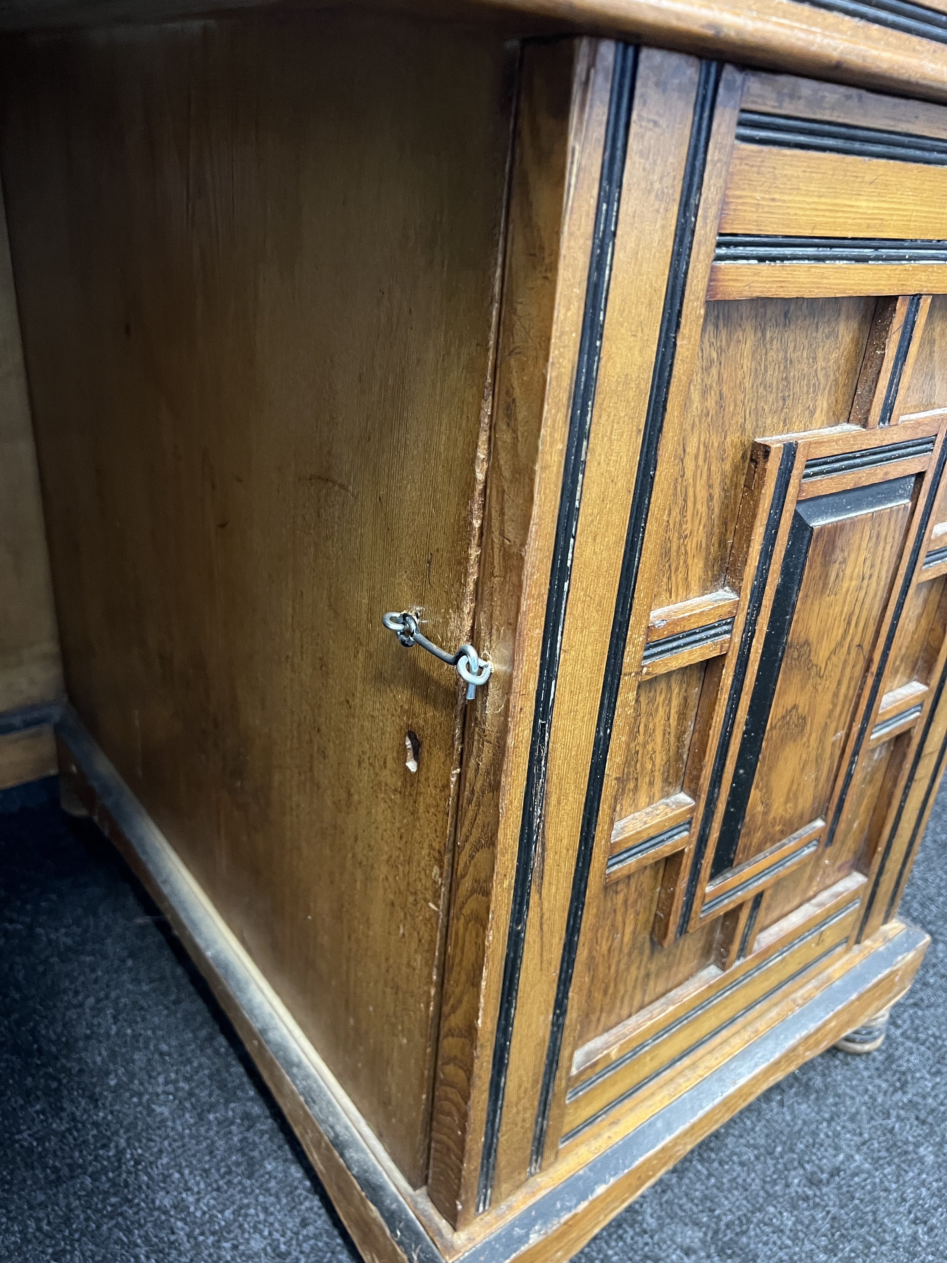 With panelled cupboard doors on ring turned supports, 130cm wide; 60cm deep; 75cm high