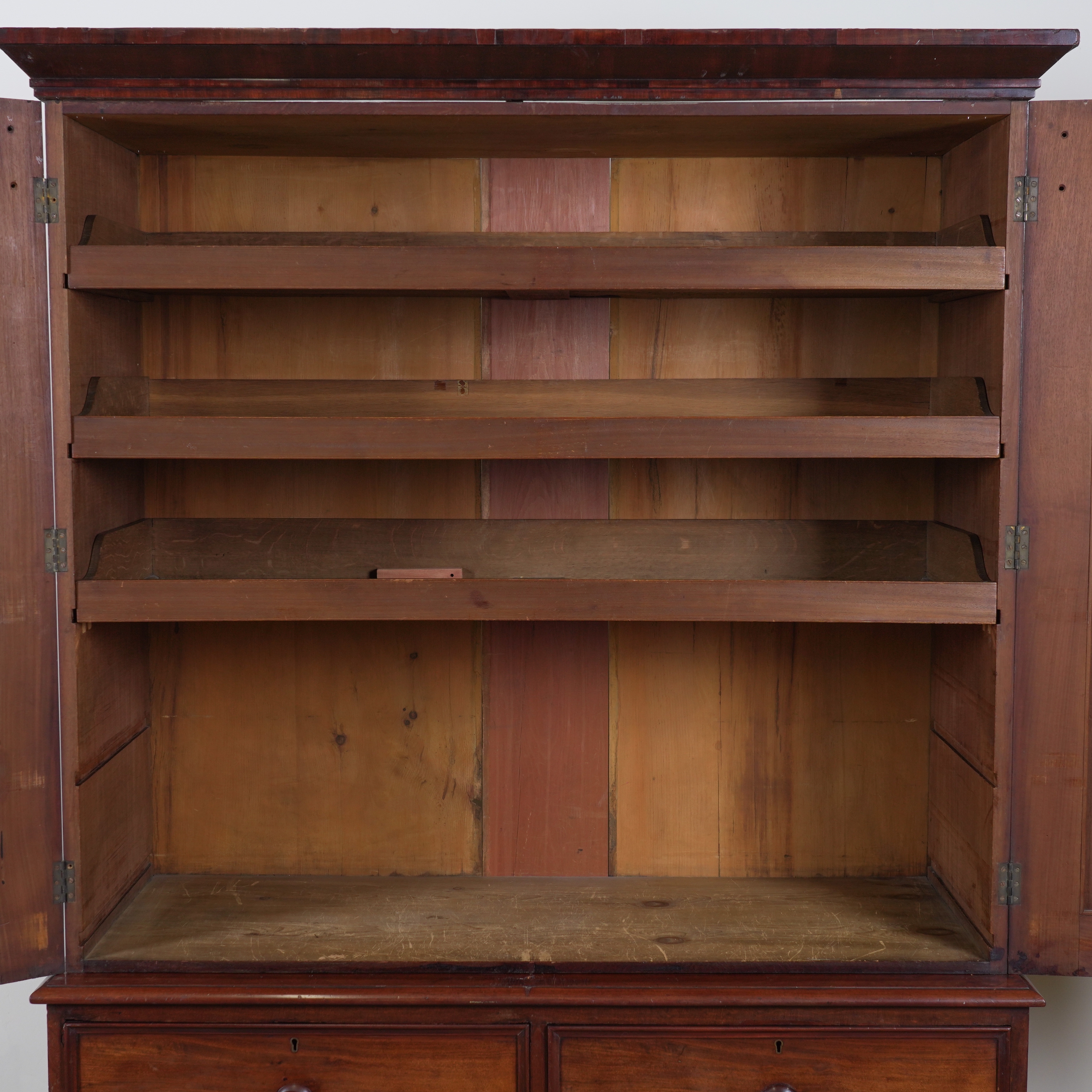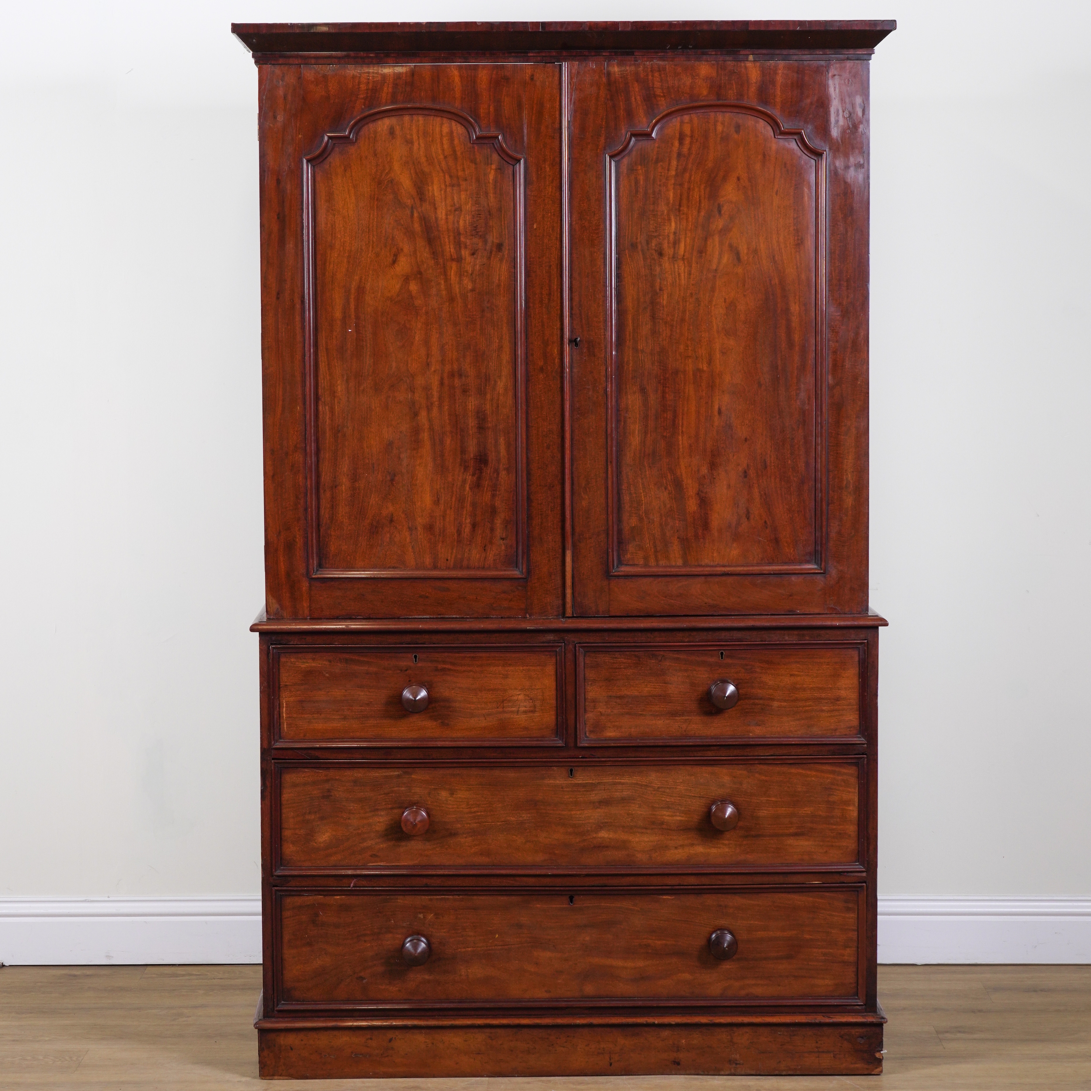 With arch moulded panelled doors over two short and two long drawers, 126cm wide; 54cm deep; 206cm high