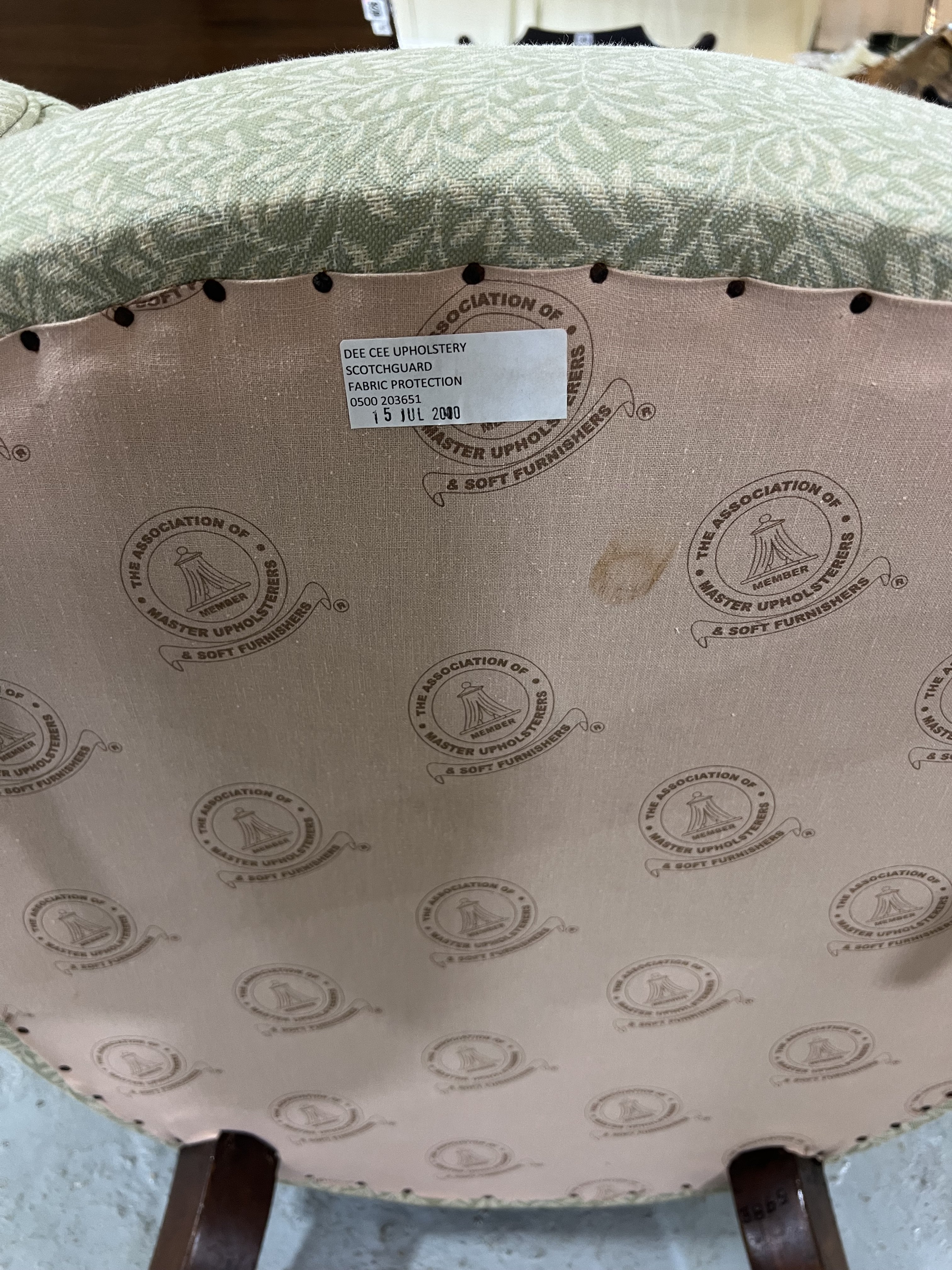 good overall condition solid frame and arms, upholstery in fair second hand condition with label to underside states 2010 it was re upholstered. marks and scratches to supports, no major losses or signs of woodworm.