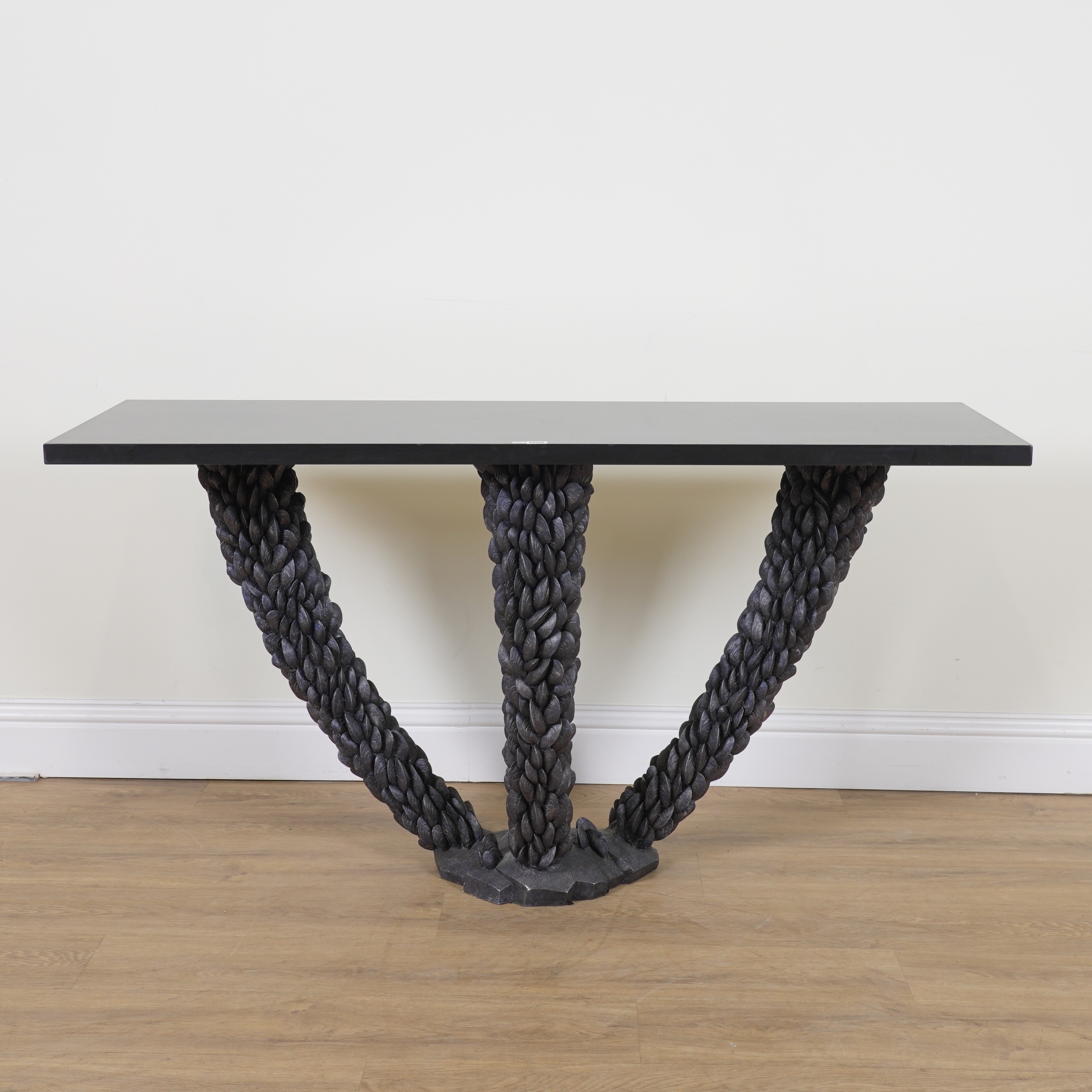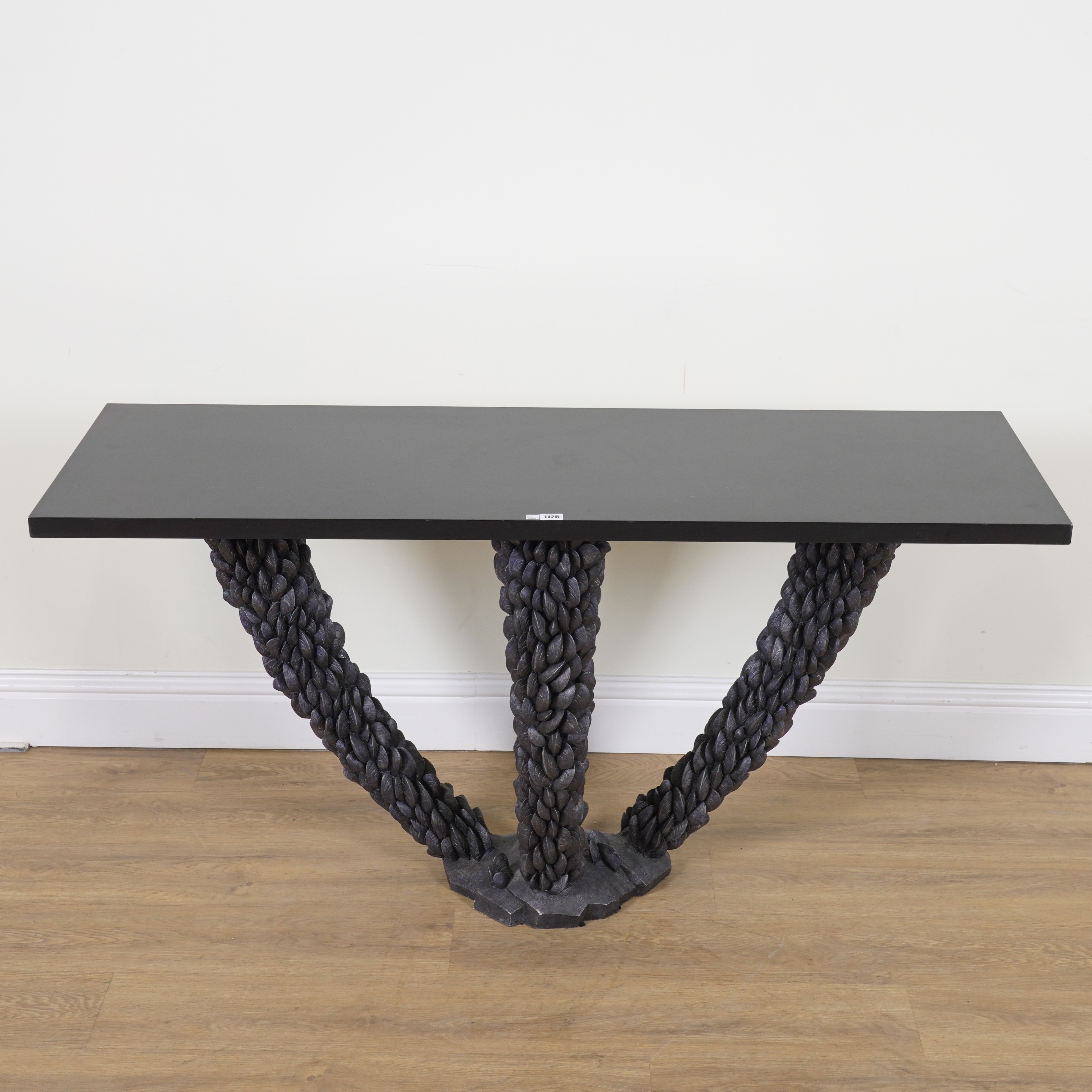 The rectangular ebonised top on three faux mussel encrusted metal supports, 142cm wide; 47cm deep; 79cm high
