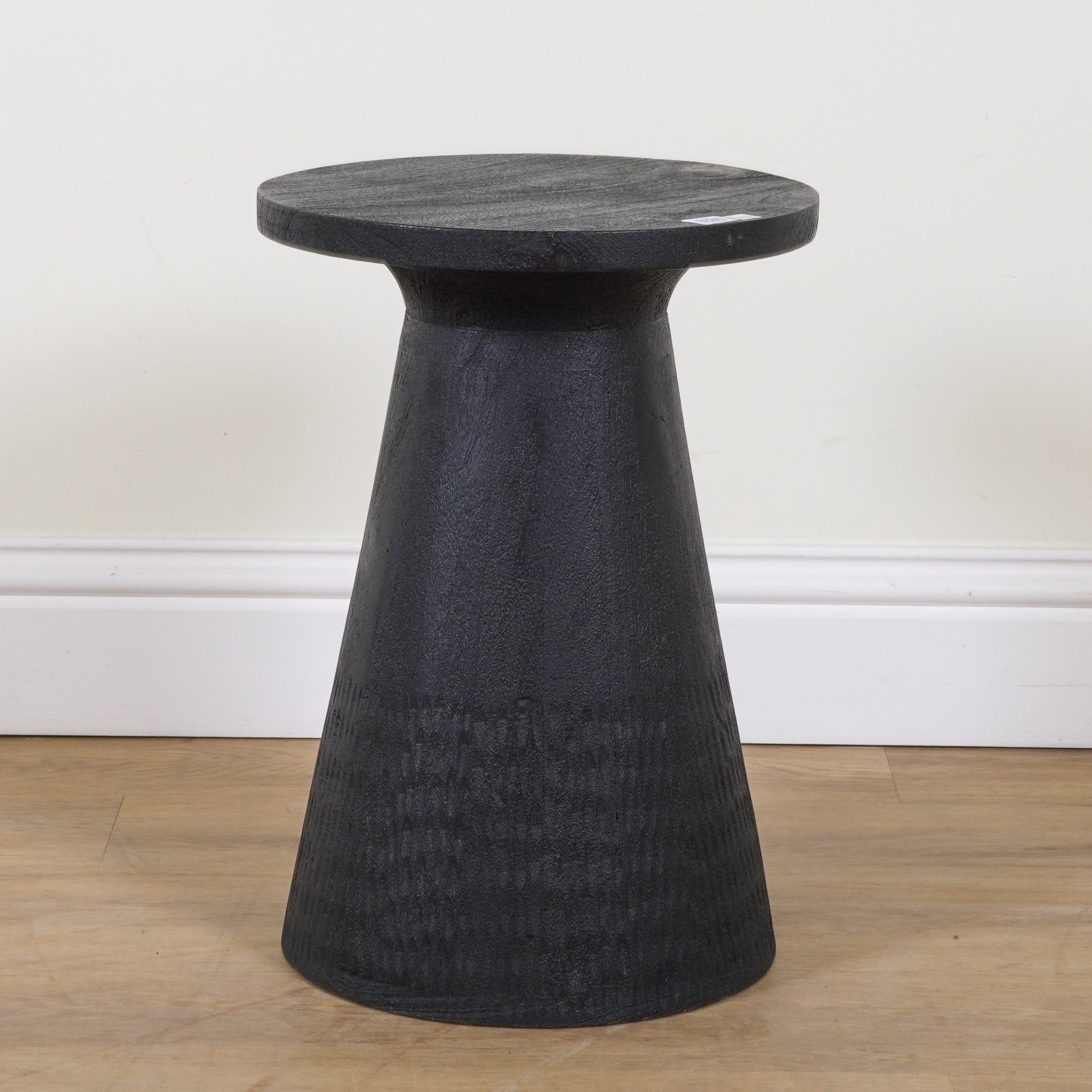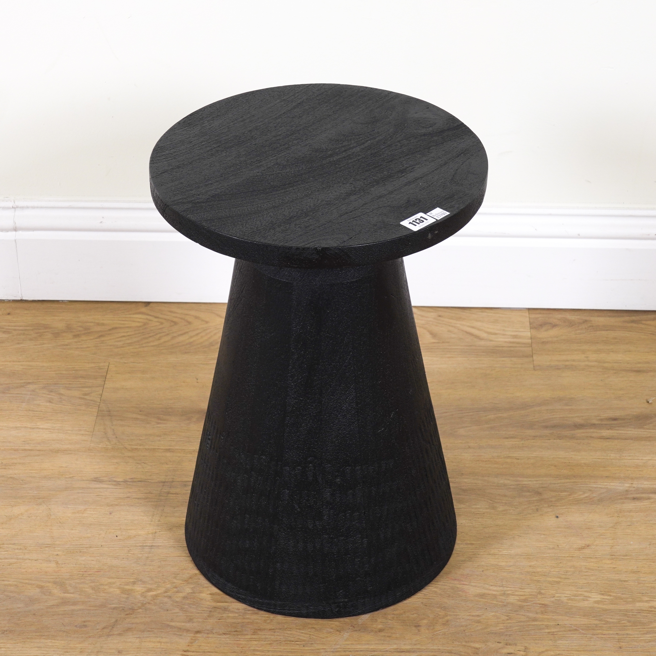 ROBERT LANGFORD, PATRICK; A FAUX OAK BLACK RESIN CIRCULAR SIDE TABLE
