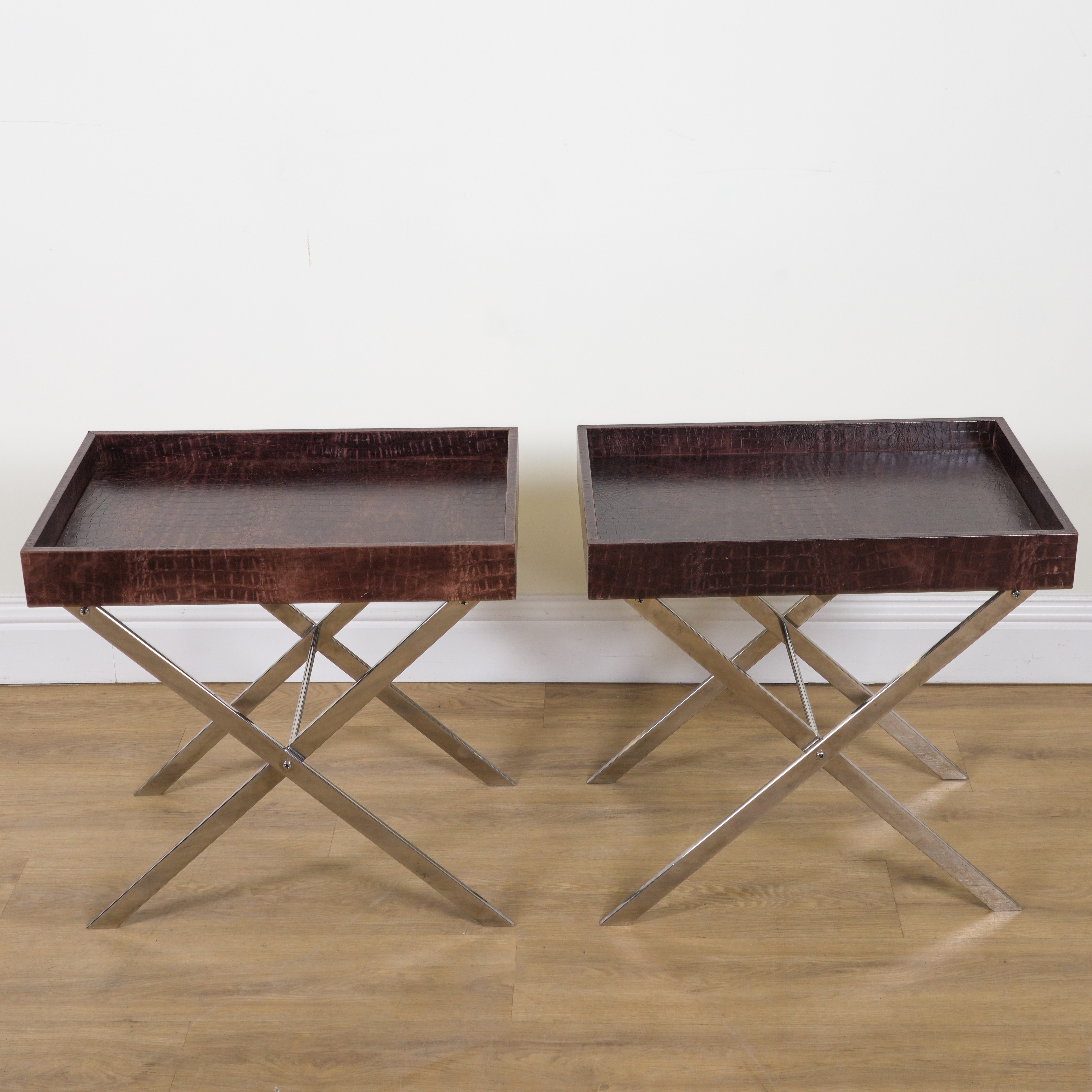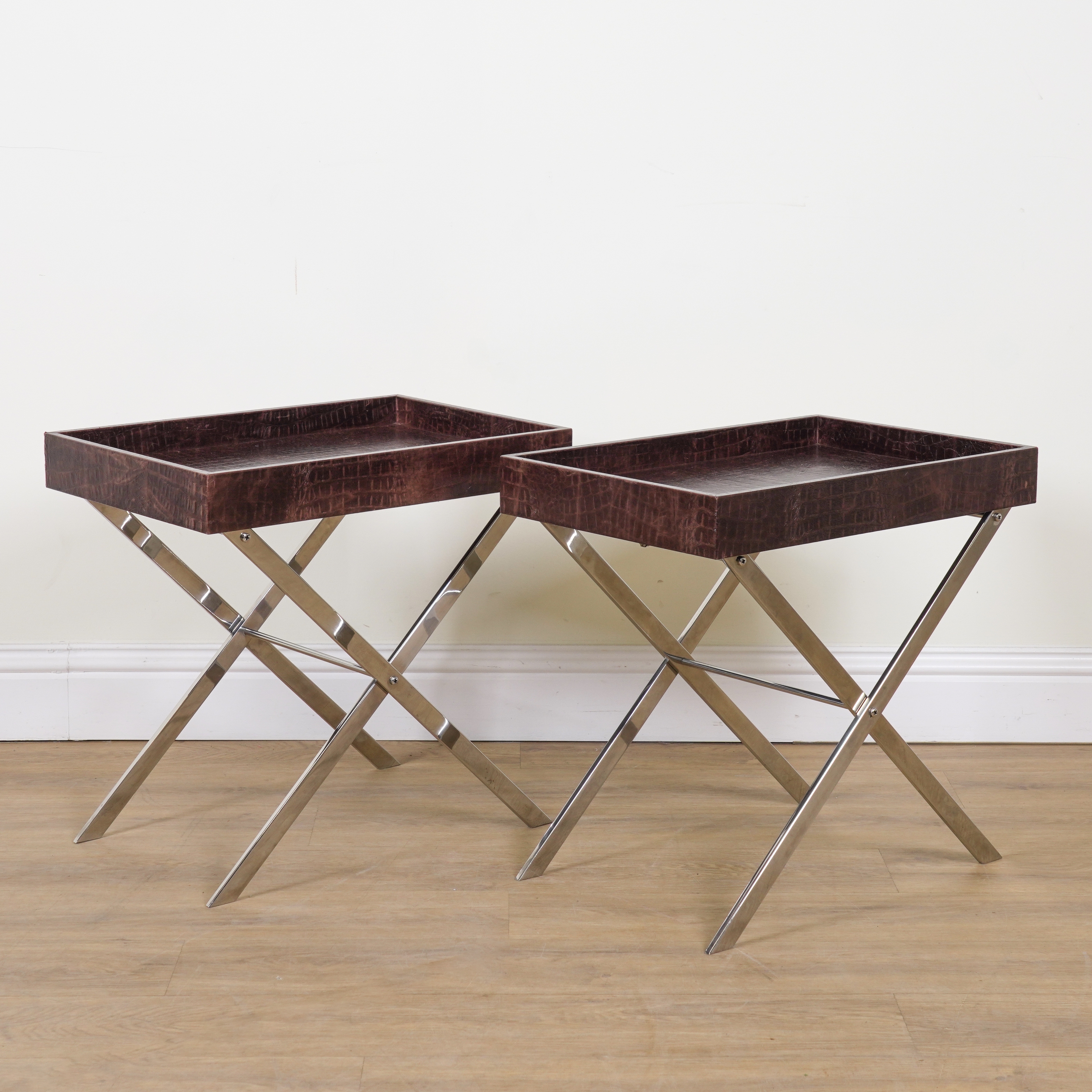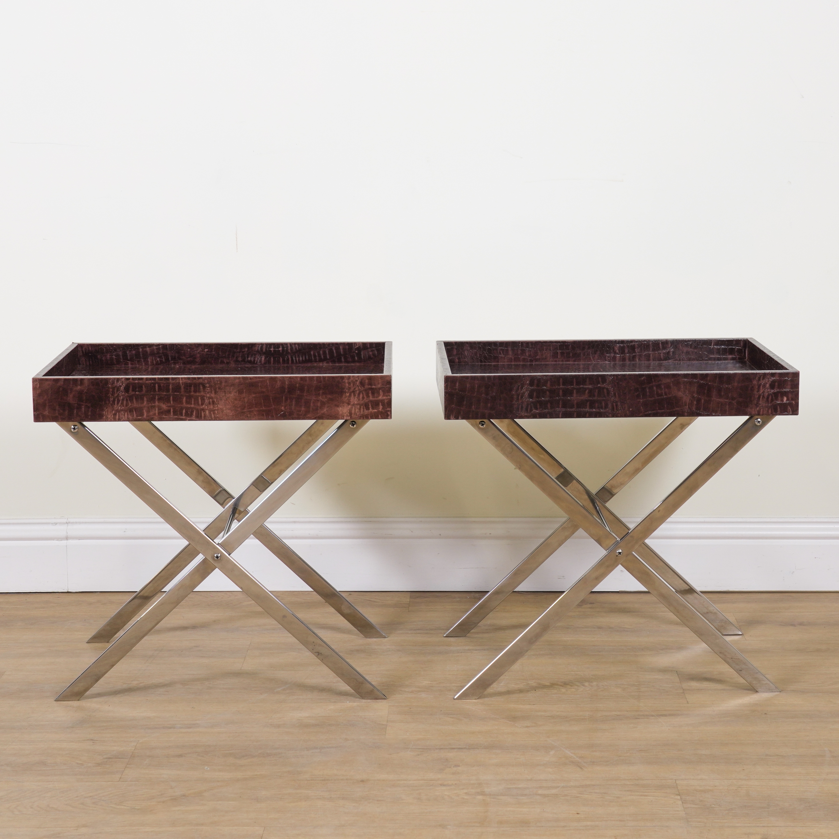 A PAIR OF FAUX ALLIGATOR SKIN UPHOLSTERED GALLERIED BUTLER'S TRAY TABLES (2)