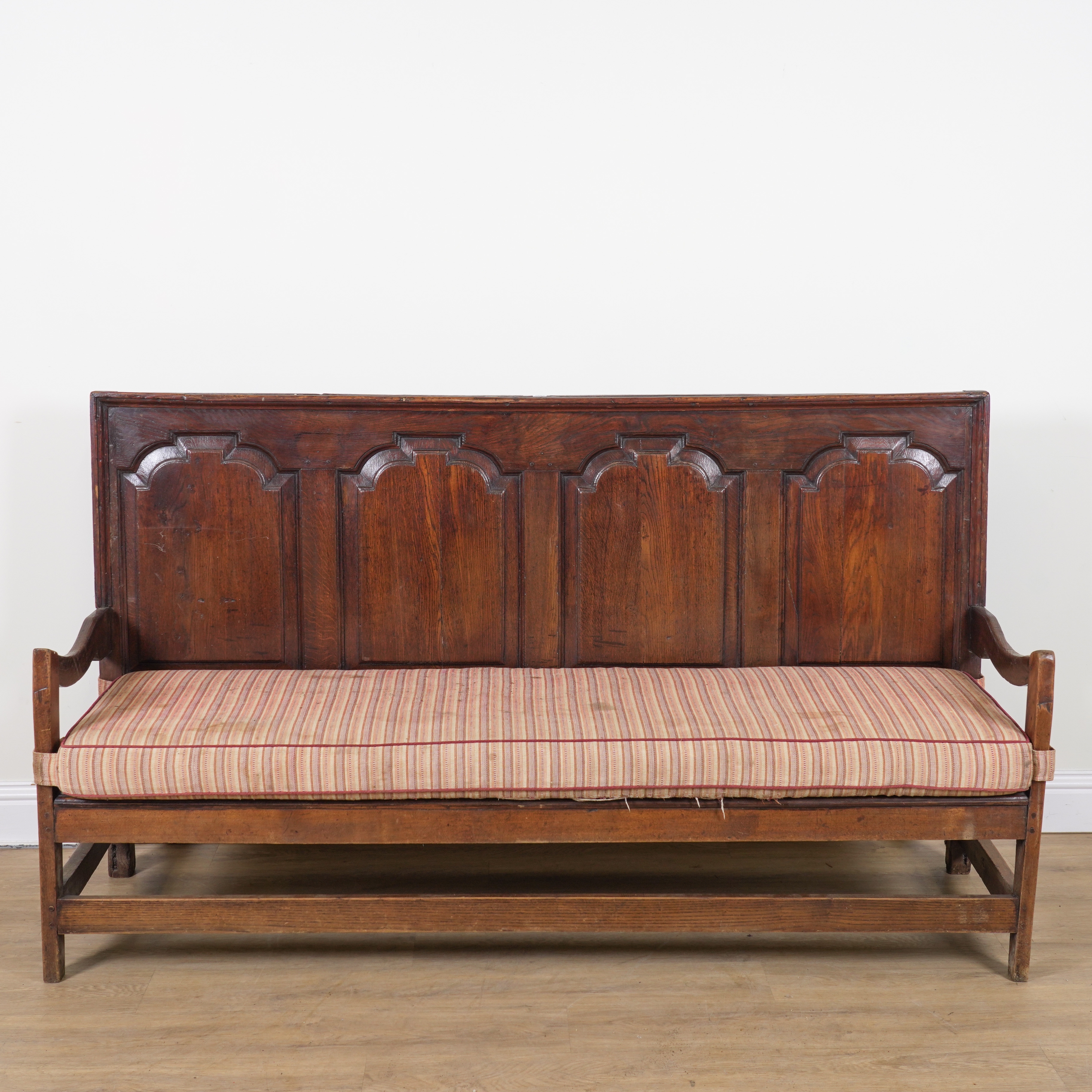 AN 18TH CENTURY AND LATER OAK PANELLED BACK OPEN ARM SETTLE