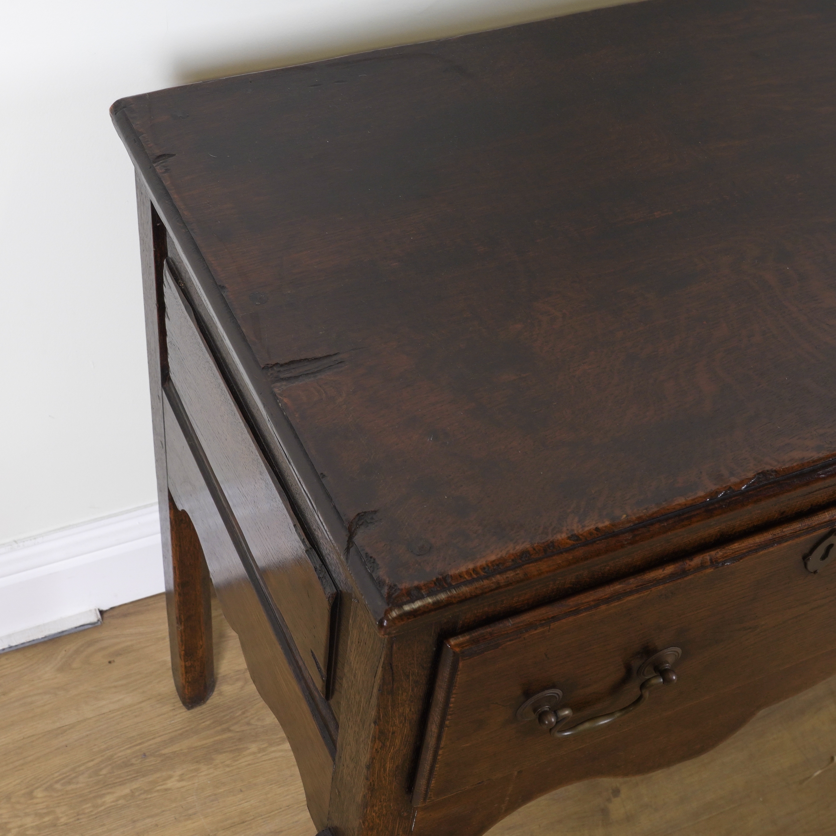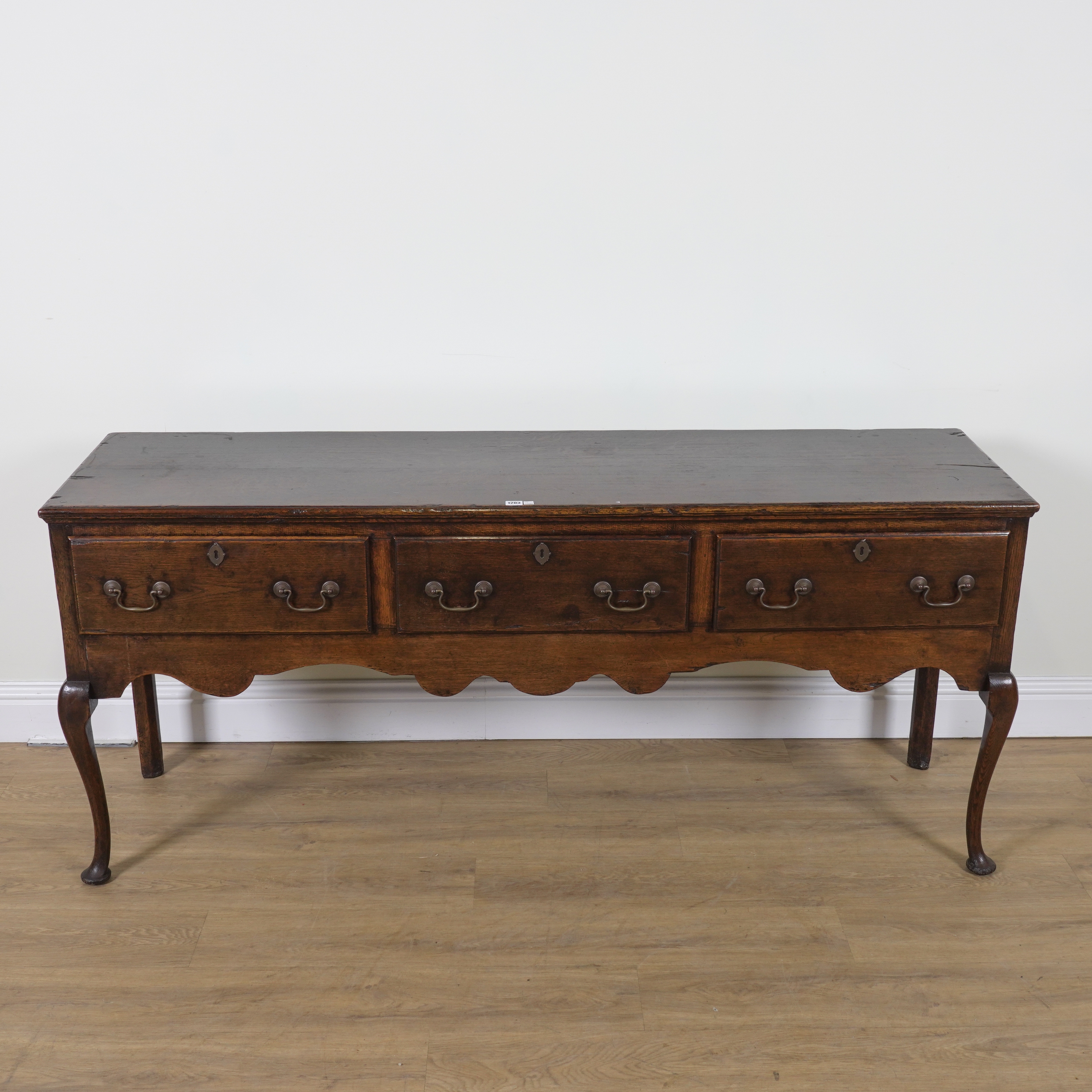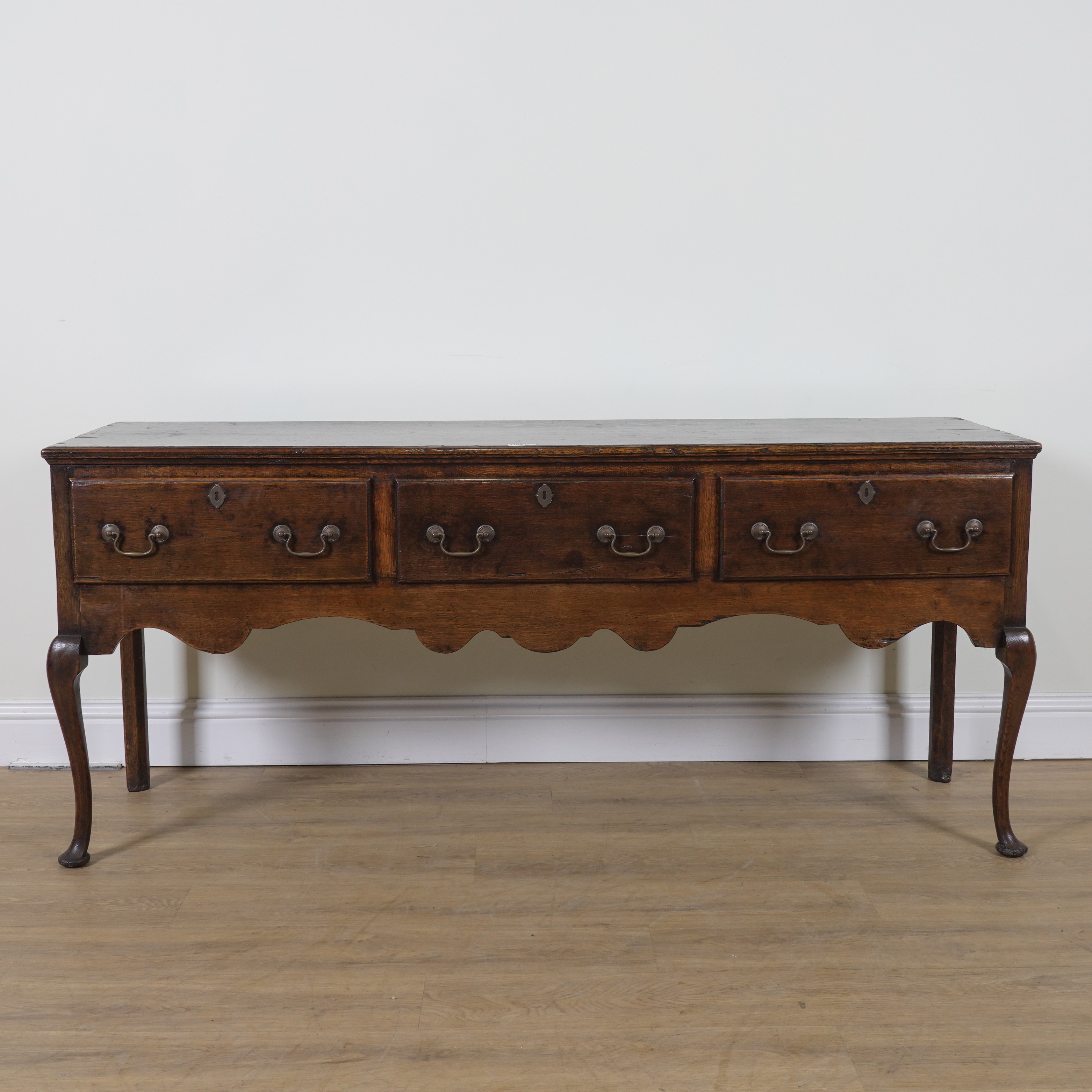 20th century, with three drawers on cabriole supports, 183cm wide; 49cm deep; 80cm high